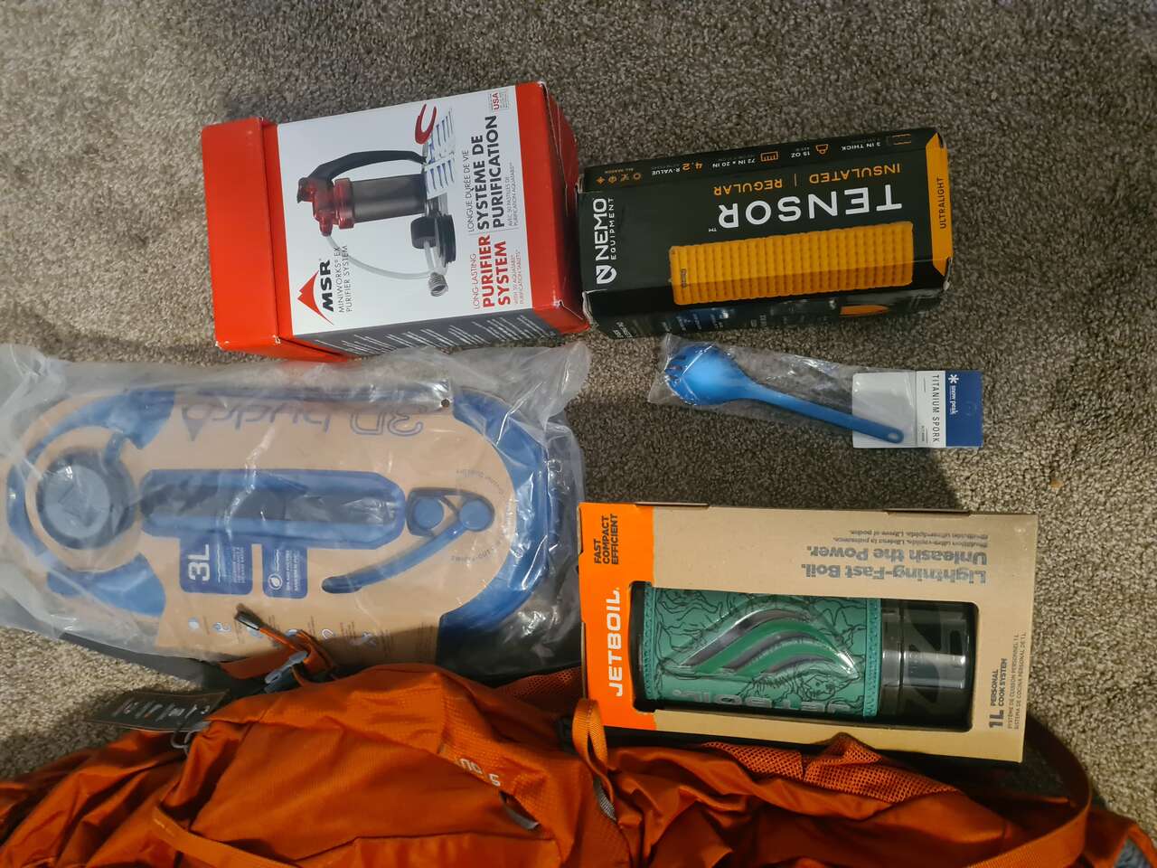VenmoNice complete backpacking set up to get someone started. Gregory Stout 70 mens pack w/ hydration bladder. Nemo Disco +15 sleeping bag & Nemo Tensor insulated pad. Big Agnes Blacktail 2p tent. MSR Miniworks EX Water purifier, Jetboil Flash coking system w/ Snowpeak titanium spork.