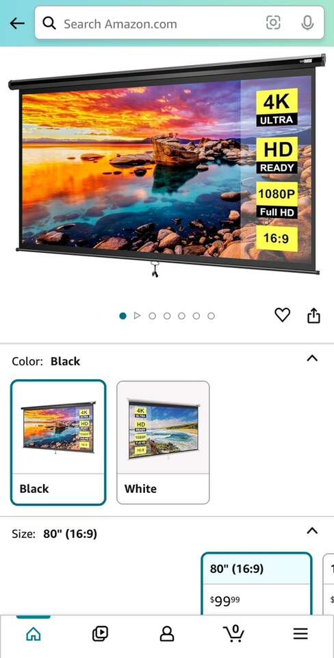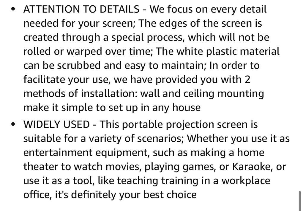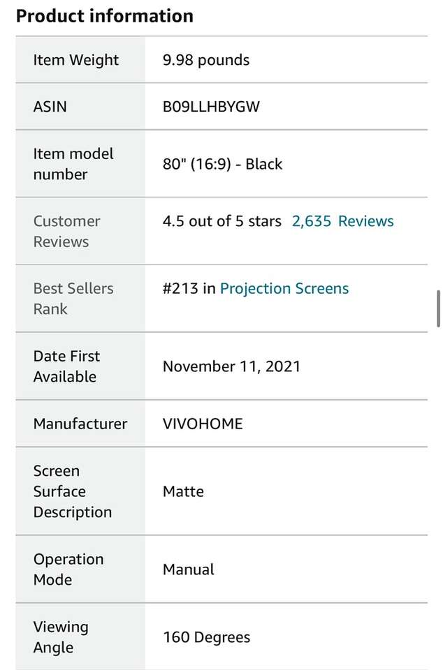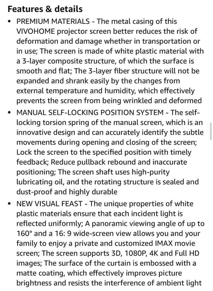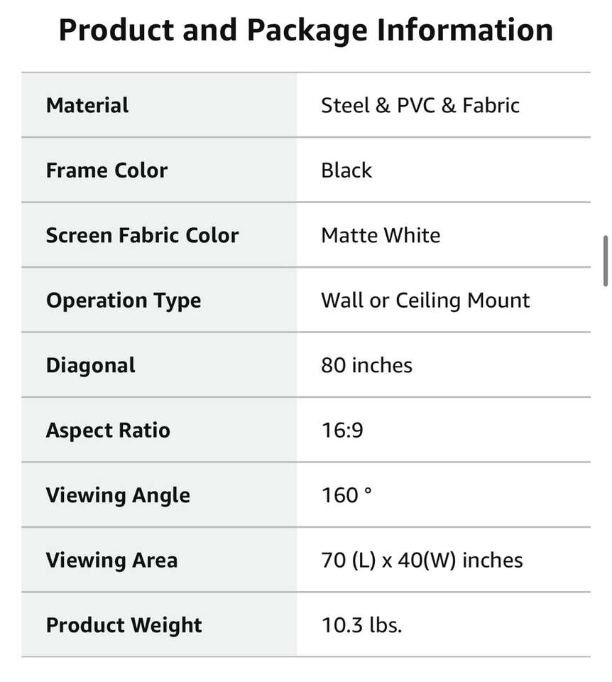 Description- 80” Diagonal manual pull down, retractable 4K ultra, HD ready, 1080P, 16:9 ceiling or wall mounted projector screen with black frame and white screen. See photos for more product information and specifications.