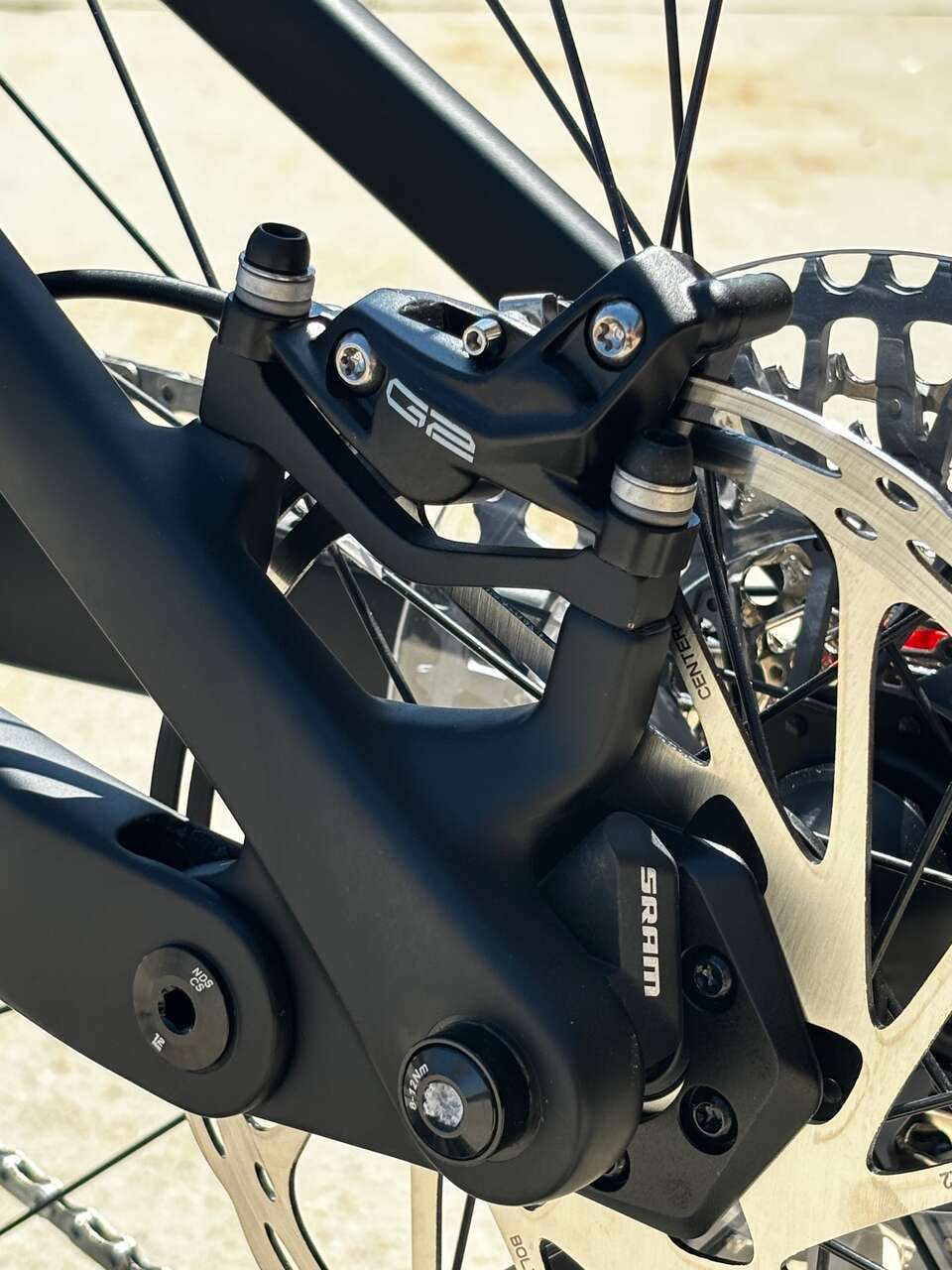 **Built for Performance:**Boasting a robust carbon frame with Boost spacing and 160mm of travel, the ECC 5 is agile yet sturdy. It rolls on Maxxis tires, ensuring superior grip with every turn. SRAM G2 RS 4-piston brakes with 220/200mm rotors provide reliable stopping power in all conditions.