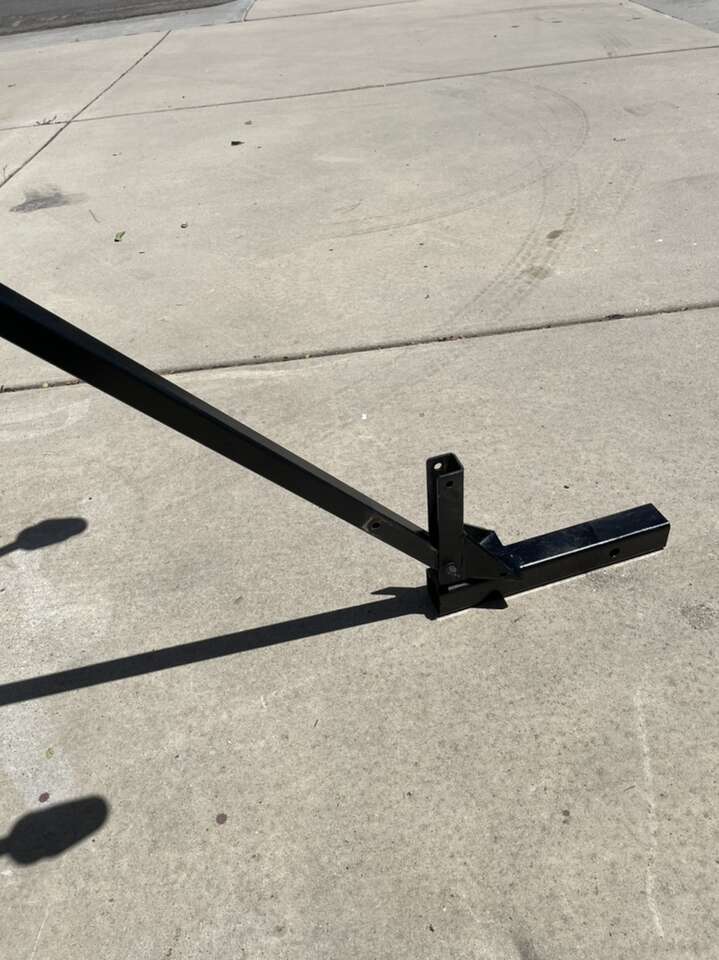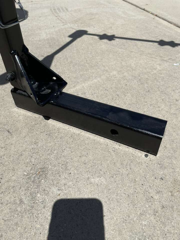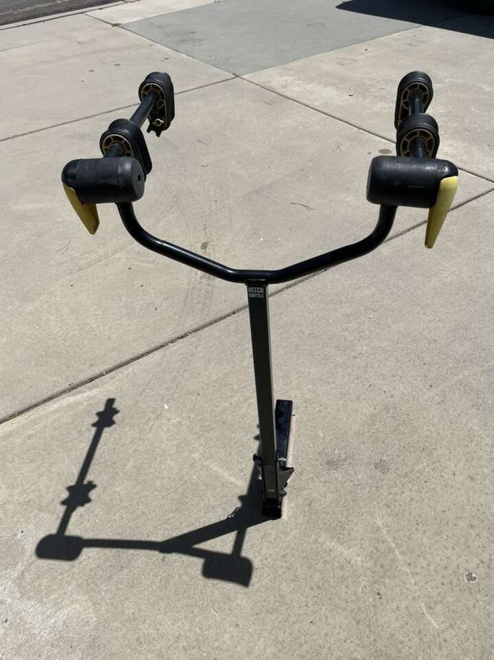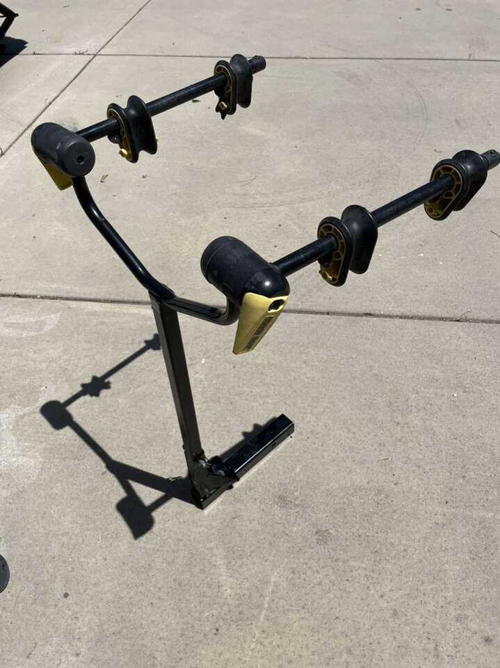 Fits into a 2 inch receiver. It tilts to open the trunk. Holds 2 bikes. In excellent condition. It needs new straps (like bungee cords, Velcro, or strapping material).