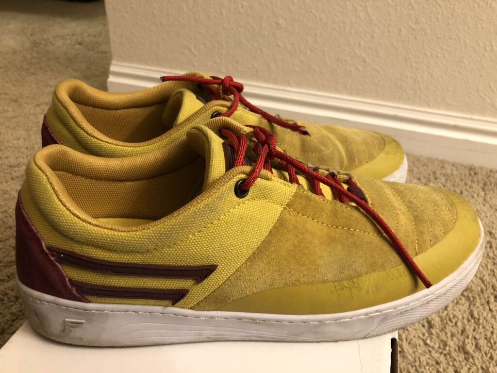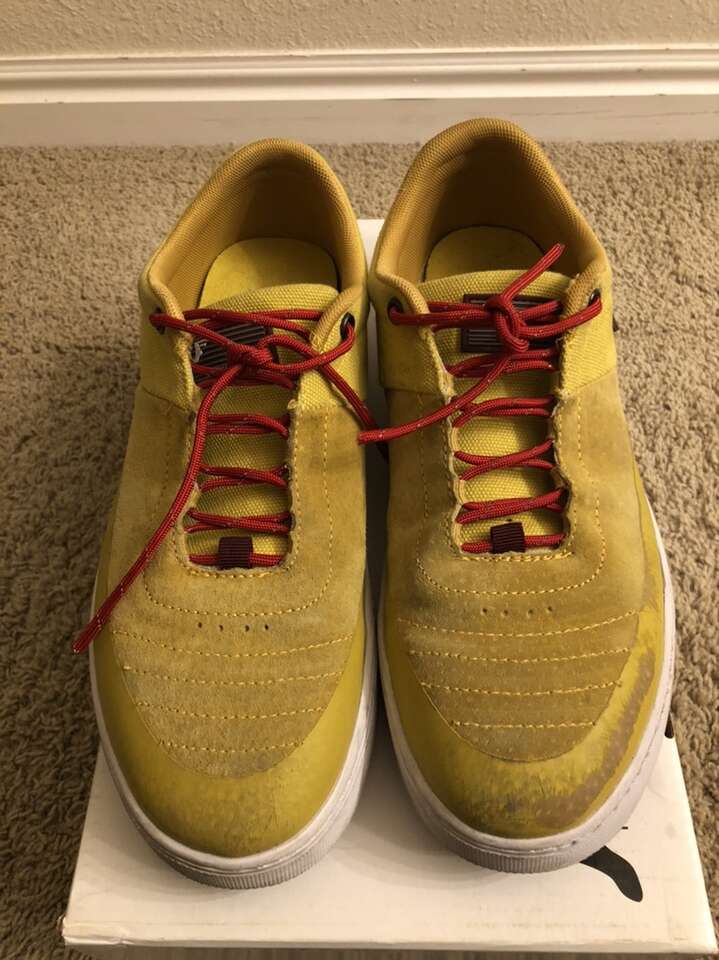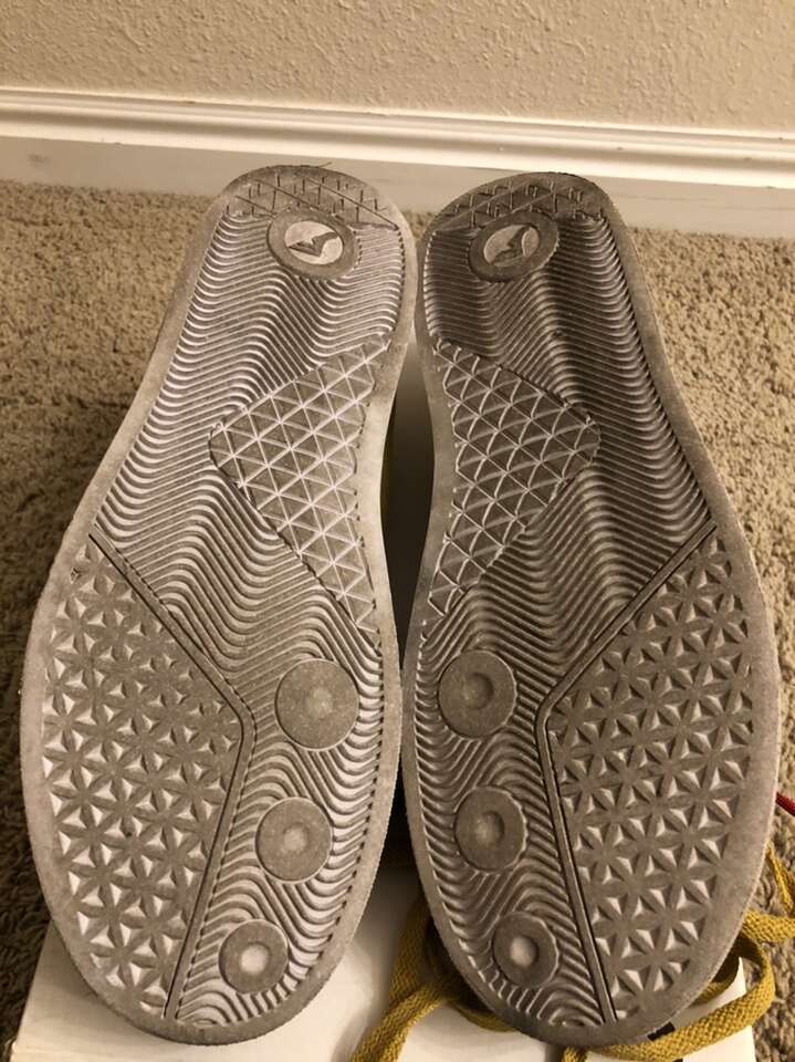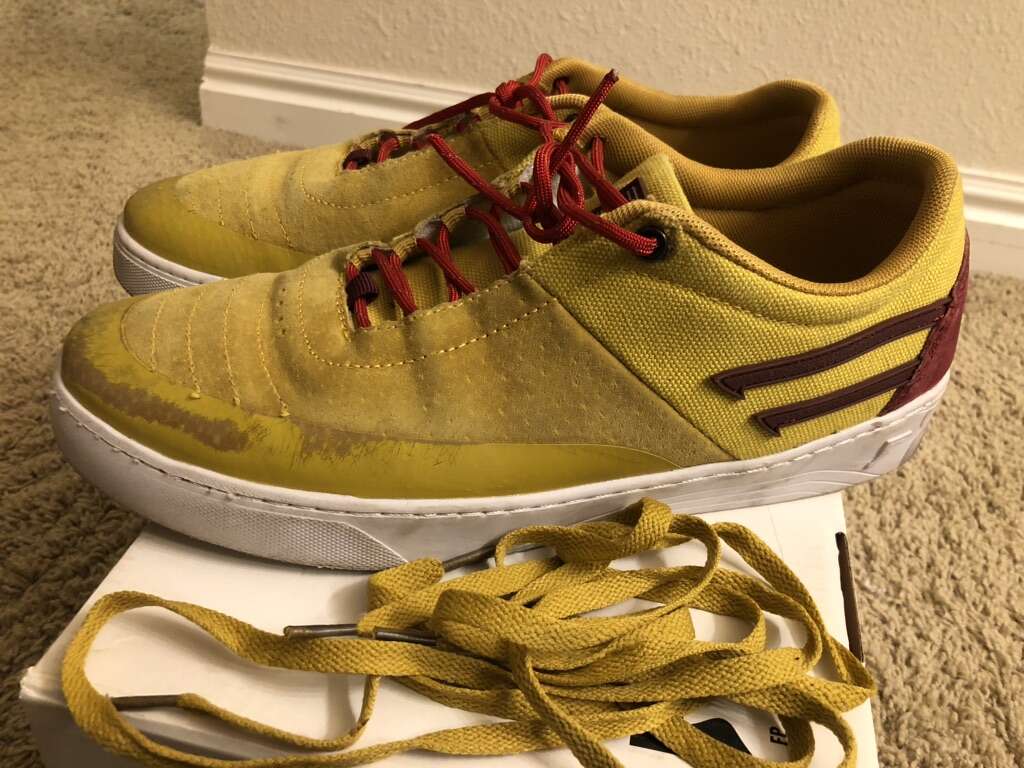 Fp Footwear Sentinel Size 10 Mustard skate shoes. These have been used only a few days and are still in decent shape. Selling because they are too big for me. They currently have paracord as laces and i added an additional lace hole at the top and put eyelets in the holes but wasn't done perfectly and isn't that pretty but they do work. Also comes with the original laces as well. I skate regular so basically all of the wear is on the left shoe but it is pretty minimal and there should be lots of life left in these shoes. Any questions feel free to ask.