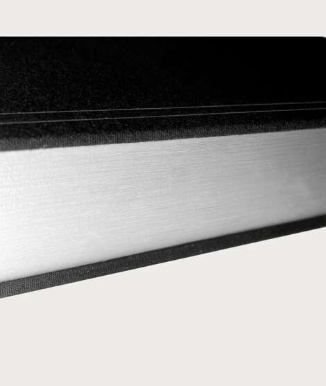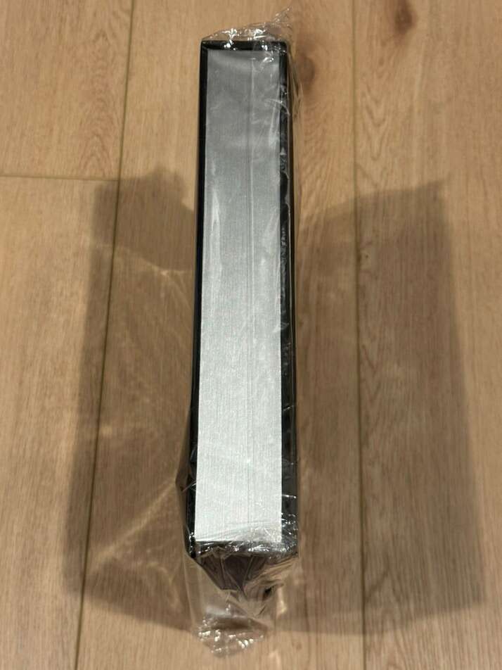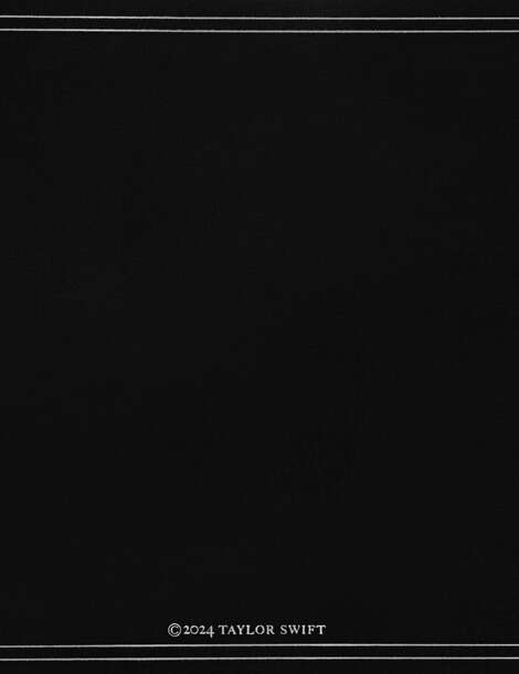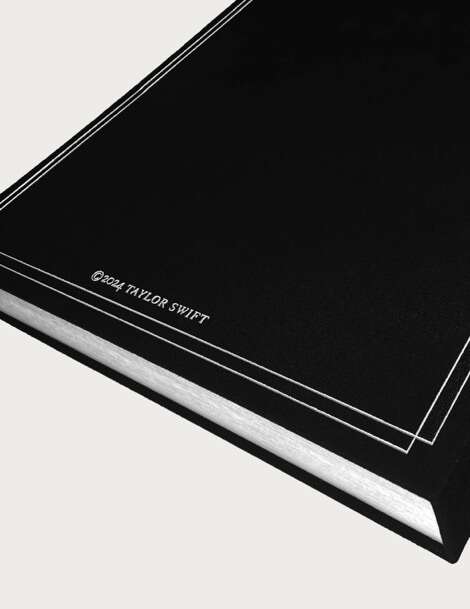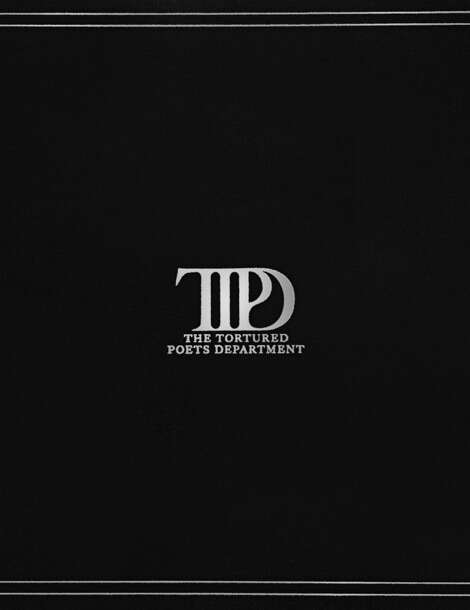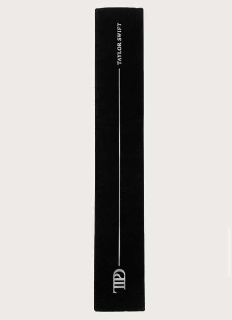 Black vinyl display case featuring metallic silver double line border design, TTPD album logo, and The Tortured Poets Department embossed on front with TTPD album logo, line design, and Taylor Swift embossed on side and ©2024 Taylor Swift with metallic silver double line border design embossed on back.
