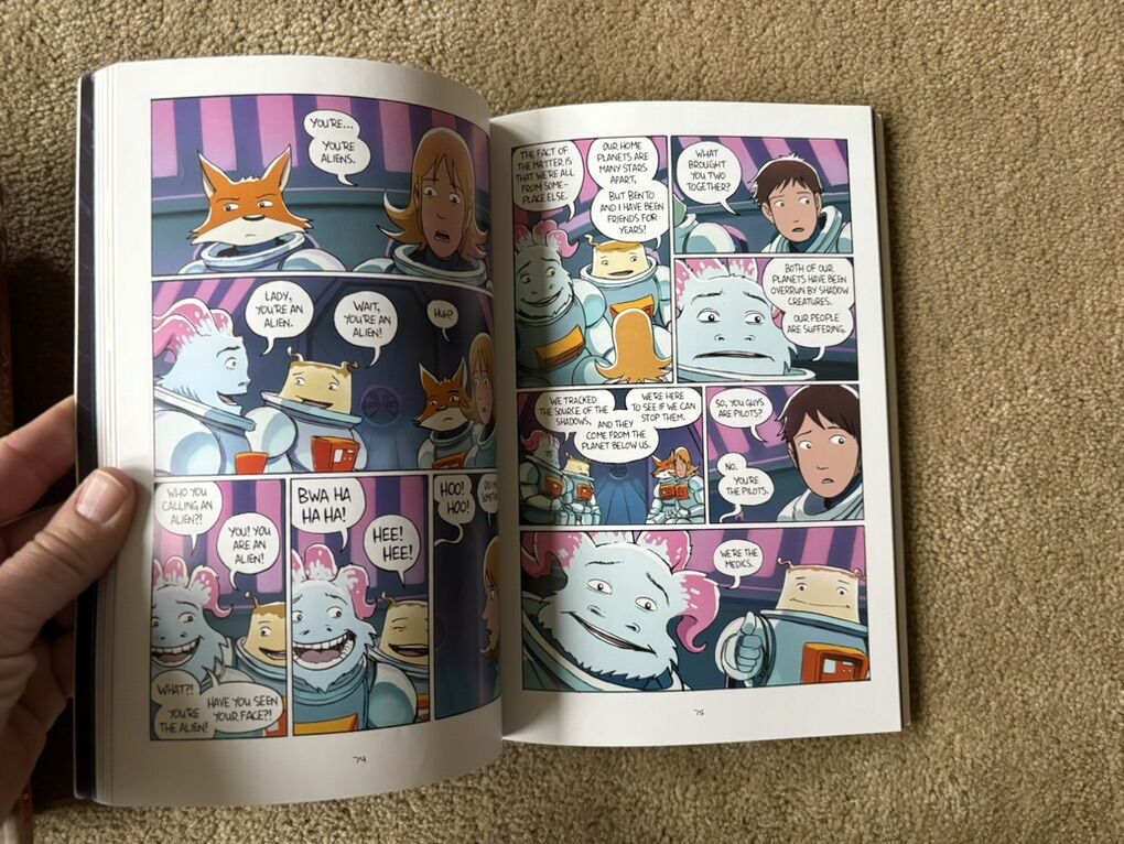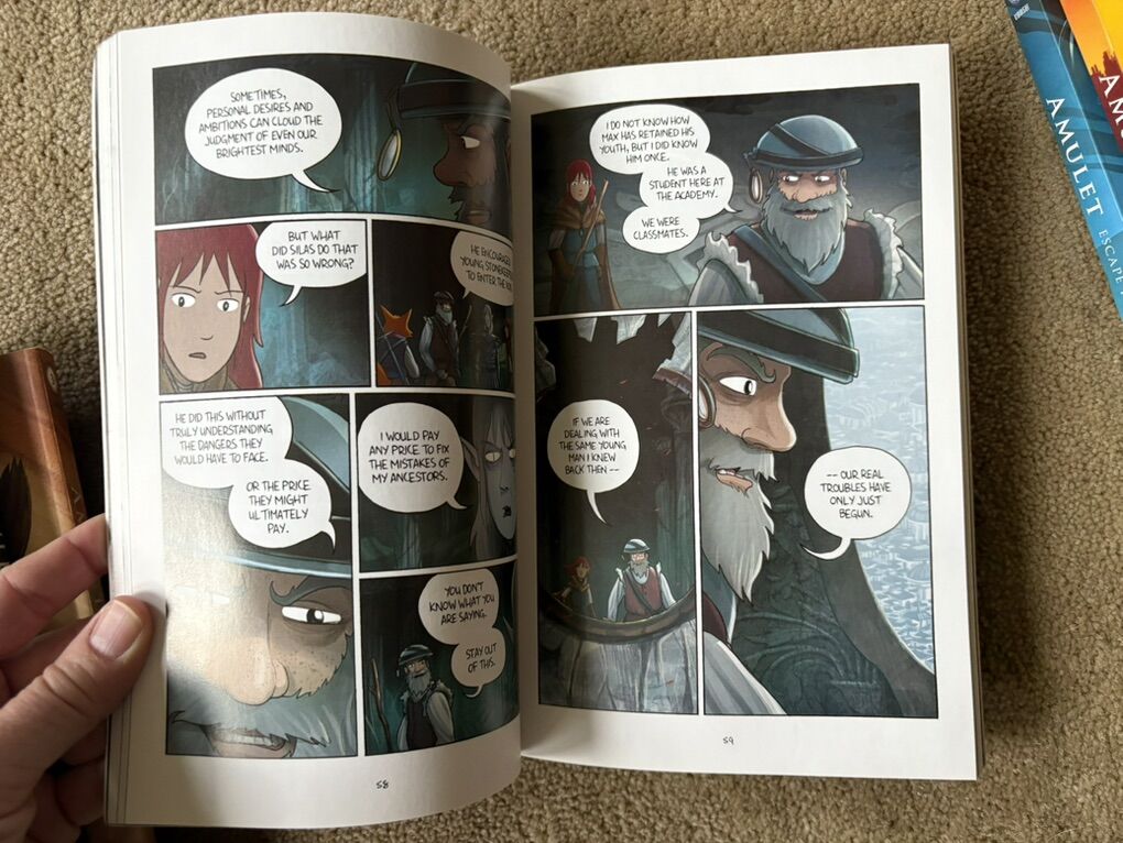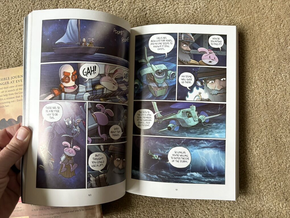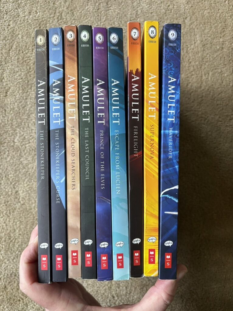 Nine Amulet Graphic Novels, by Kazu Kibuishi (books 1-9). Graphix, Scholastic, published 2008-2024. Sturdy oversized paperbacks in very good to excellent condition. Text only. Cash or Venmo.