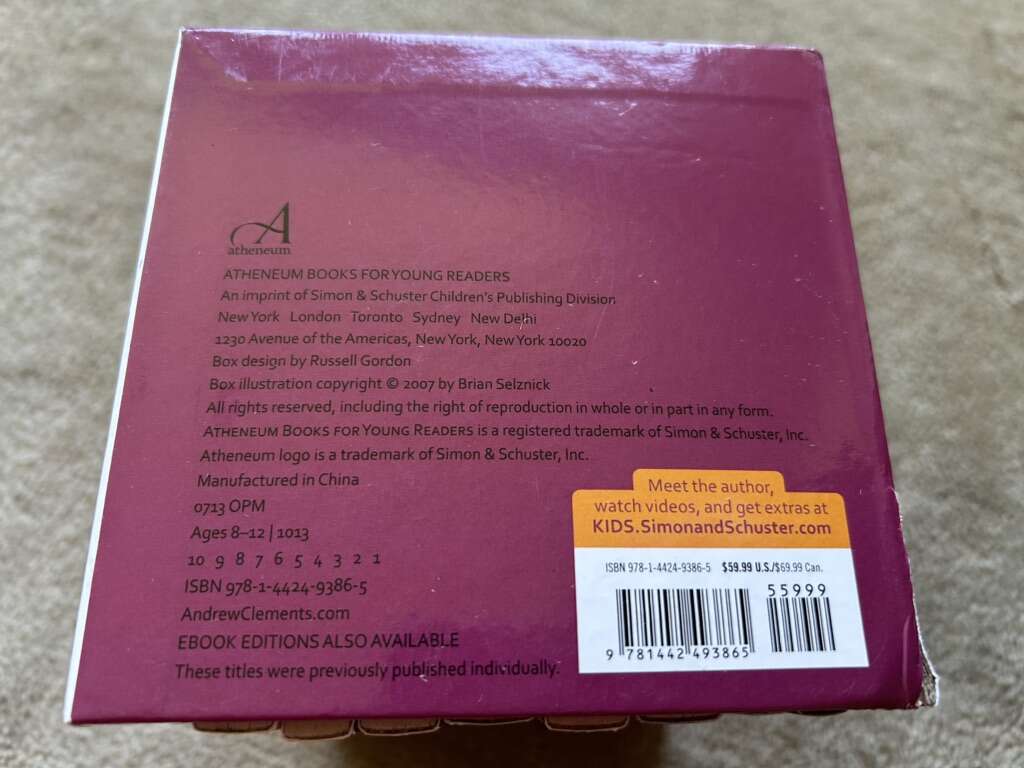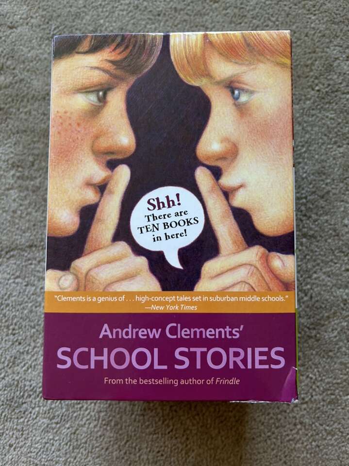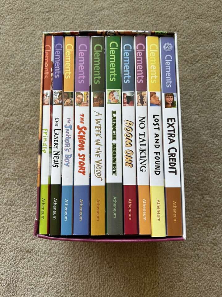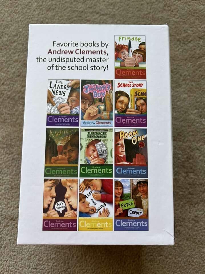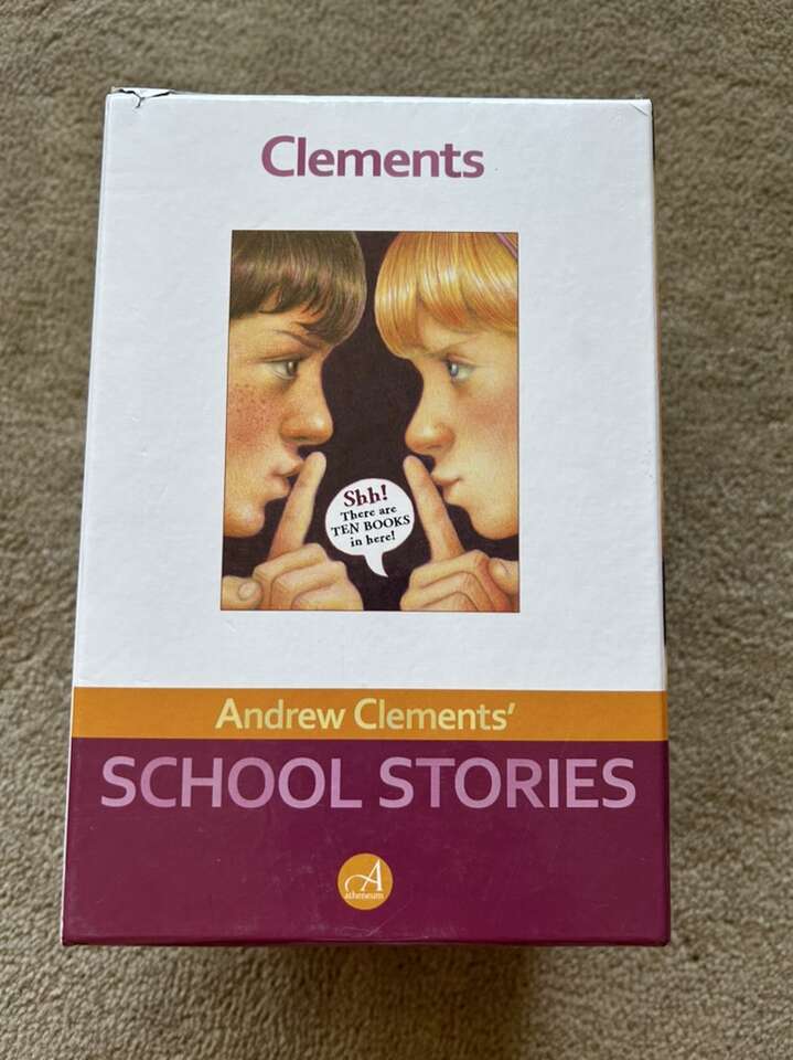 Andrew Clements’ School Stories Boxed Set. 10 classic books by Andrew Clements, illustrated by Brian Selznick: Frindle, The Landry News, The Janitor’s Boy, The School Story, A Week in the Woods, Lunch Money, Room One, No Talking, Lost and Found, and Extra Credit. Athenum Books, originally published 1996-2009. Ages 8-12. Paperbacks in excellent, like new condition. In a sturdy slipcover. Box slightly damaged on corner (see photos). Text only. Cash or Venmo.