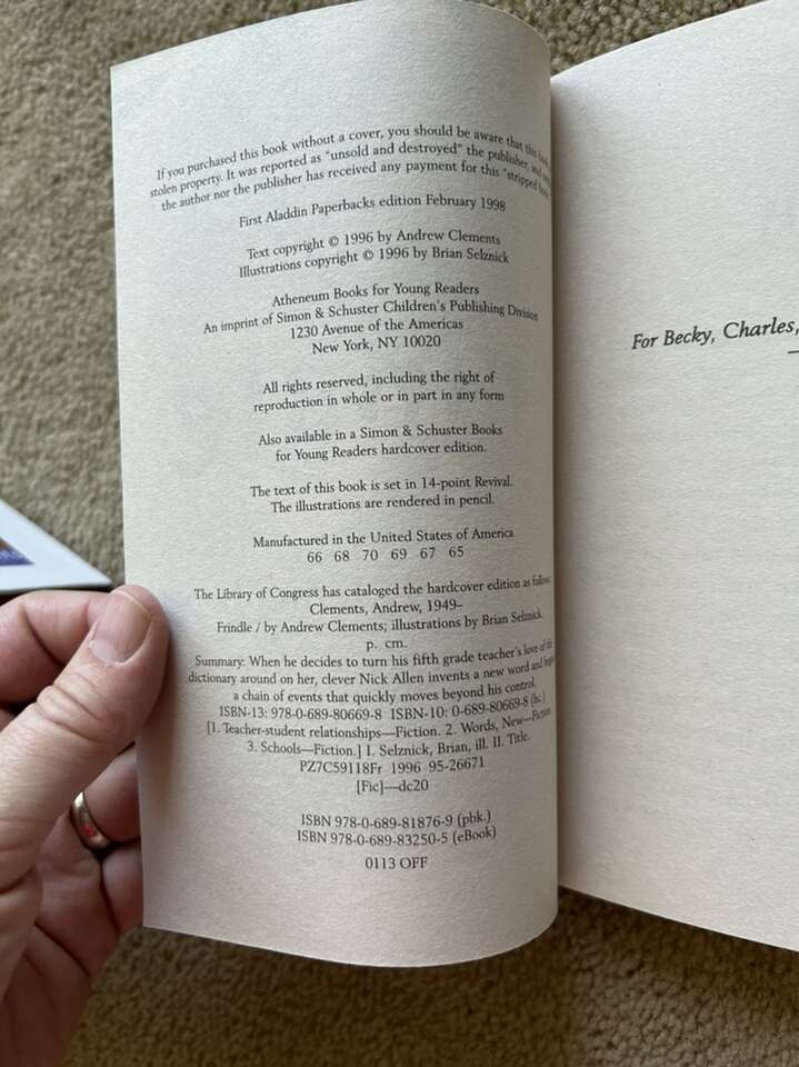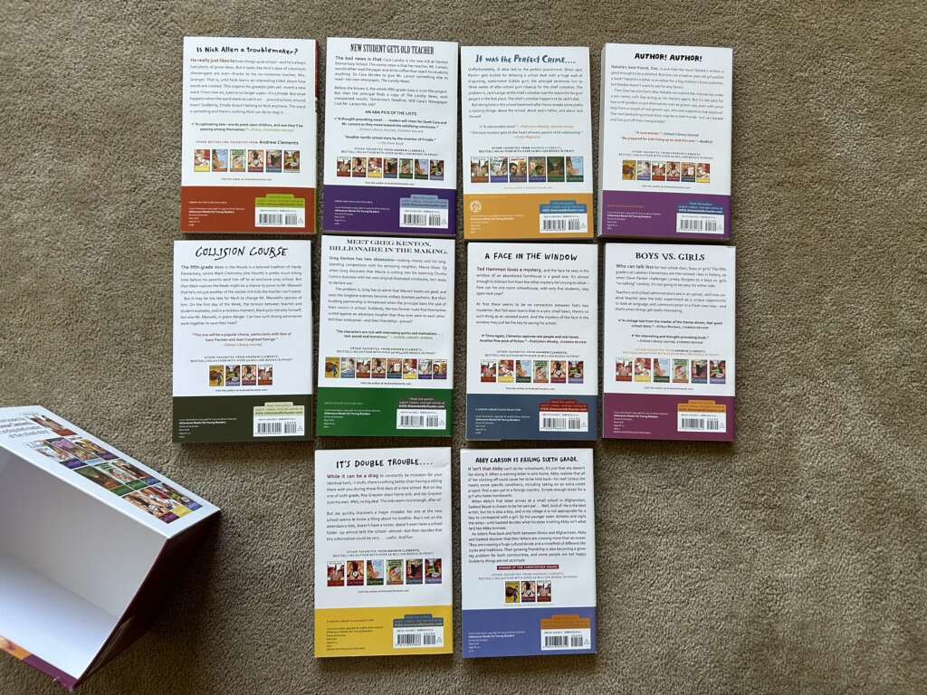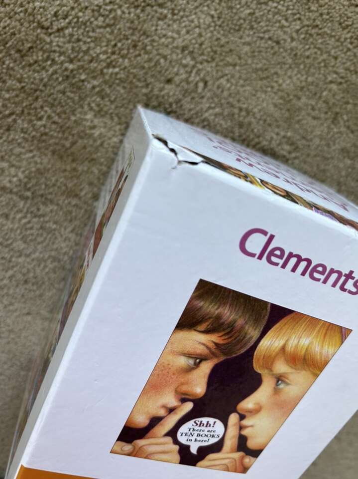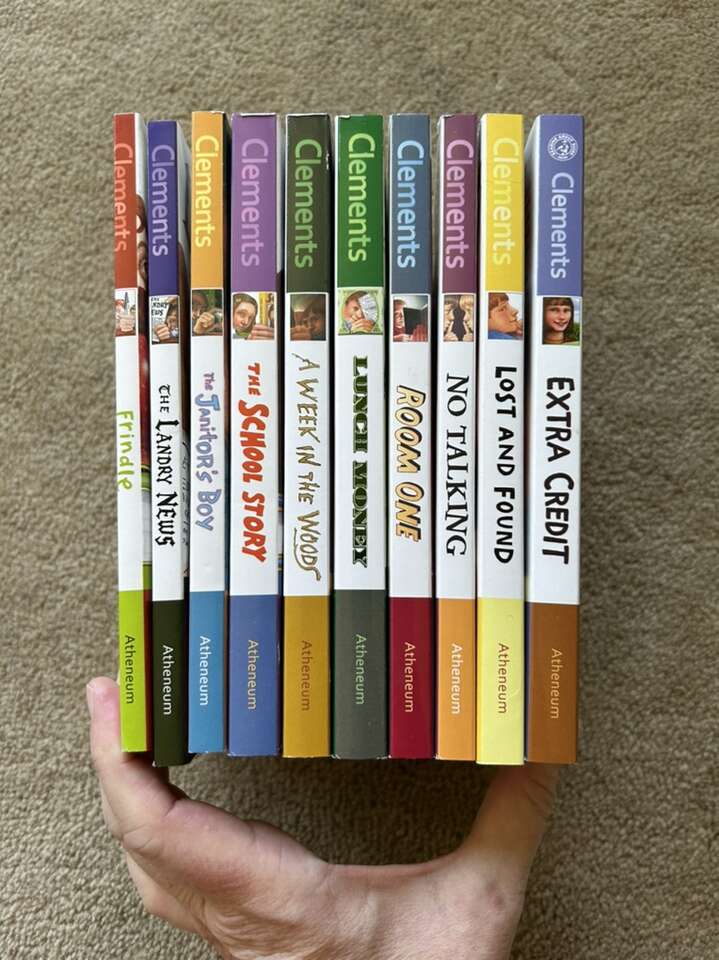 Andrew Clements’ School Stories Boxed Set. 10 classic books by Andrew Clements, illustrated by Brian Selznick: Frindle, The Landry News, The Janitor’s Boy, The School Story, A Week in the Woods, Lunch Money, Room One, No Talking, Lost and Found, and Extra Credit. Athenum Books, originally published 1996-2009. Ages 8-12. Paperbacks in excellent, like new condition. In a sturdy slipcover. Box slightly damaged on corner (see photos). Text only. Cash or Venmo.