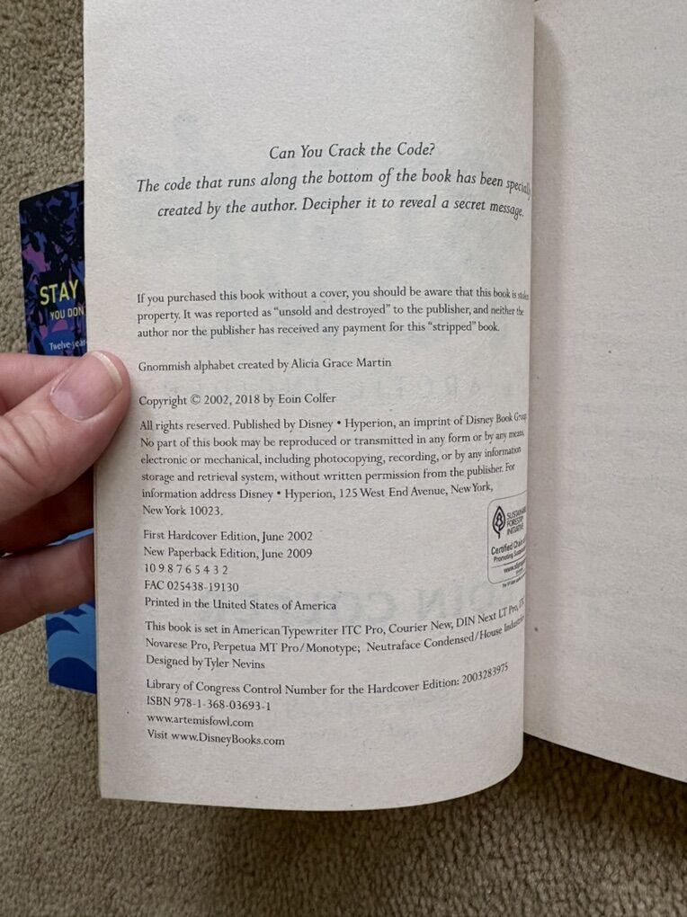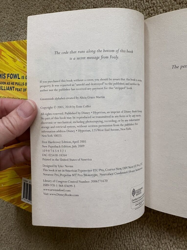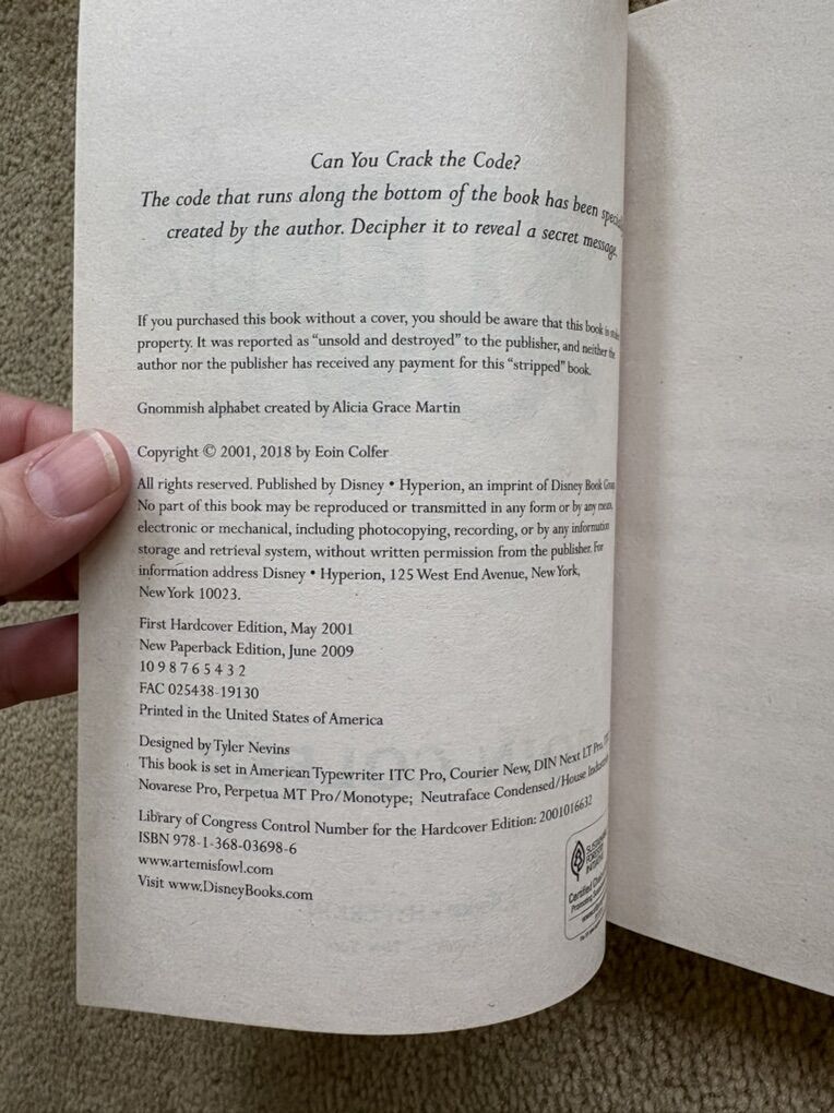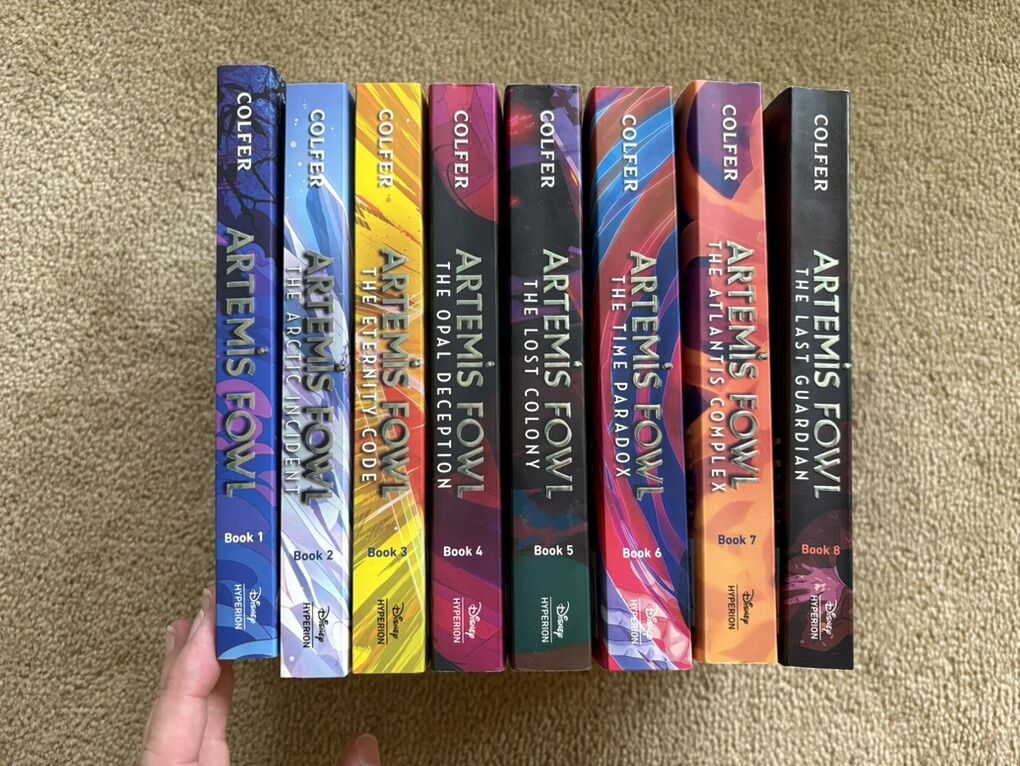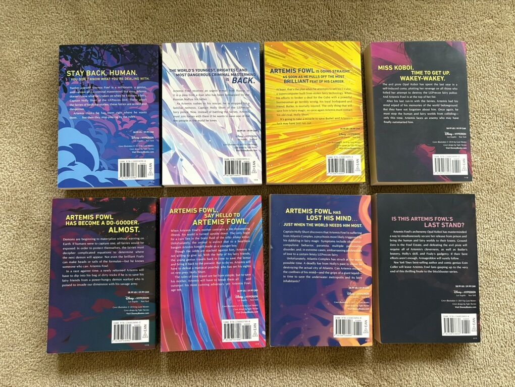 Artemis Fowl complete series, Books 1-8, by Eoin Colfer (2018 edition): Artemis Fowl (2001/2018, 270 pages), The Arctic Incident (2002/2018, 281 pages), The Eternity Code (2003/2018, 316 pages), The Opal Deception (2005/2018, 325 pages), The Lost Colony (2006/2018, 369 pages), The Time Paradox (2008/2018, 385 pages), The Atlantis Complex (2010/2018, 346 pages), and The Last Guardian (2012/2018, 326 pages). Disney Hyperion. Paperbacks in exellent, like new condition. Unbent spines, no marks or damage. Text only. Cash or Venmo.