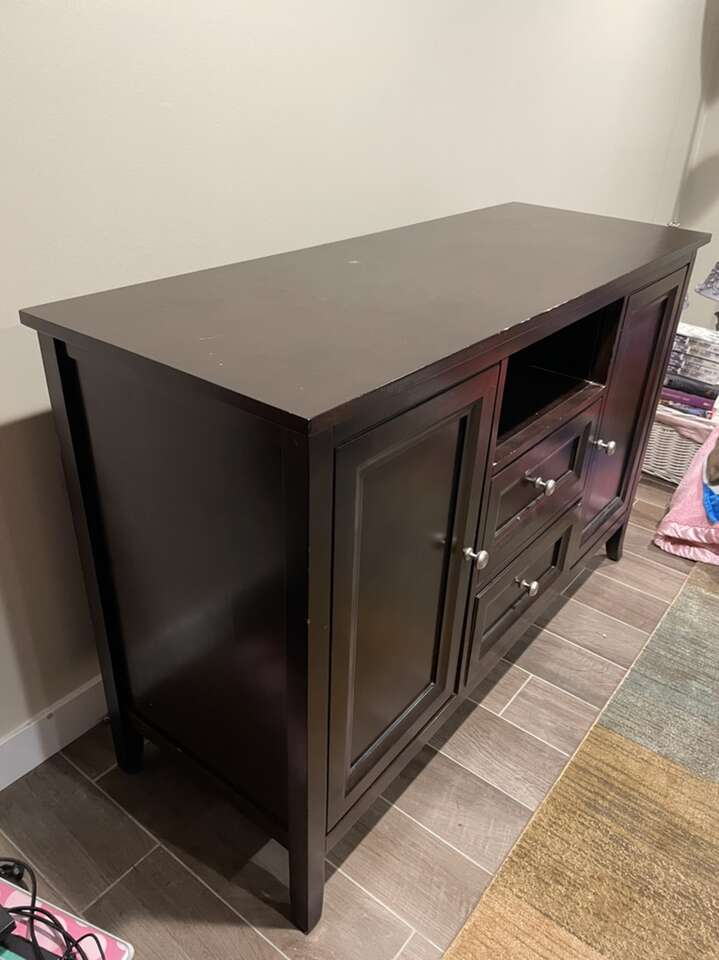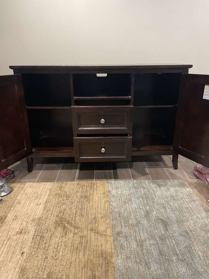 A large, high quality TV stand made out of walnut (vaneer) wood. Includes 5 shelves and 2 drawers to store computers, remotes, discs, video game consoles, printers, or anything else that a media center might need. Measures 52.5 inches in width, 19.5 inches in length/depth, and 34 inches in height. Some very minor scrapes/cuts in the wood from moving, but overall in excellent condition.