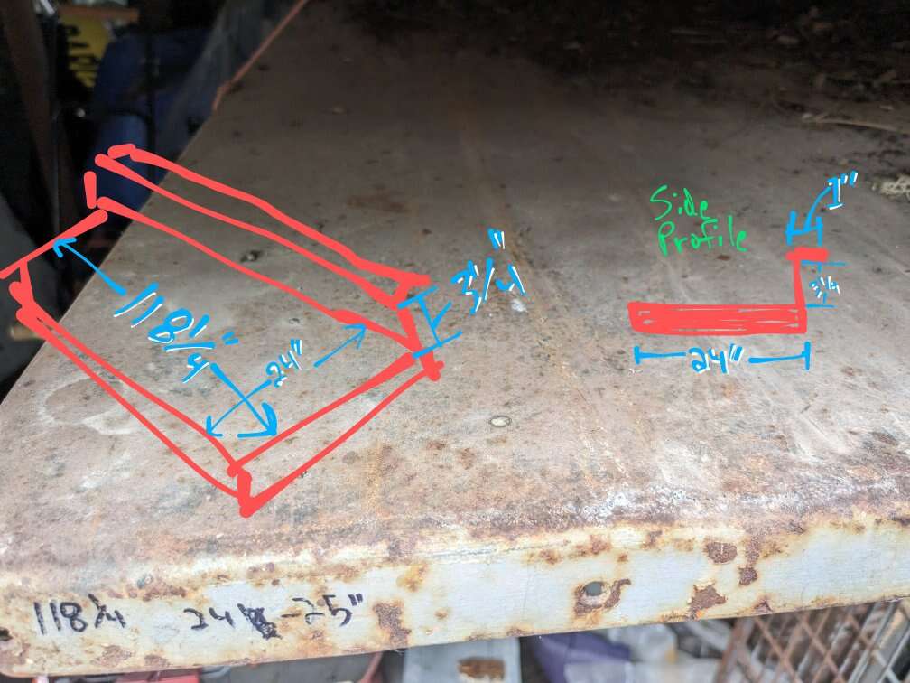 1/16 thick steel 118" long 24" deep with 1" top lip(25" total depth)