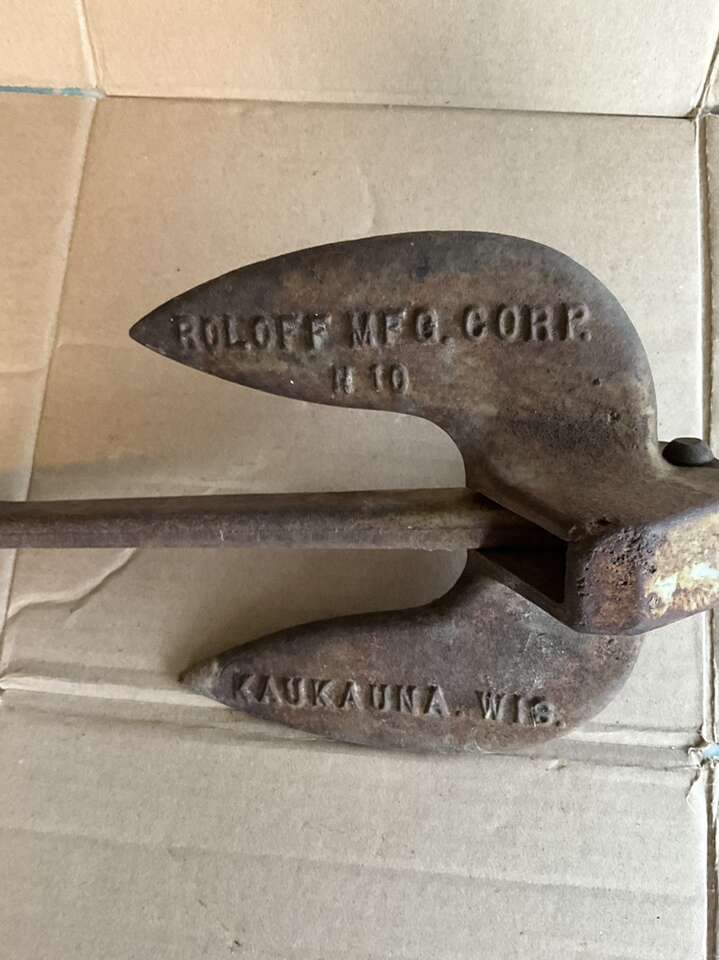 Vintage American boat anchor made in Kaukauna Wisconsin! Roloff manufacturing corp. number “N10”. Weighs about 10 pounds. This is excellent for a nostalgic display piece or fully functional for your boat. Cash only.
