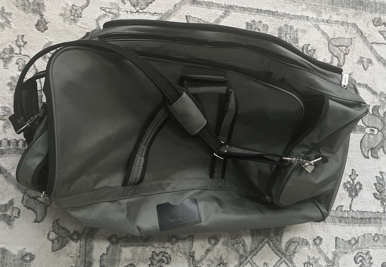 VenmoDimensions: approx. 27 long, 12high, 13 width (too big for carry-on) dark gray 2 deep outside pockets on the side handle and rollers for pulling shoulder strap for carrying Also great to store 72 hour supplies.