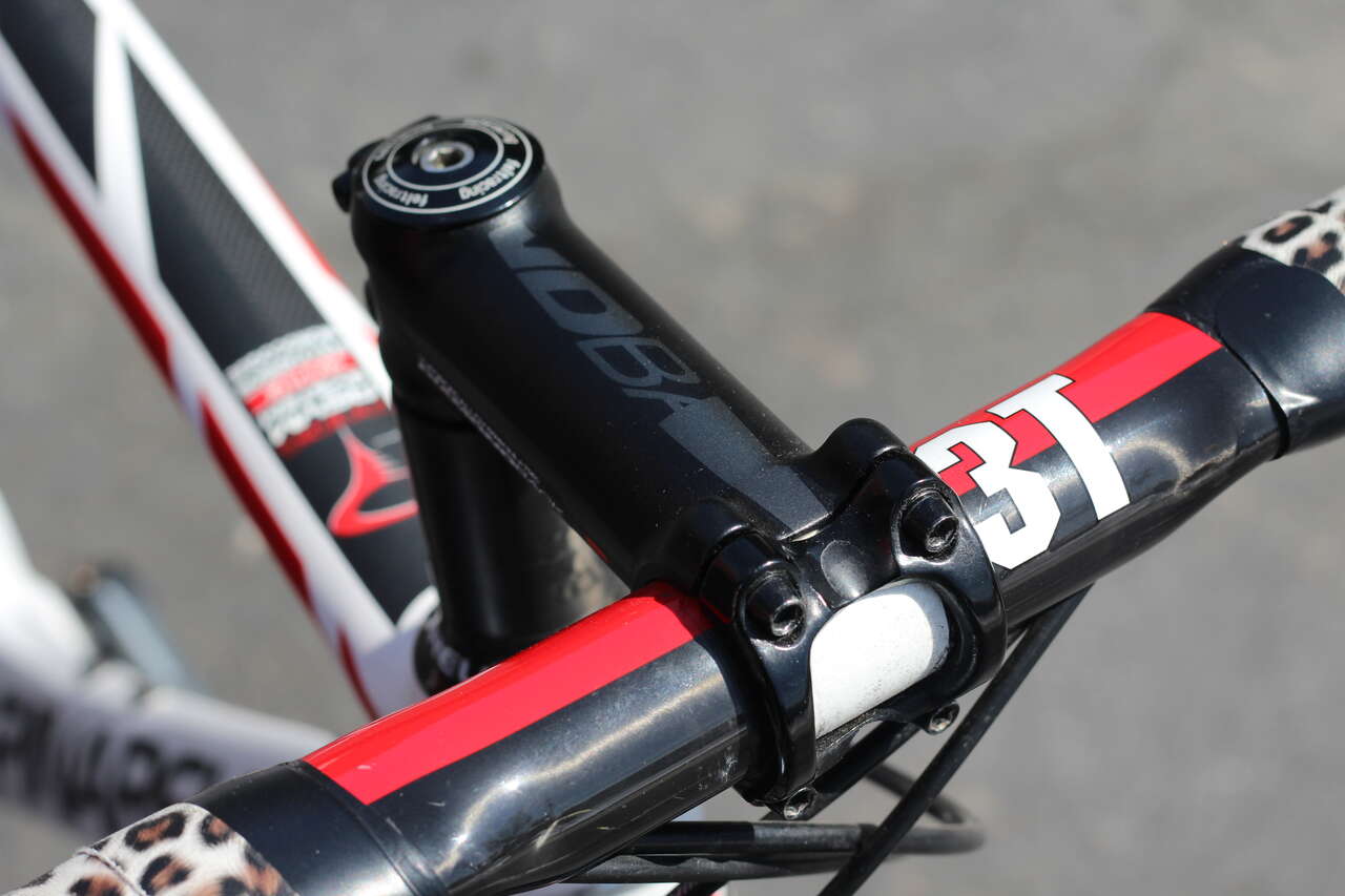Bar tape is a fun leopard print that is overall in good shape but the leopard spots are worn off where your hands touch the bars the most.