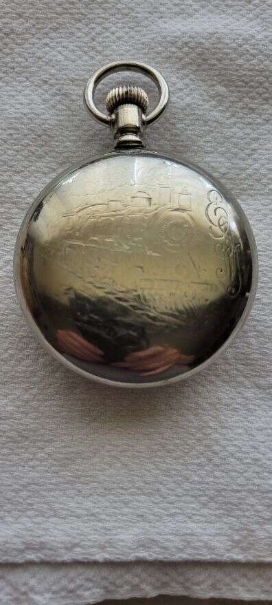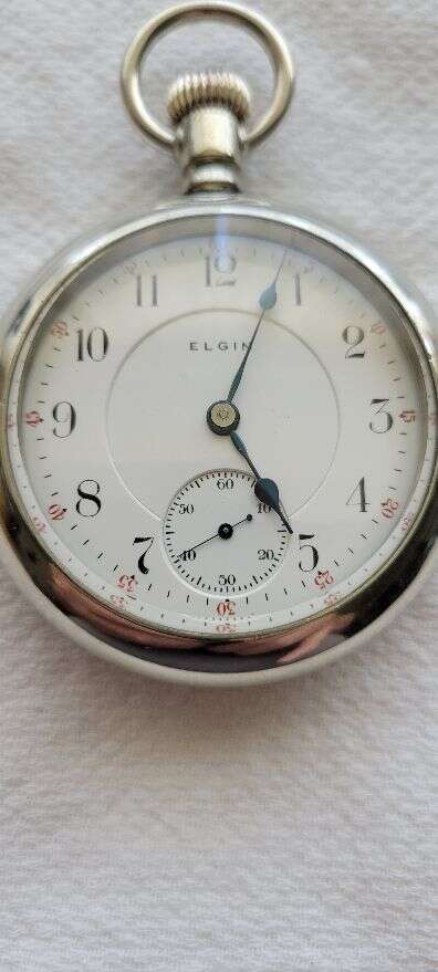 I’m selling this nice used vintage 18 size, 21 Jewel, Elgin MODEL 349 railroad pocket watch. The watch is in running condition and keeping time. The watch was recently cleaned. The watch is in a silverode case. There is some wear on the case, but overall, the case is in decent shape. The watch case has a glass crystal. The watch has a nice double sunk dial with some hairlines. Based on the serial number (13553239), the watch was made in 1909. The watch has been carried, but still a descent example of an Elgin railroad pocket watch.