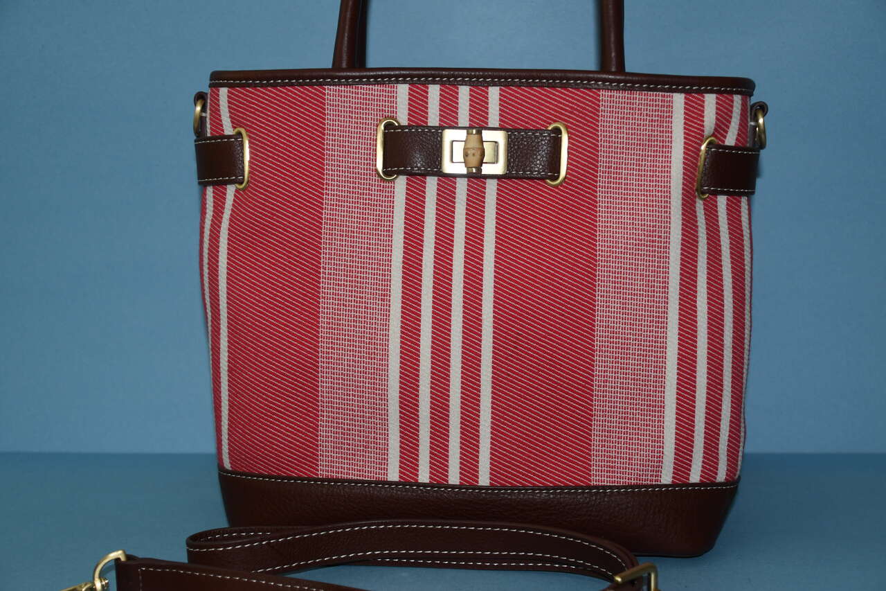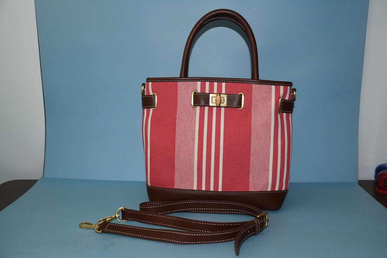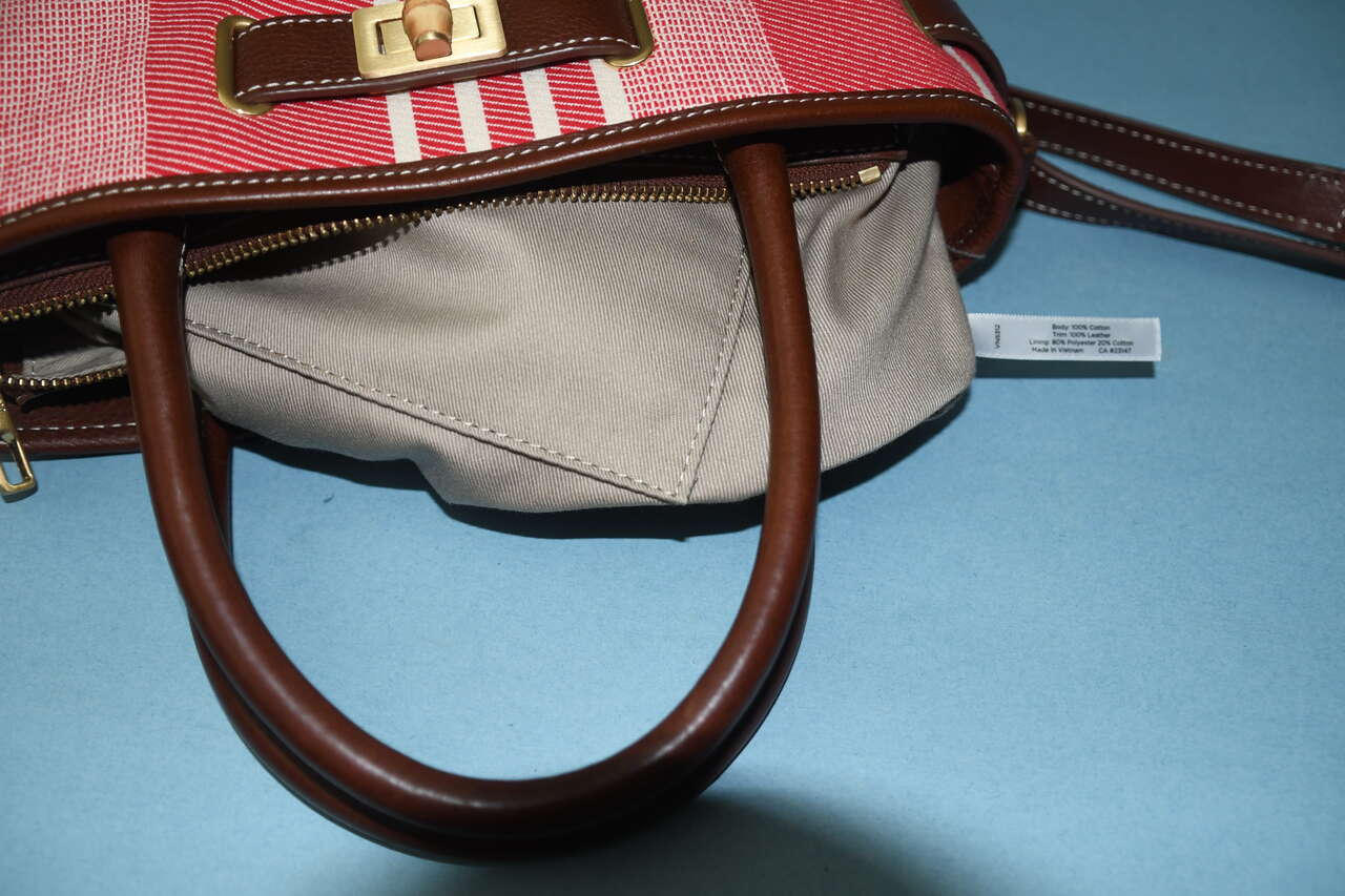 This CUTE TALBOT'S HANDBAG is CLEAN! The trim is LEATHER. It is about 9" x 10" x 3.5". It has a zippered closure & a detachable strap. Inside is a zippered pocket and an open pocket. Our home is smoke free. Questions??? Please ask. We are located in Plain City. Cash only please.