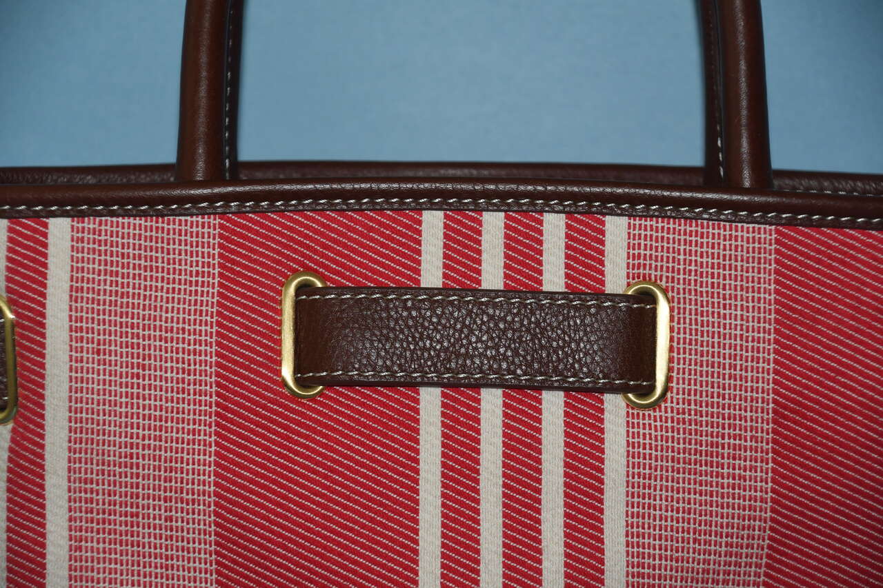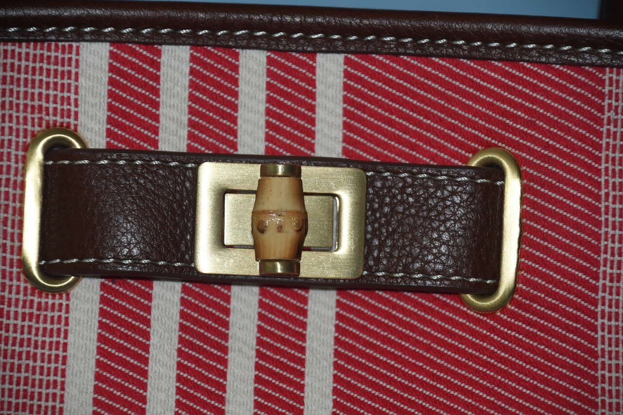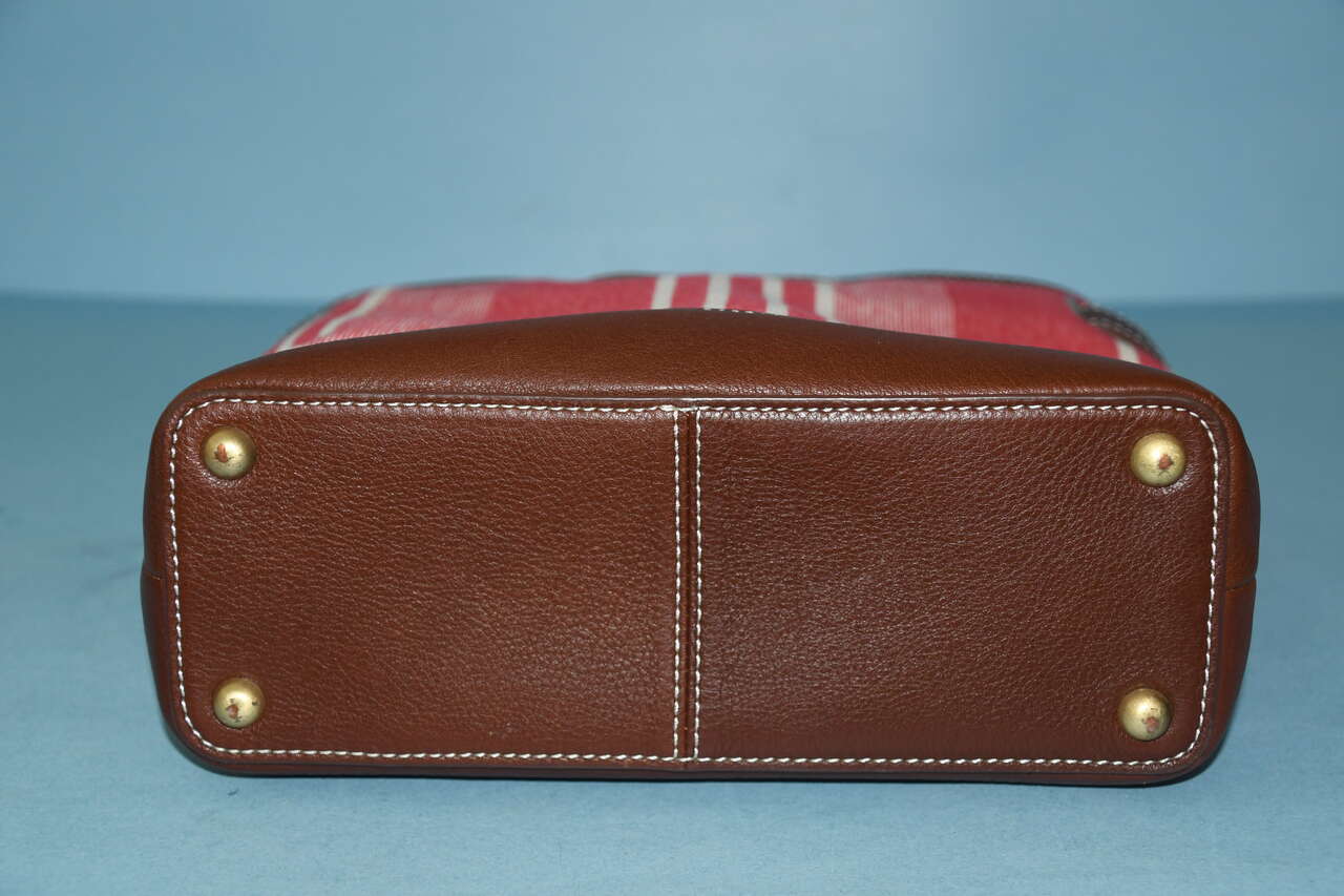 This CUTE TALBOT'S HANDBAG is CLEAN! The trim is LEATHER. It is about 9" x 10" x 3.5". It has a zippered closure & a detachable strap. Inside is a zippered pocket and an open pocket. Our home is smoke free. Questions??? Please ask. We are located in Plain City. Cash only please.