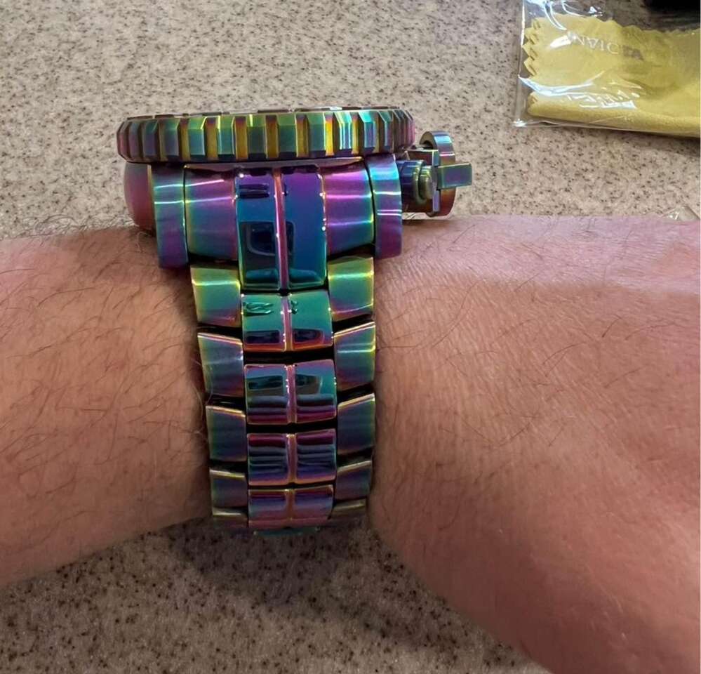 This is a lightly worn but in like new condition Invicta Sea Hunter watch. One of the largest and heaviest watches you can find. Definitely fun to wear out as it is a great conversation piece. Comes with the extra links in case you need it bigger.