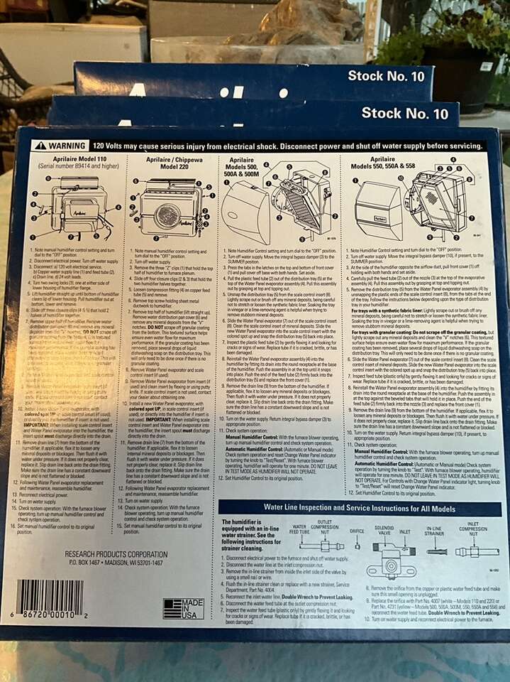 Aprilaire humidifier filter, stock number 10. Fits models 110, 220, 500, 500A, 500m, 550, 550A, & 558. Note: this type of humidifier is usually installed to circulate in the heating/cooling ventilation system. Quantity of 3, all new. Cash only.