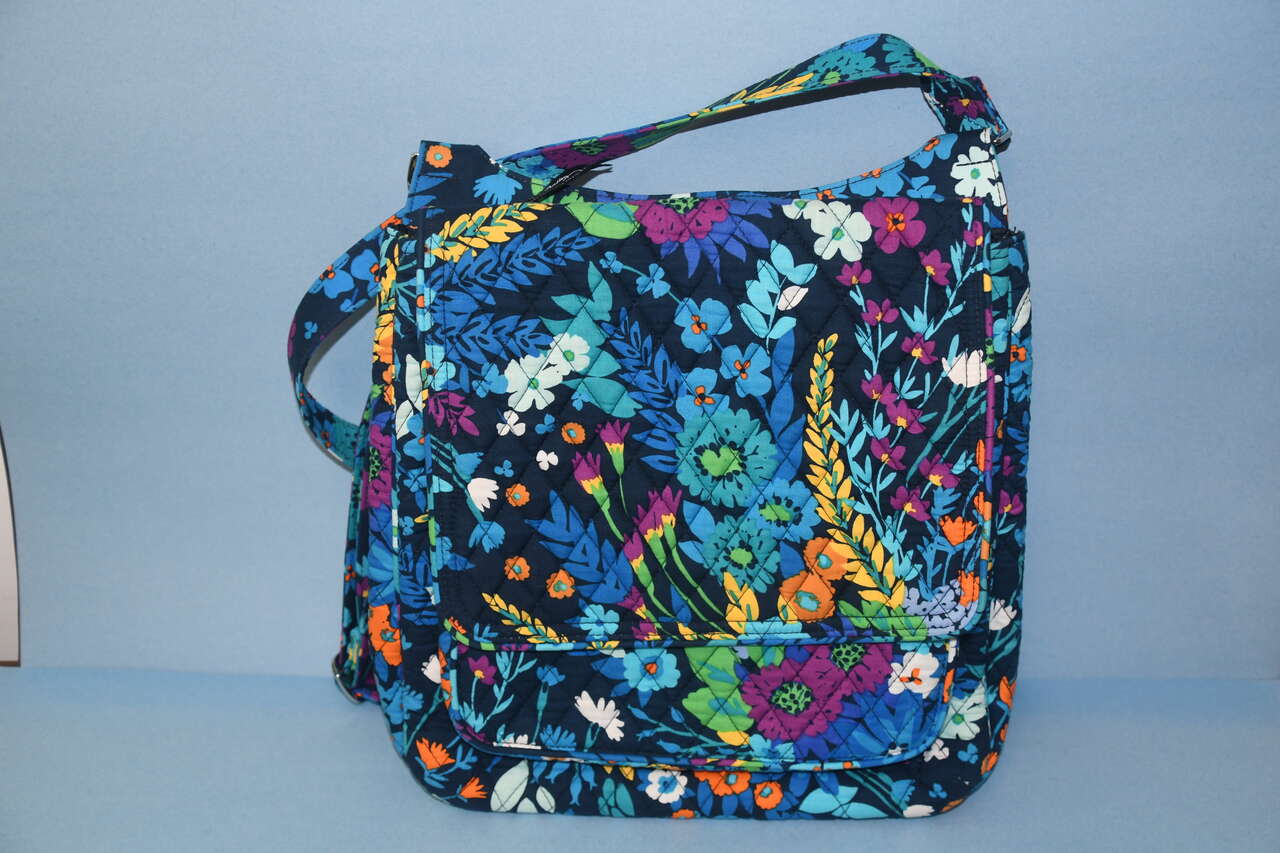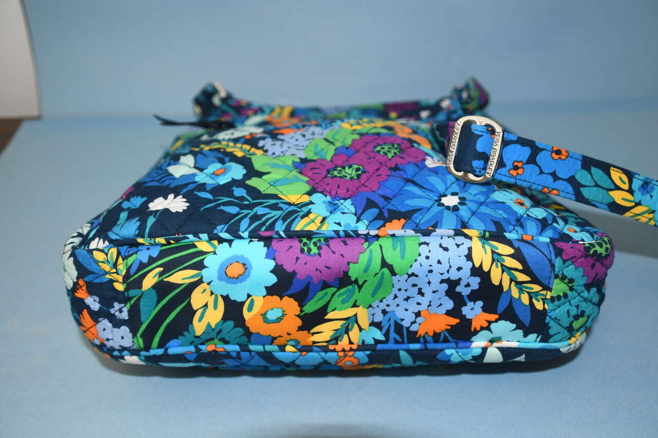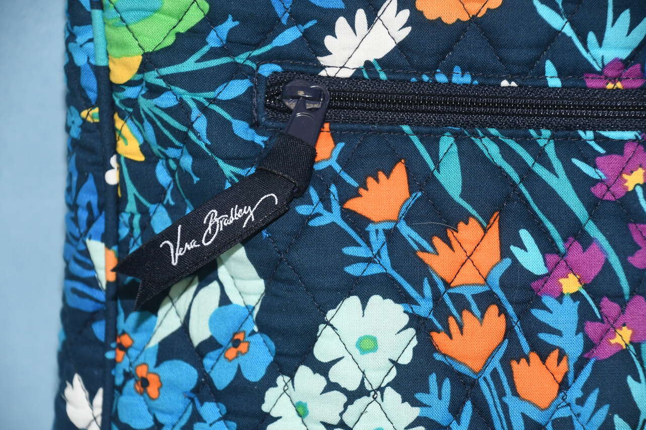 Auction is for a BLUE FLORAL VERA BRADLEY HANDBAG/TOTE. It is about 11" x 11" x 3". It is CLEAN! It has an adjustable strap. There is a back zippered pocket. The top is zippered. The front flap opens to a large open pocket. Our home is smoke free. Questions??? Please ask. We are located in Plain City. Cash only please.