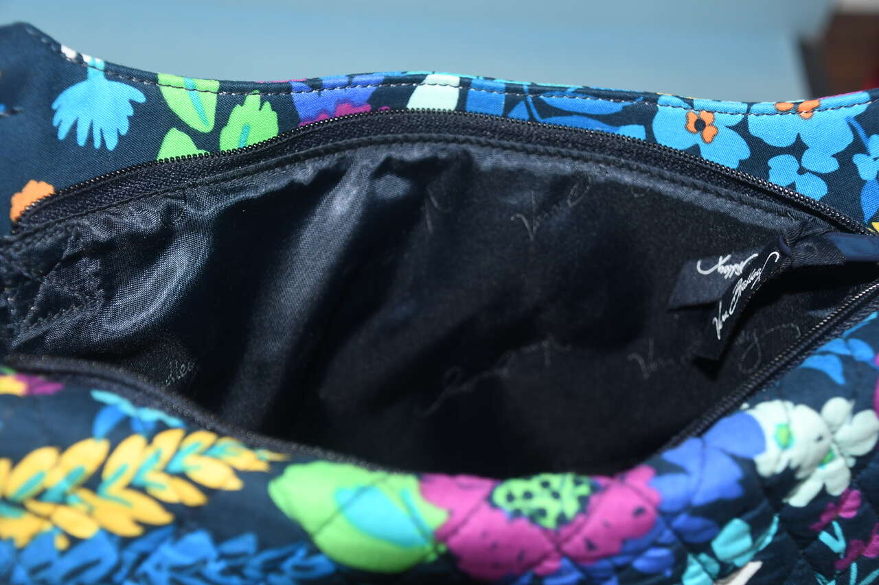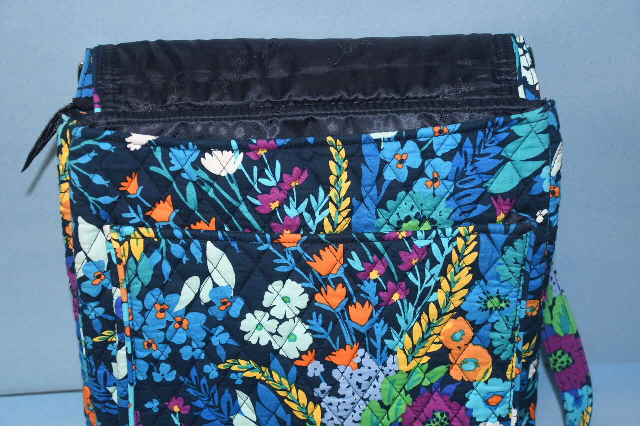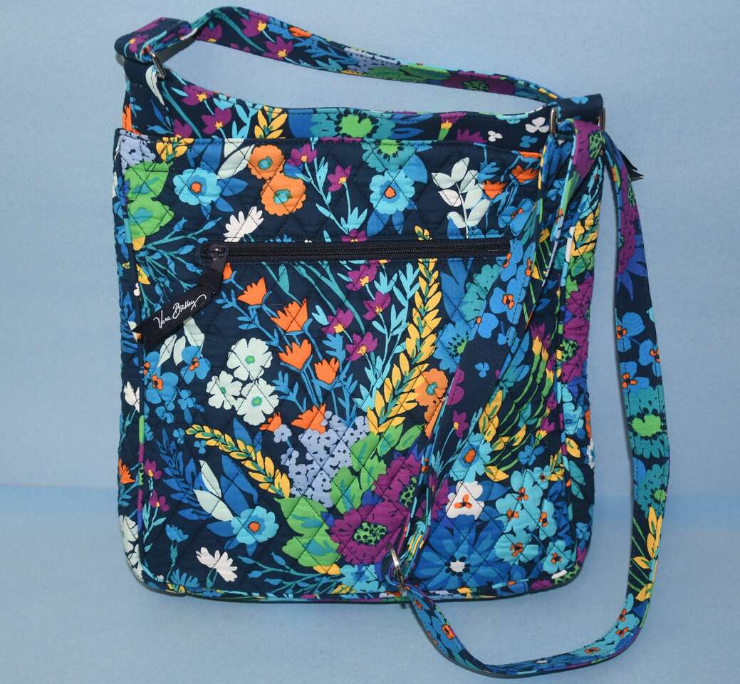 Auction is for a BLUE FLORAL VERA BRADLEY HANDBAG/TOTE. It is about 11" x 11" x 3". It is CLEAN! It has an adjustable strap. There is a back zippered pocket. The top is zippered. The front flap opens to a large open pocket. Our home is smoke free. Questions??? Please ask. We are located in Plain City. Cash only please.