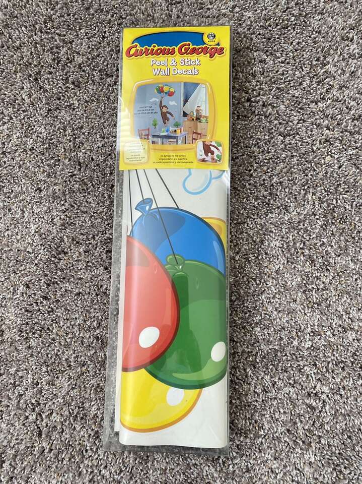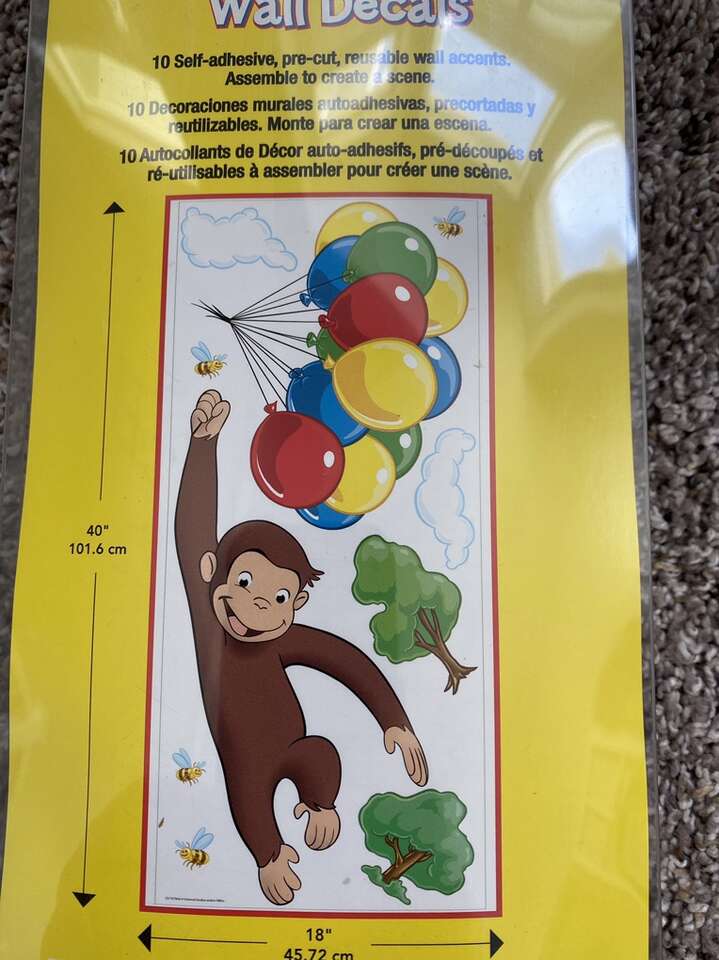 New, never been used. Never been opened. Curious George peel and stick wall decals. Contains a total of 10 decals. You get 1 Curious George, 1 bunch of balloons, 2 trees, 2 clouds and 4 bees. See second photo to get approximate dimensions.1