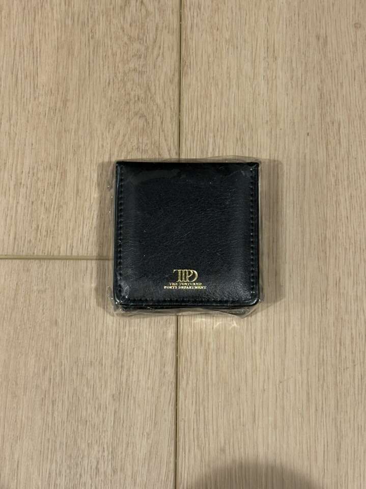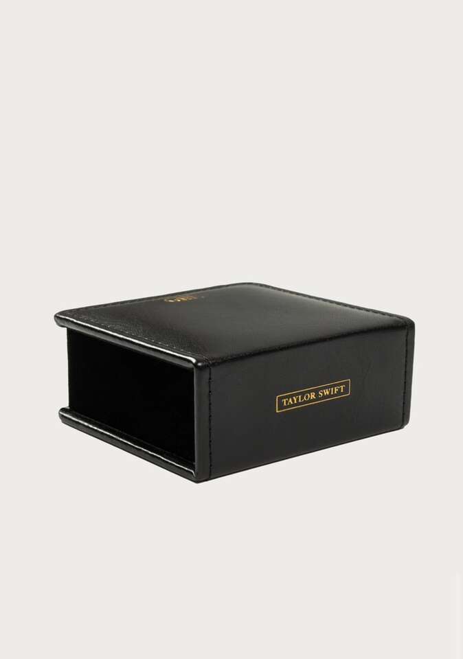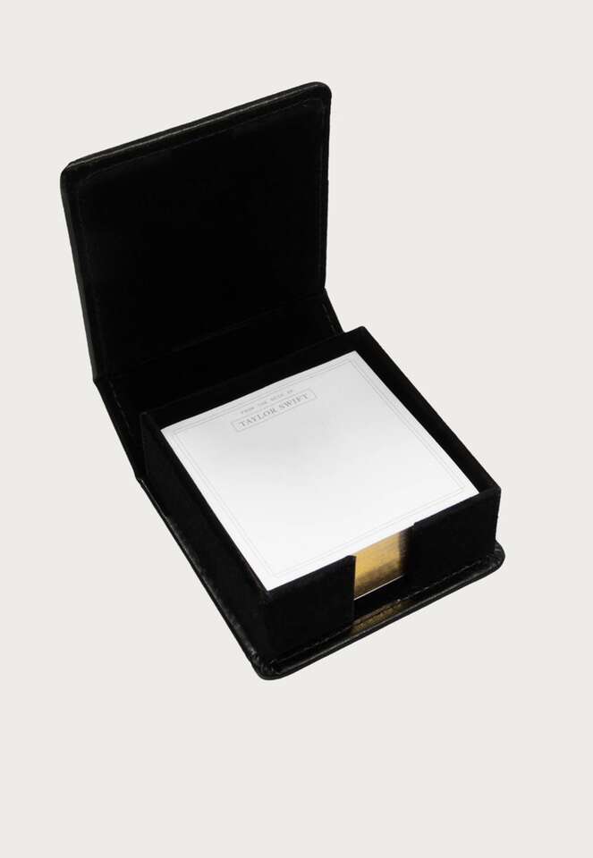Cream sticky notepad featuring double line design and From The Desk Of and Taylor Swift with box design printed at top of each notepad page and black leather notepad holder with TTPD album logo and The Tortured Poets Department printed on front in gold foil and Taylor Swift with box design printed on back in gold foil. 3 x 3 x 1 holder. 200 pages. Faux leather, paper