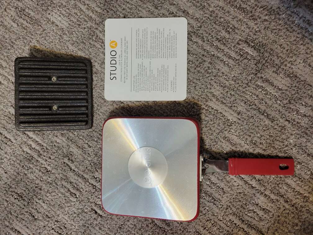 Pan is 6" x 6" and has been used once or twice. Does have signs of use. I have not used the weighted press before. Would work great for a grilled cheese or other sandwiches or anything you want to press down while cooking.