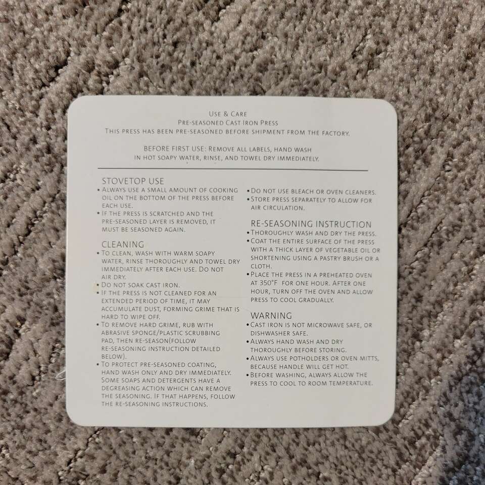I keep the original cardboard square in-between the pan and press while storing. Have not used this in a long time, would like it to go to someone who'll use it.