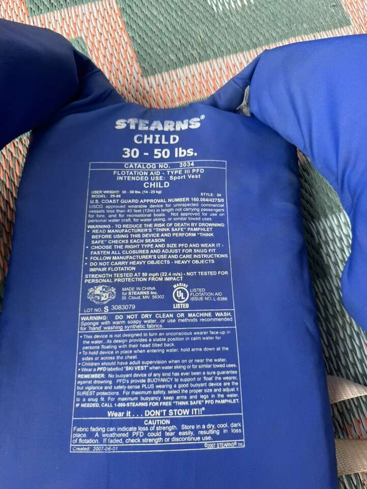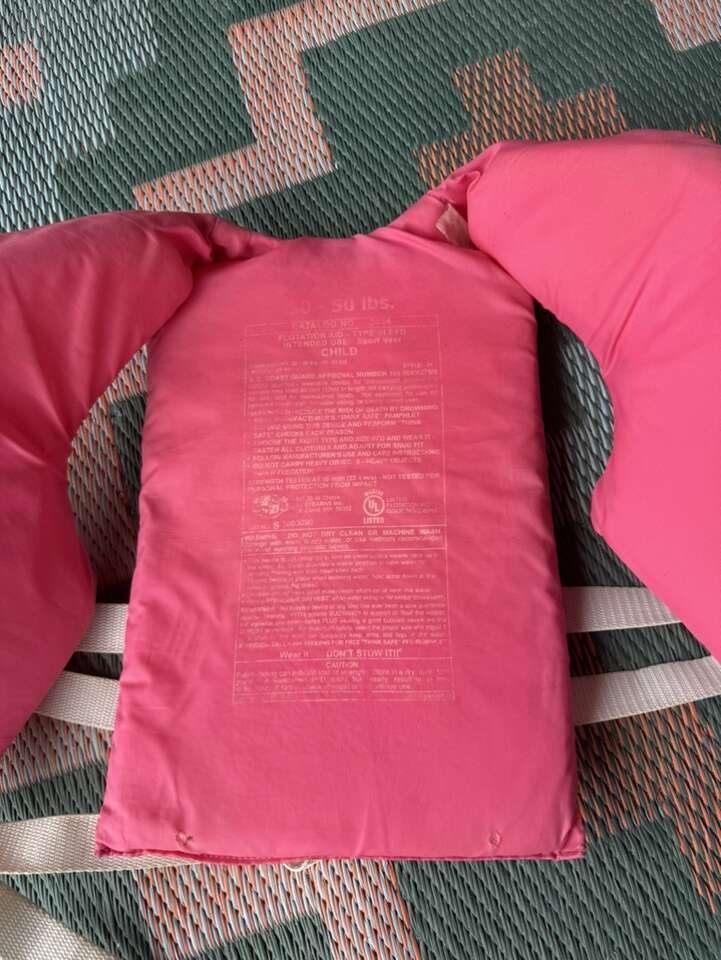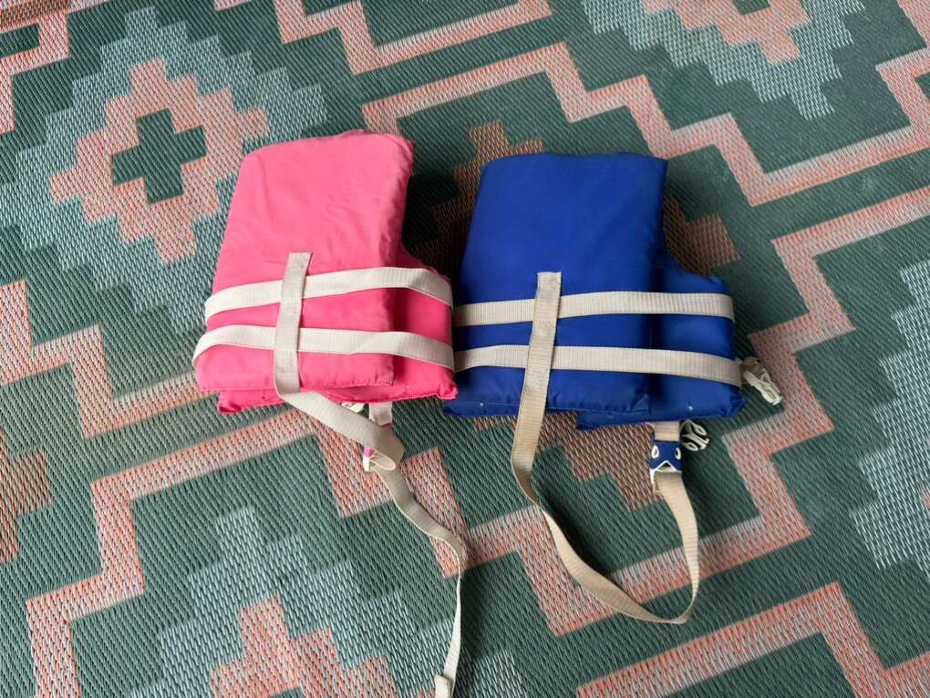 Pink and blue kids life vests. Both 30-50lb weight limits.
