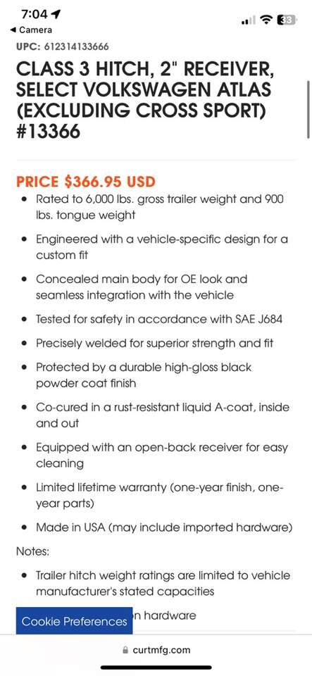 This is a Curt 13366 Class 3 Trailer Hitch. INCLUDES ASSEMBLY HARDWARE
