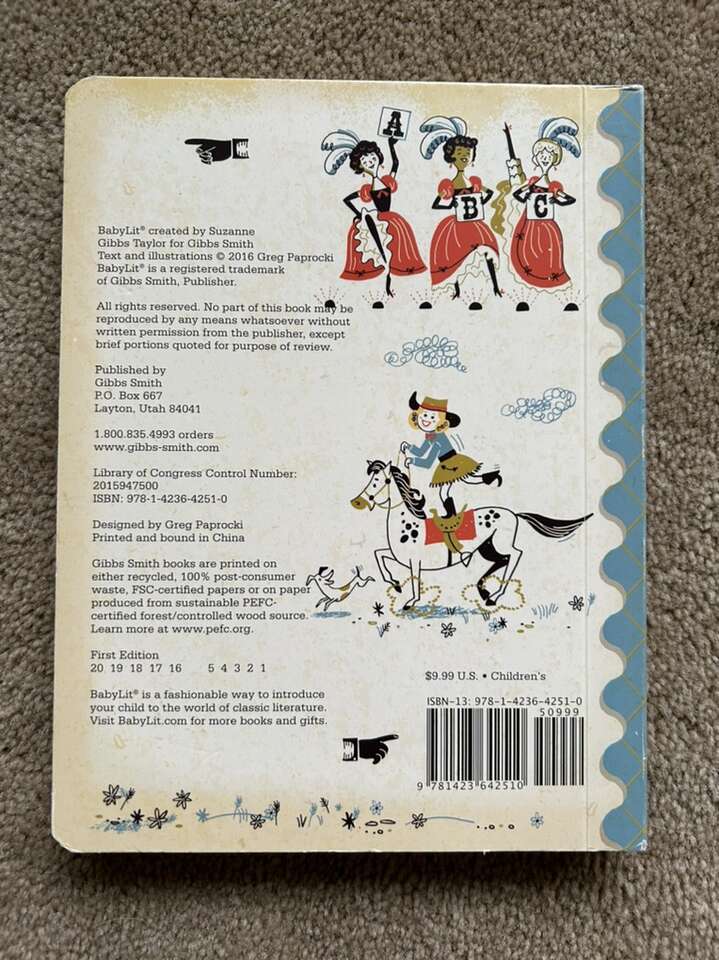 V is for Vittles: a Wild West Alphabet BabyLit Board Book, by Greg Paprocki. 8.5” x 6.5”, sturdy pages, colorful retro illustrations. 2016. Excellent condition. Text only. Cash or Venmo. Discount on multiple items.