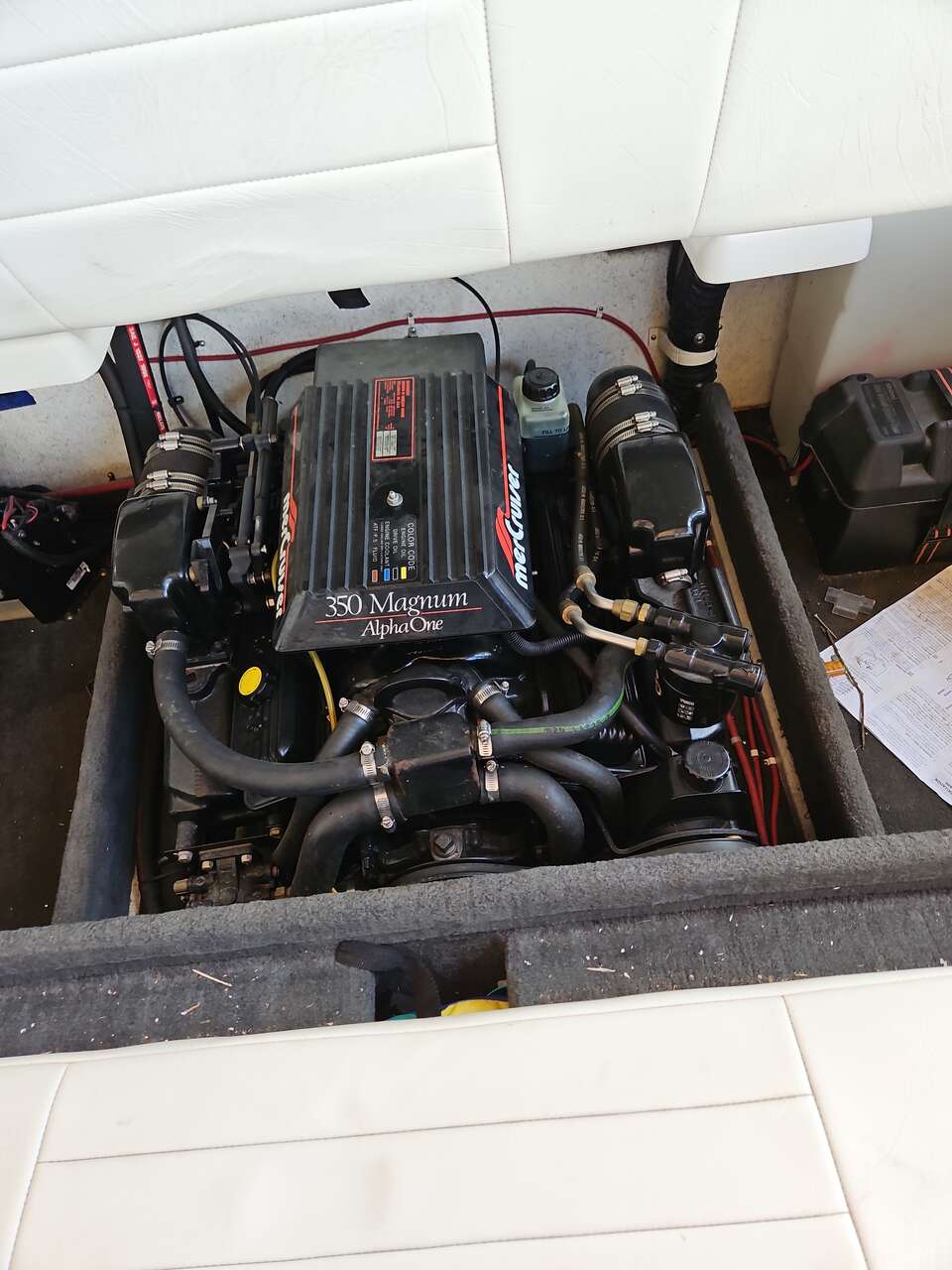 350 inboard/outboard. 3 extra props for different elevation levels. Will start and run like a puring kitten, give her the juice and she'll plain out even with 1000 pounds of humans trying to weigh her down.