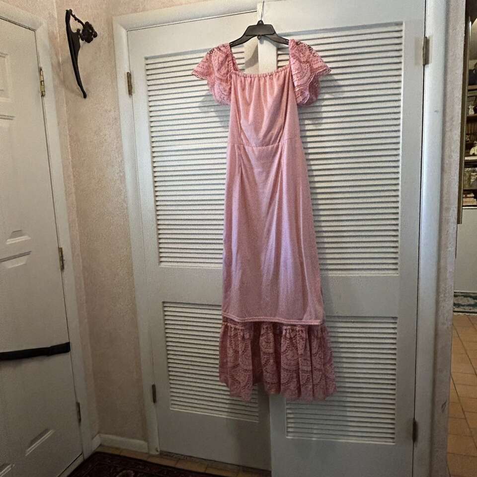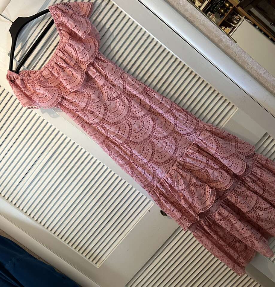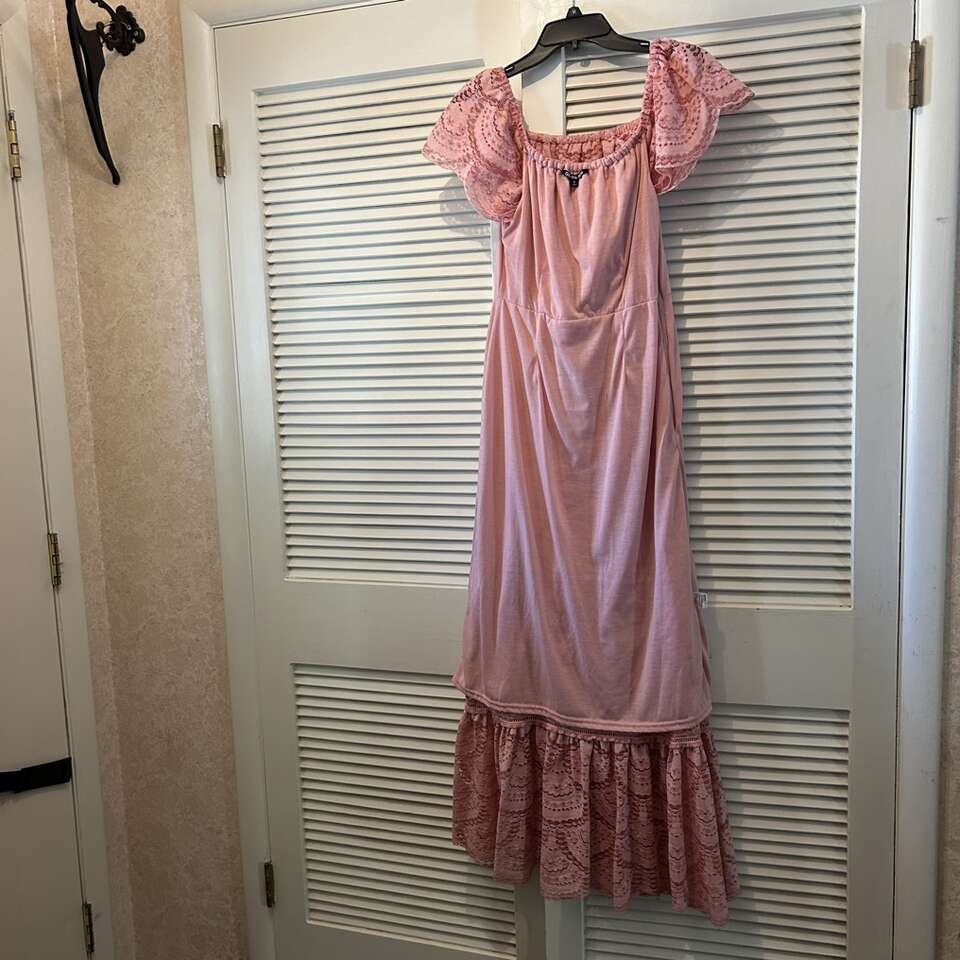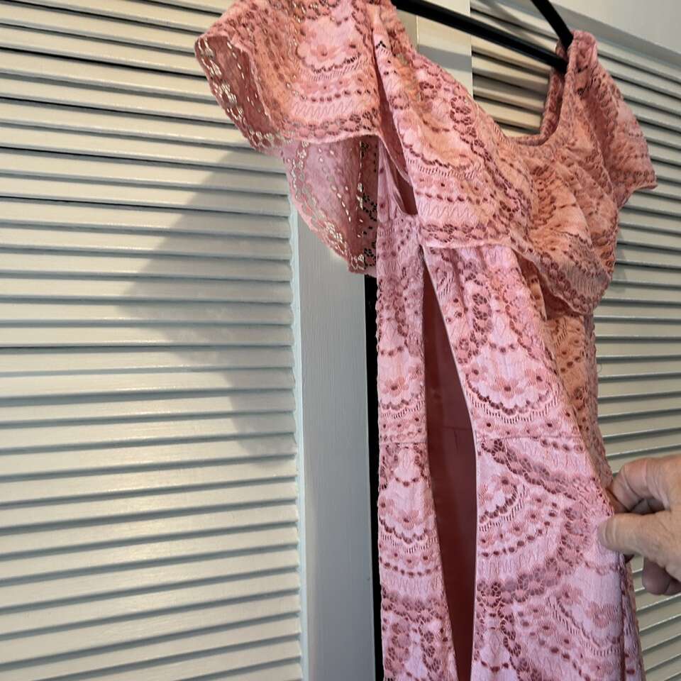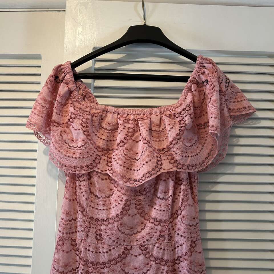 Gently used beautiful “Gianni Bini” maxi dress of pink eyelet lace with versatile bodice: dress can be worn off-the-Shoulder or On-the-shoulder. Floor length with a swingy double 12” lace at the hem, this dress can be relaxed for a BBQ or dress it up with accessories for a night out. Elastic is in great condition. Fully lined from the neckline to the top of the bottom ruffle. Lining is soft & lightly stretchy for maximum comfort.