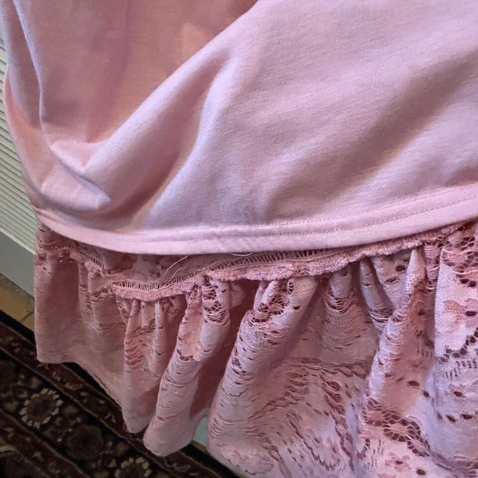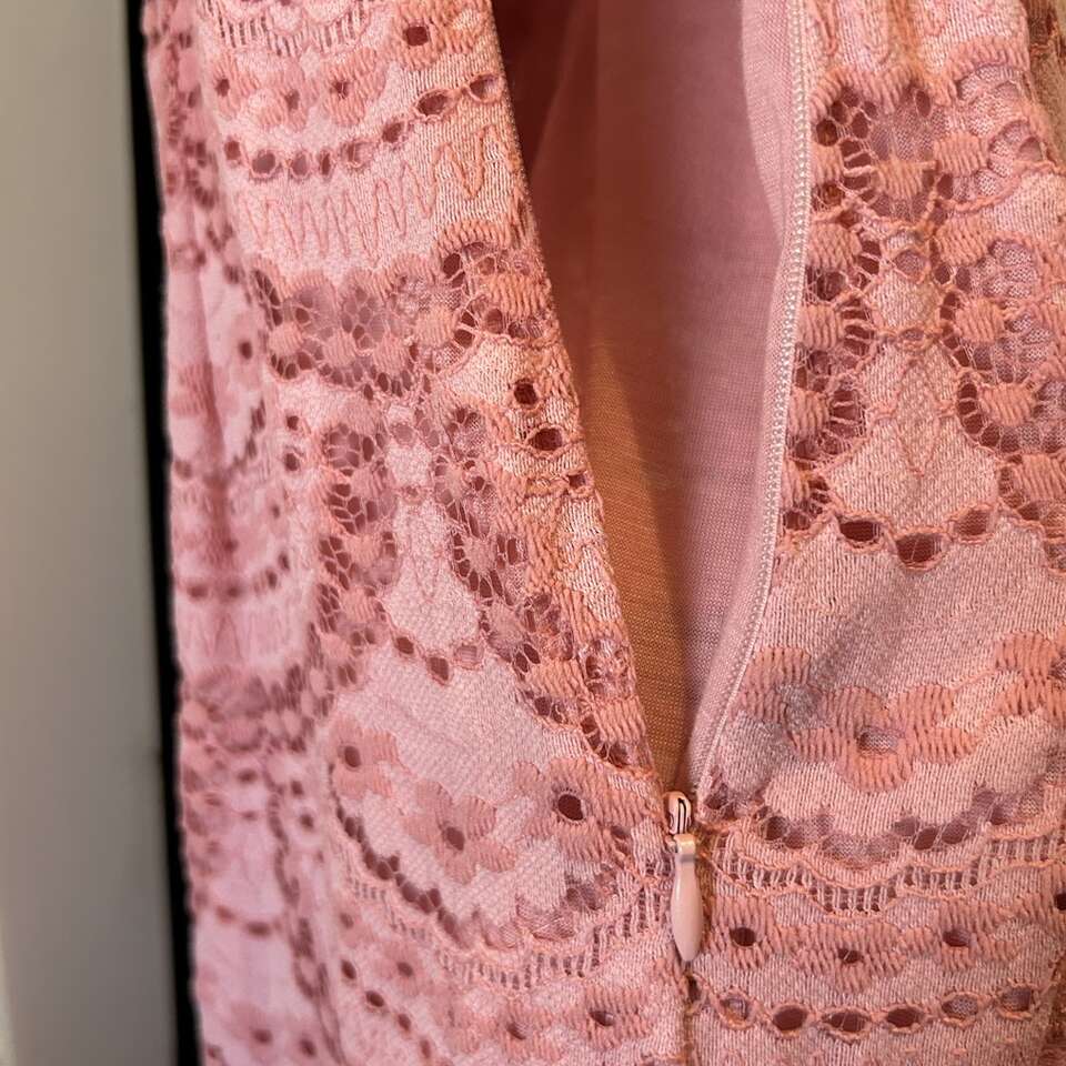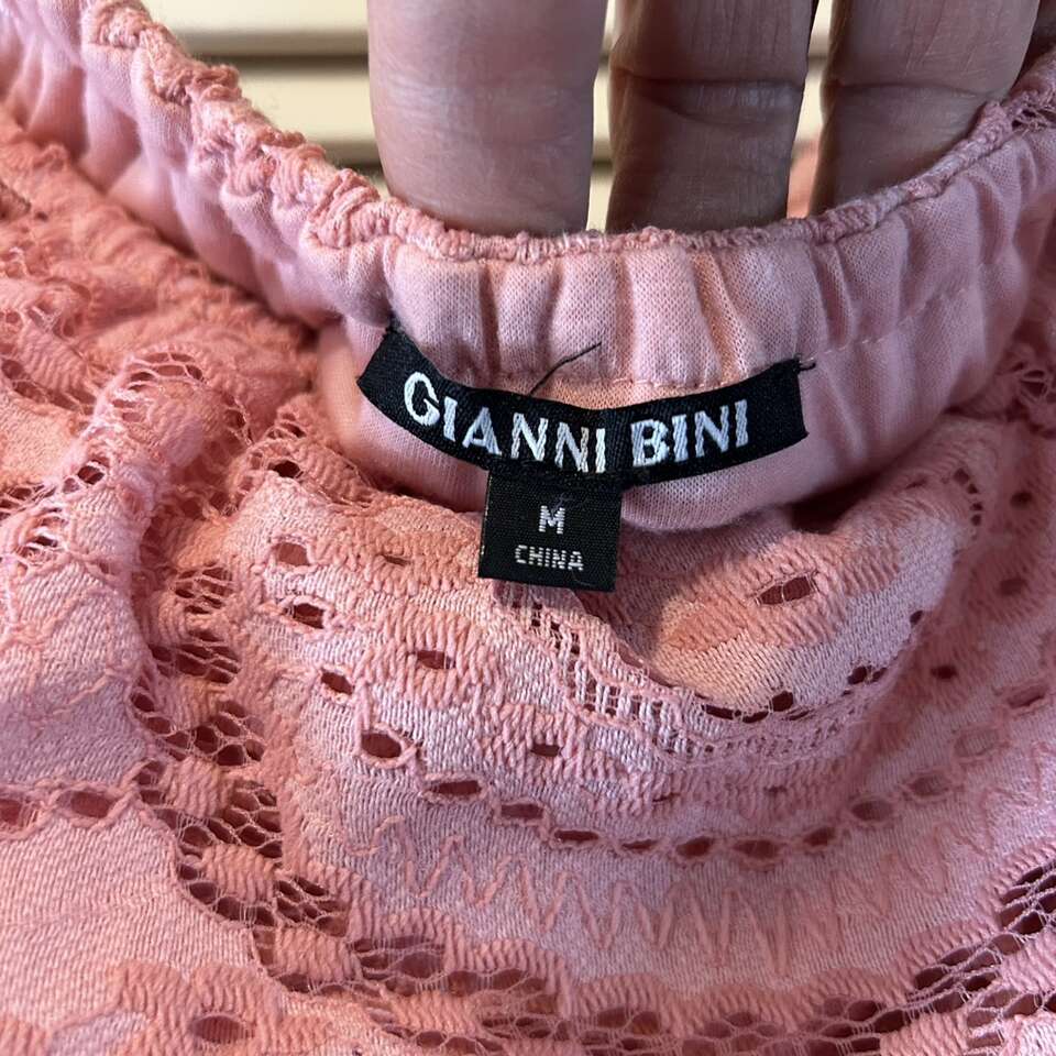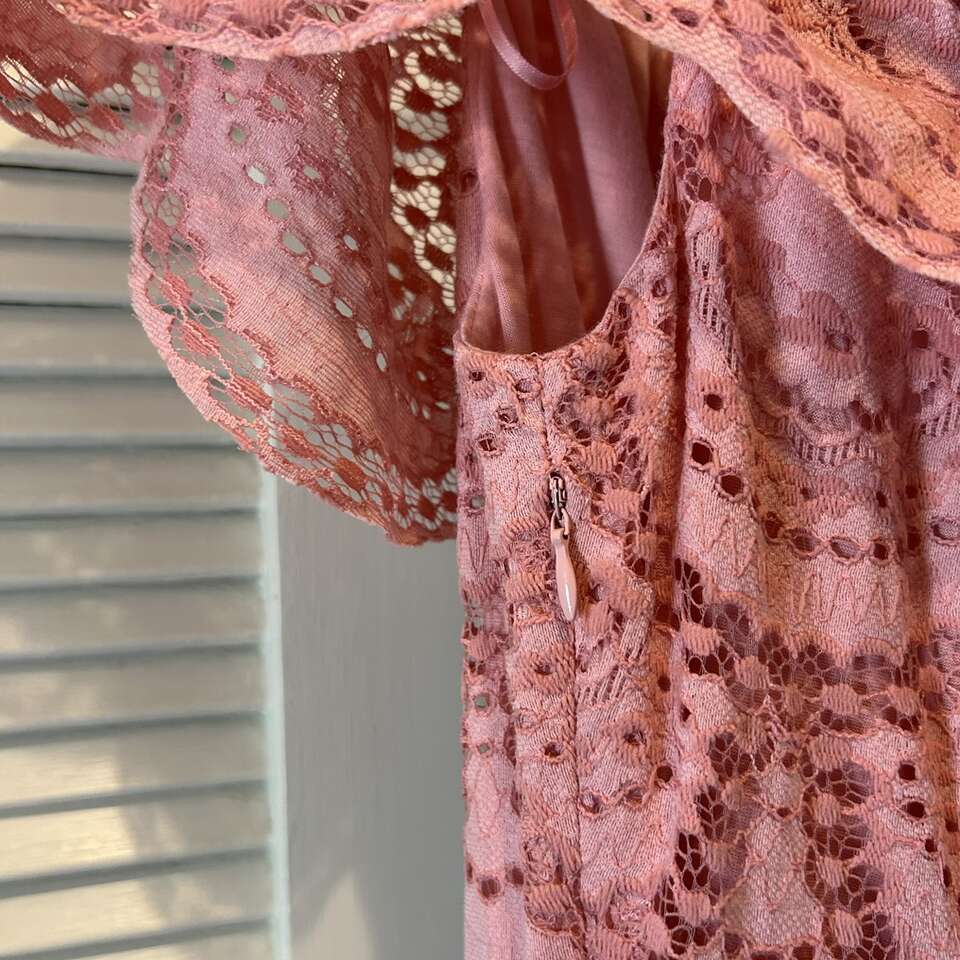 Gently used beautiful “Gianni Bini” maxi dress of pink eyelet lace with versatile bodice: dress can be worn off-the-Shoulder or On-the-shoulder. Floor length with a swingy double 12” lace at the hem, this dress can be relaxed for a BBQ or dress it up with accessories for a night out. Elastic is in great condition. Fully lined from the neckline to the top of the bottom ruffle. Lining is soft & lightly stretchy for maximum comfort.