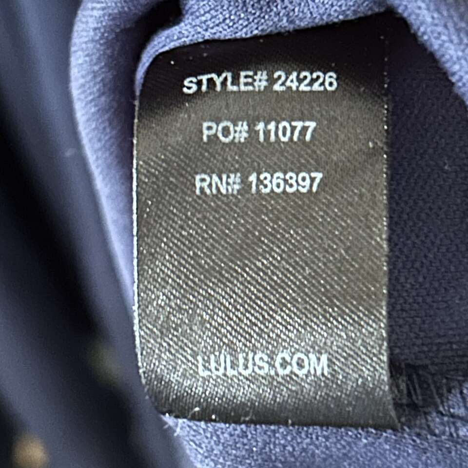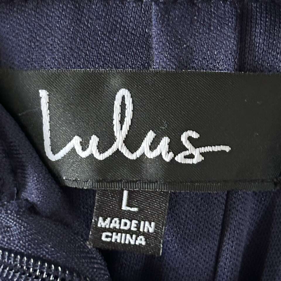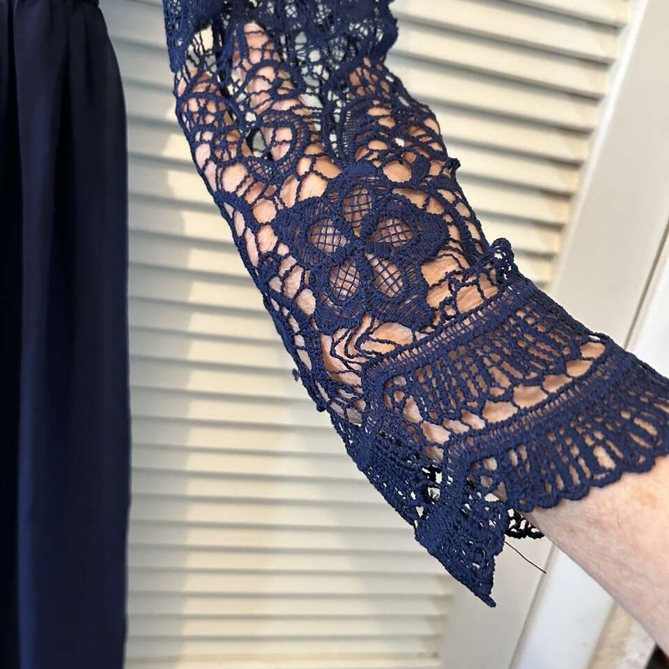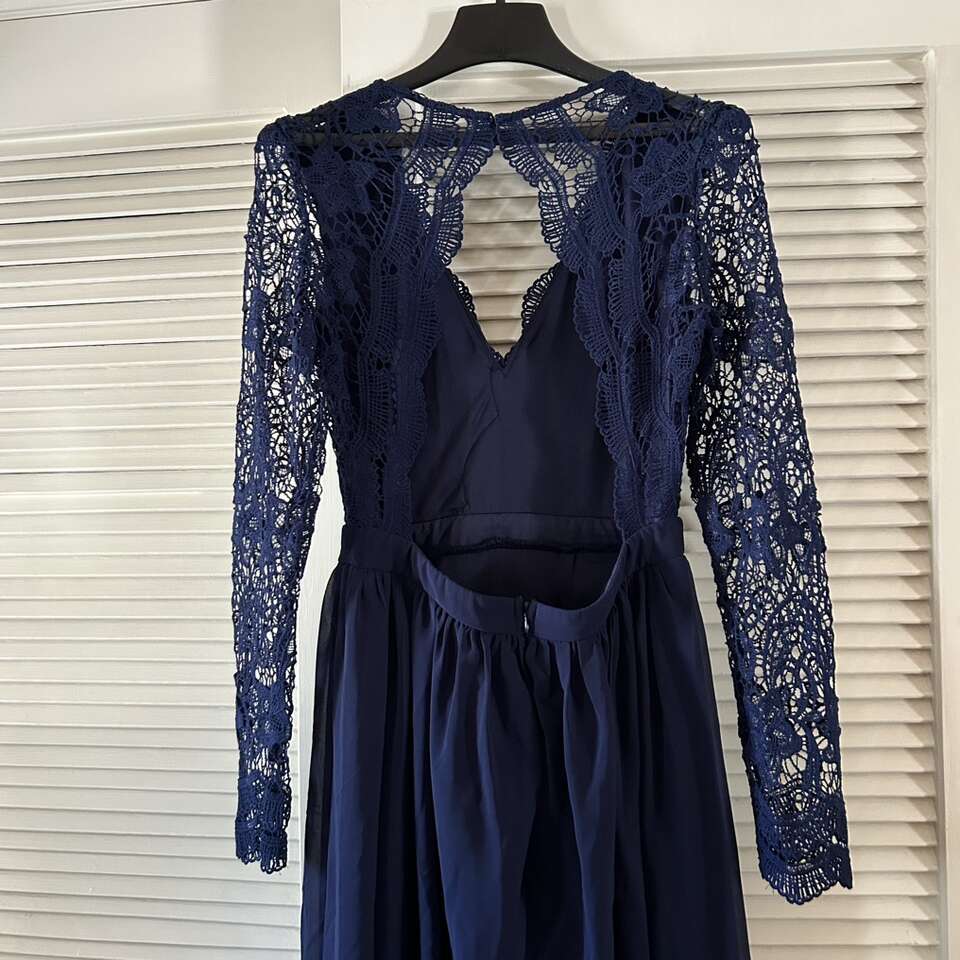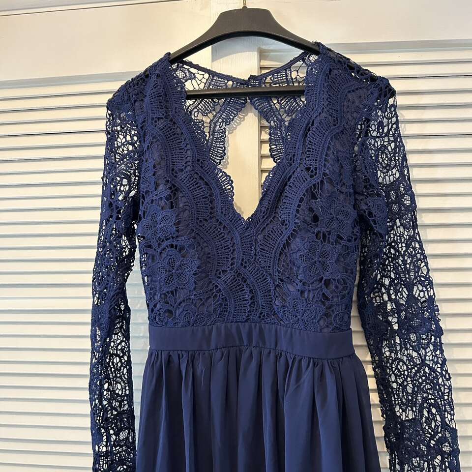 Gently used Vintage Formal dress by Lulus in Mint Condition. Lined Lace Bodice in front with a provocative open back and long unlined lace sleeves. Softly gathered sheer navy blue chiffon over lightly stretchy polyester maxi skirt provides a flowing generous skirt & adds to the beauty of this timeless evening gown.