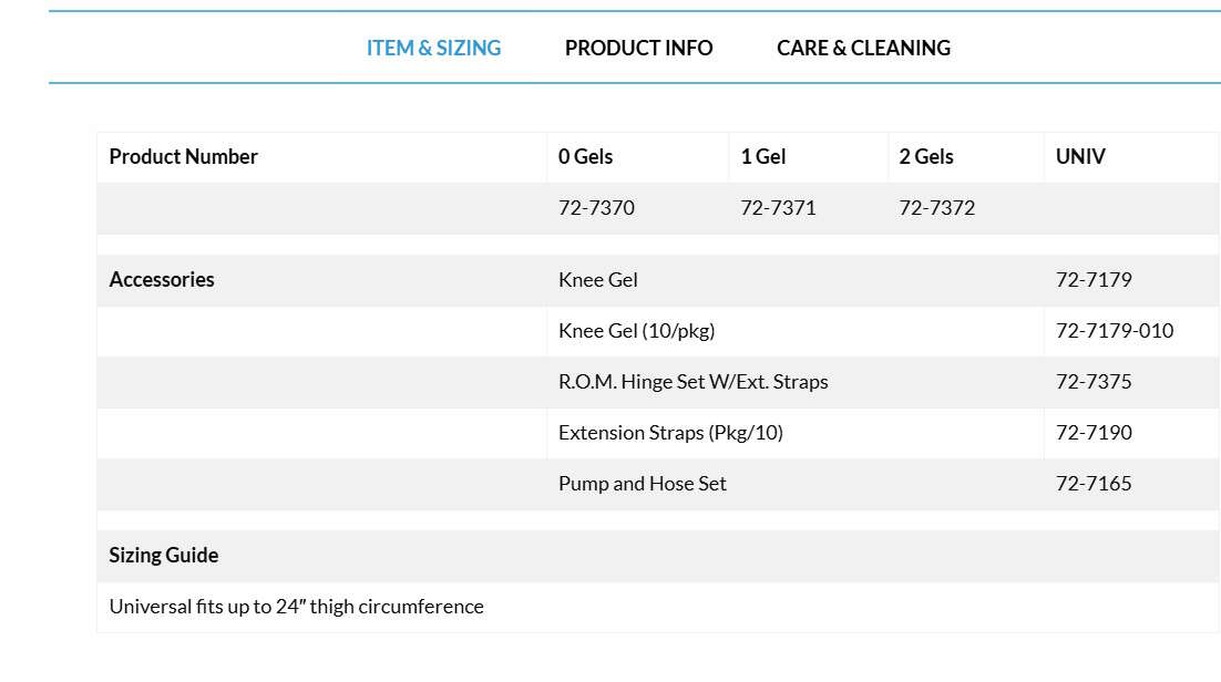 Features ROM Hinges with malleable aluminum uprights offering full flexion and extension control with settings at 0º, 15º, 30º and 90º. Indicated following ACL repair, post total joint surgery, meniscal tears, patella realignment or during rehabilitation. Manufactured from plush foam laminate with hook and loop closures; reusable gel packs feature soft fabric lining and non-toxic gel; includes two aluminum ROM hinges with plastic covers and extension straps.