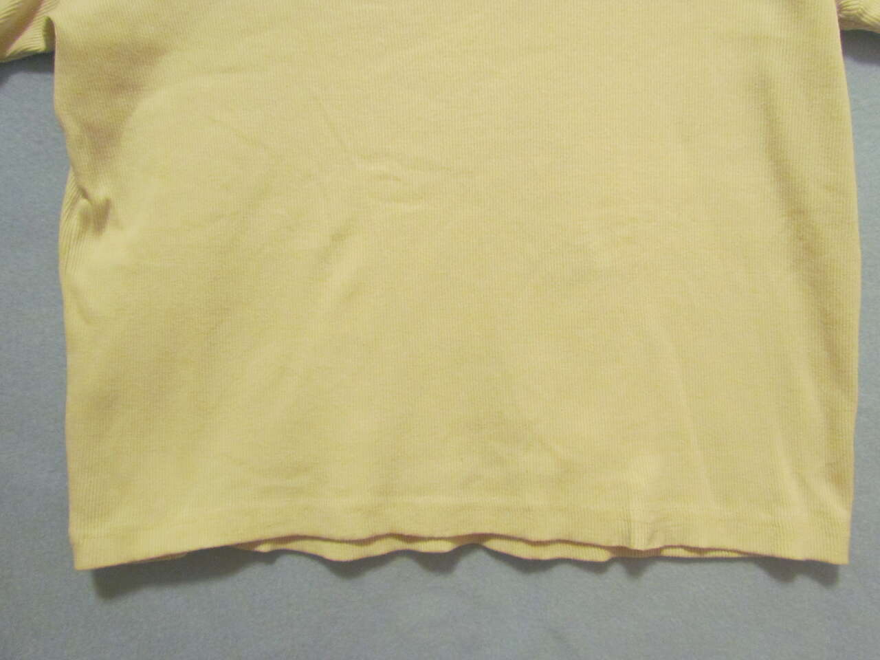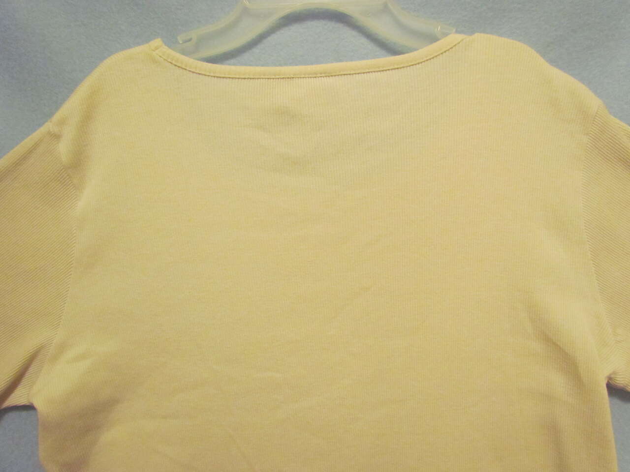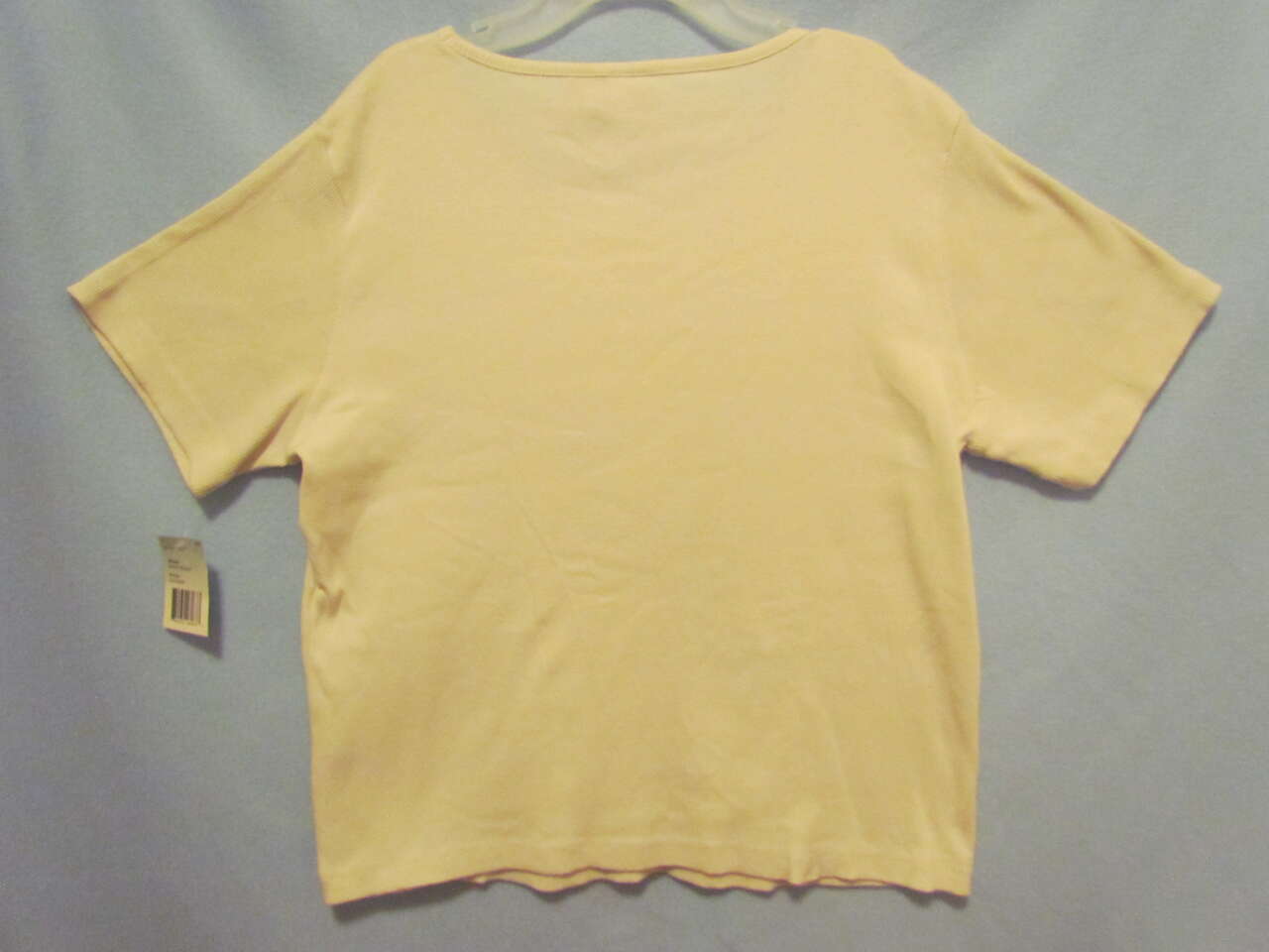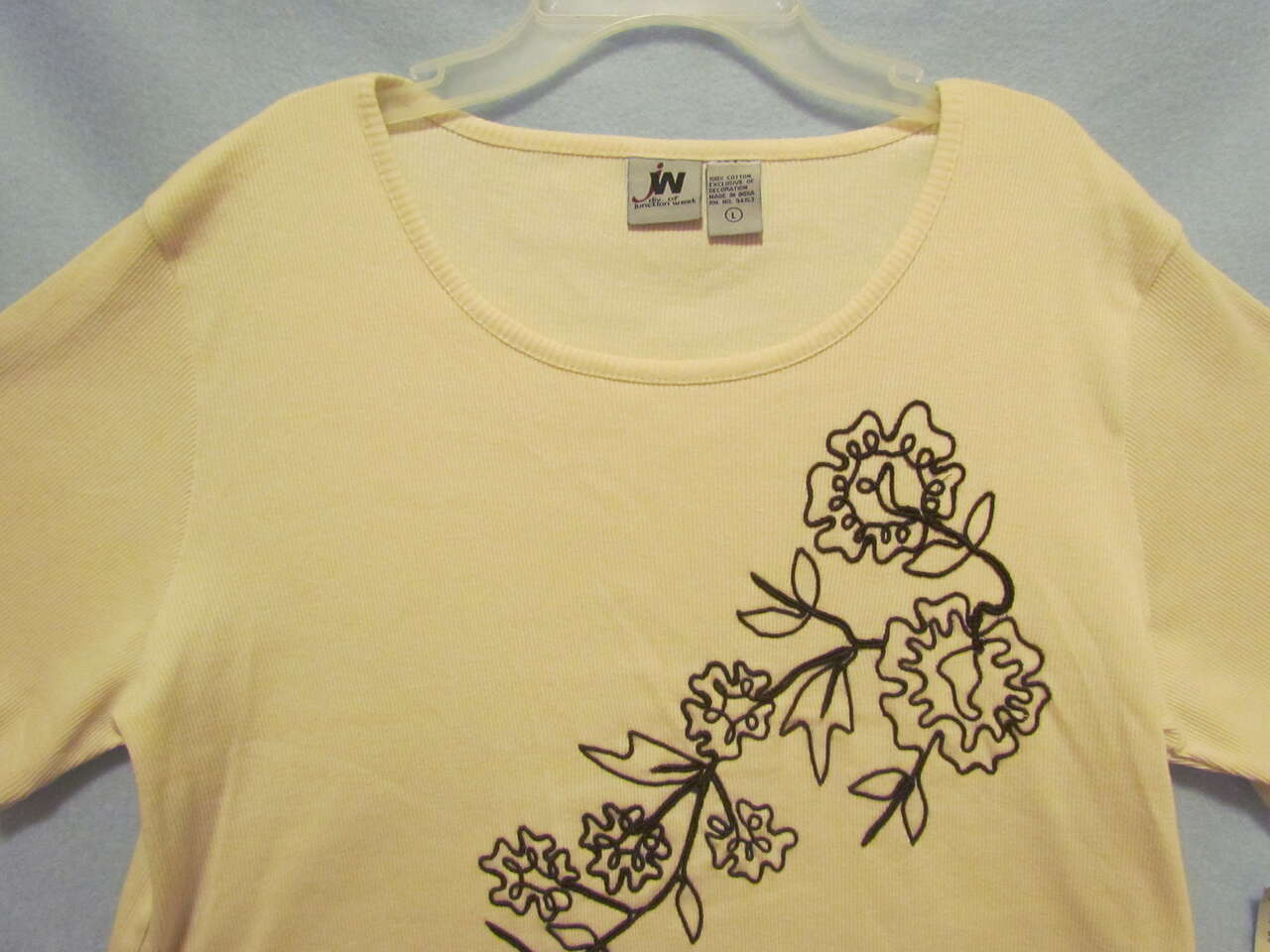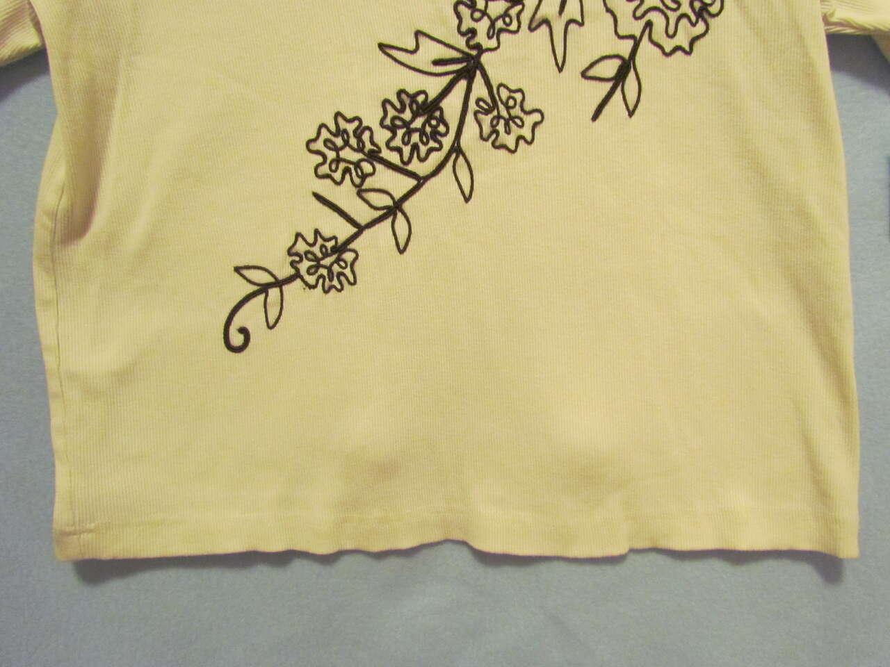 New with tags, this lovely, light weight shirt will look great on any woman, keep her cool in the warmer months of the year, and is made with a soft, ribbed, comfortable material that has some stretch to it. It is a cream color with an attractive floral leaf flower vine design stitched on the front.