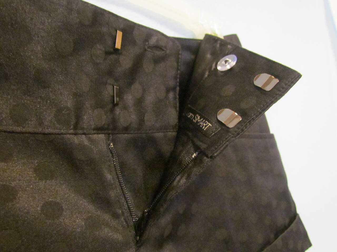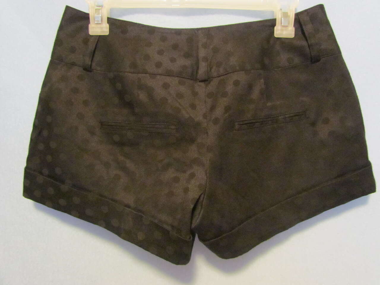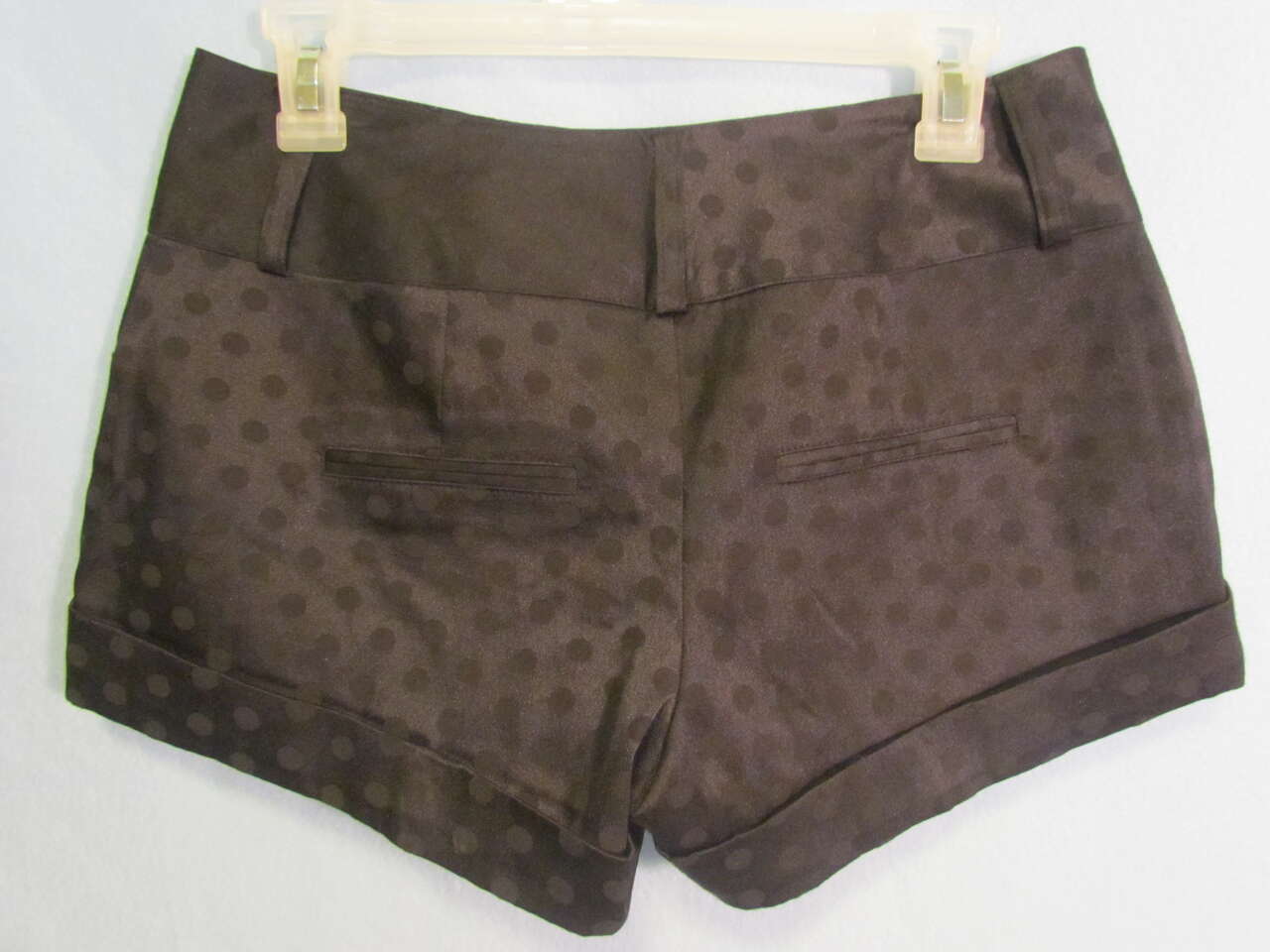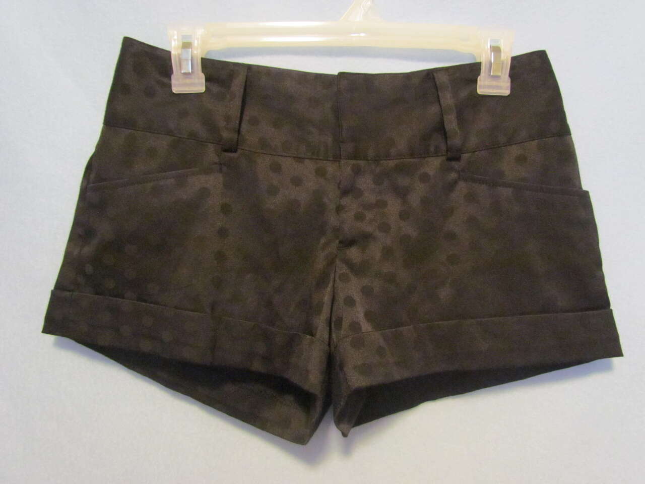 Pre-0wed and gently worn only a few times, these dressy shorts will look great for any occasion. They are a shiny black with black polka dots, have two front pockets, a zipper, and 2 fasteners with a button in front.