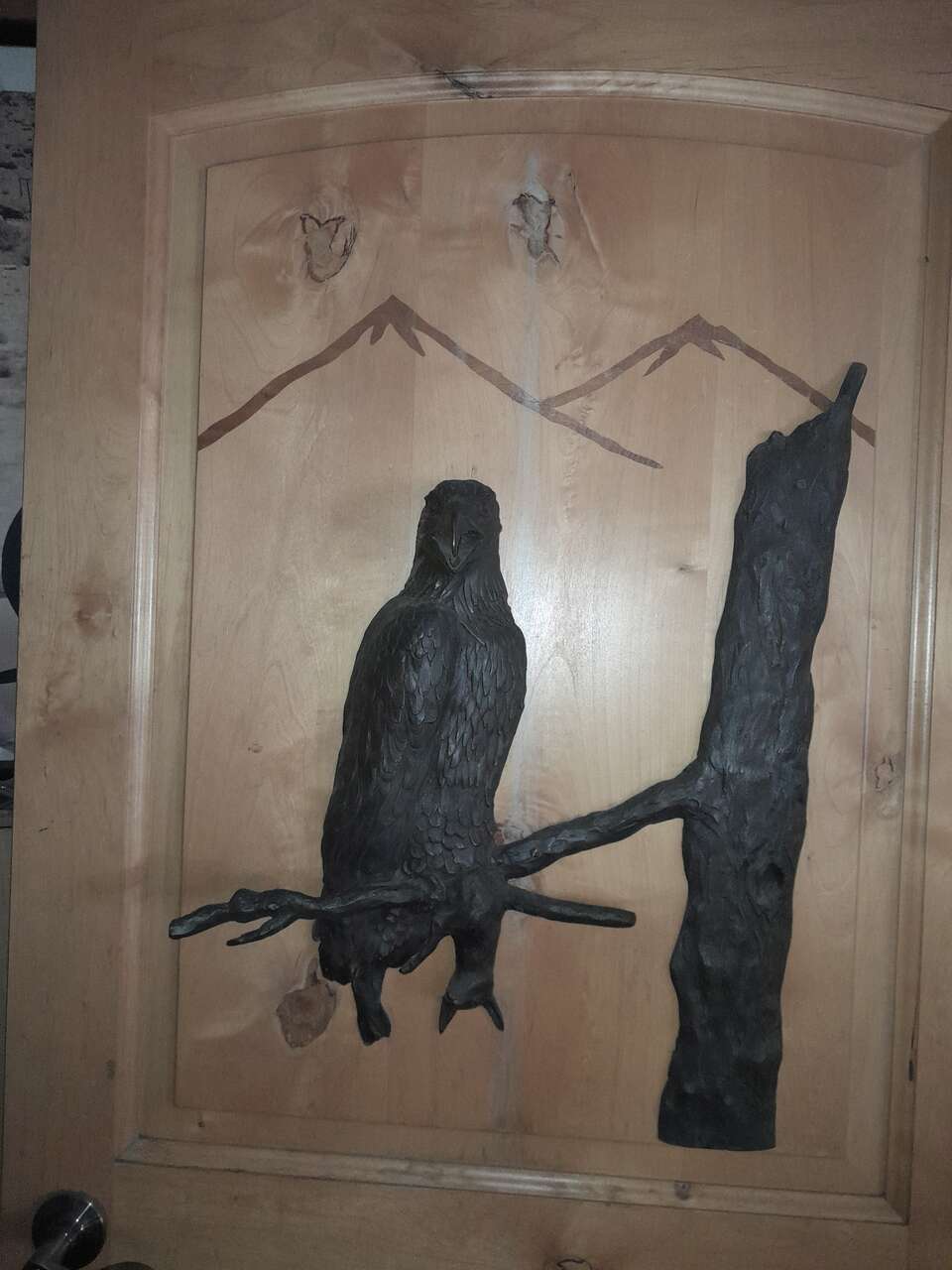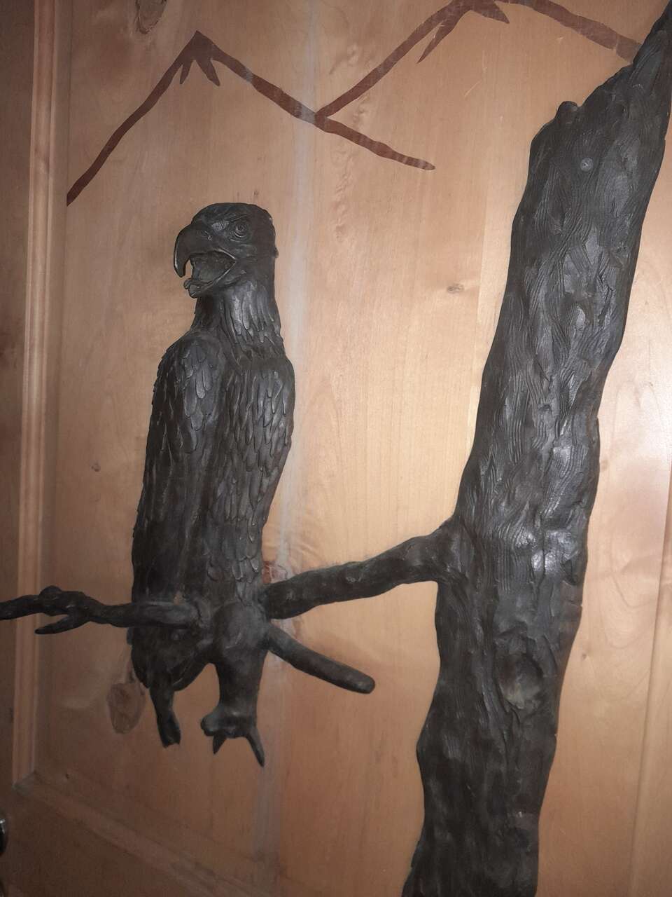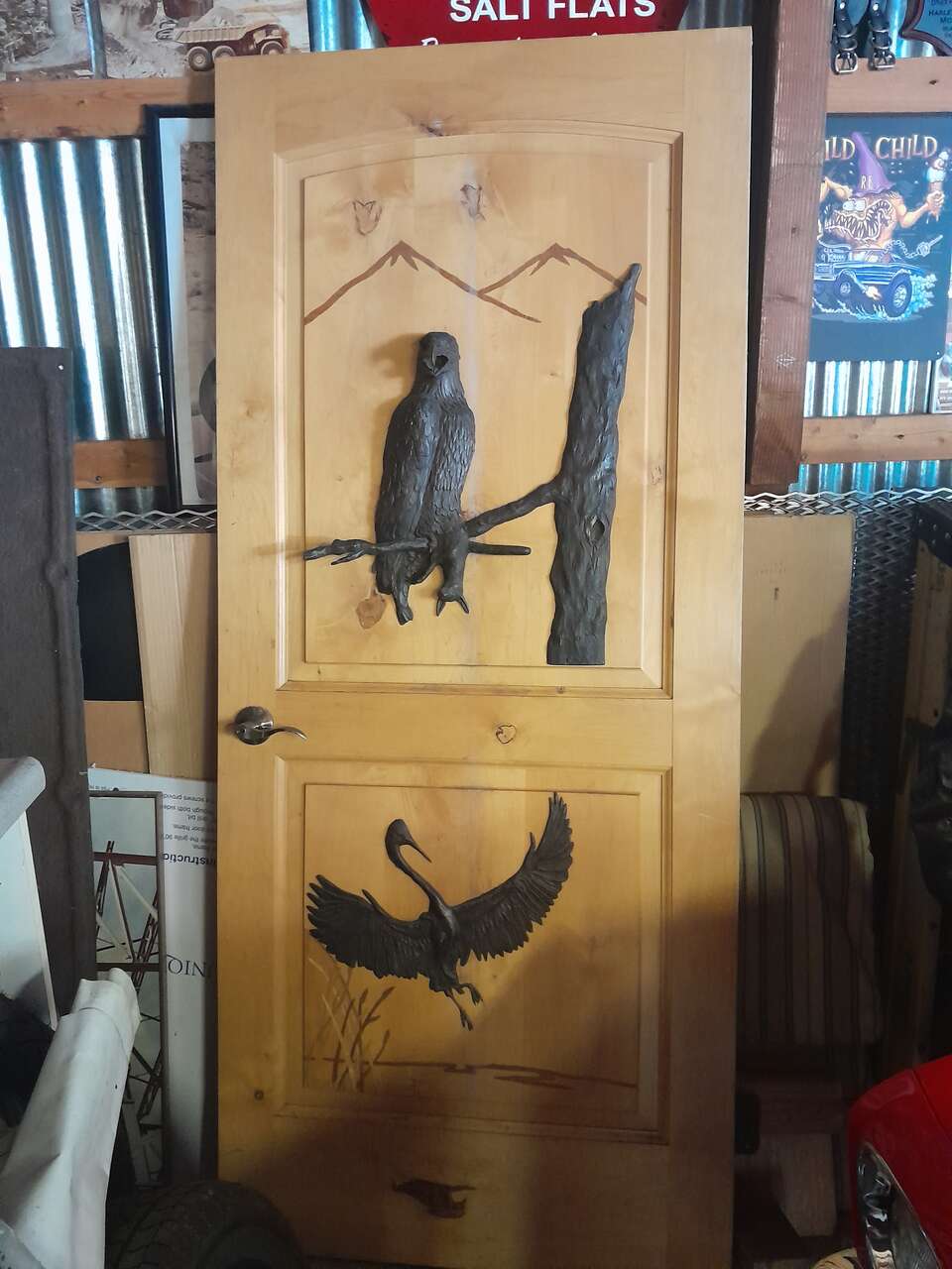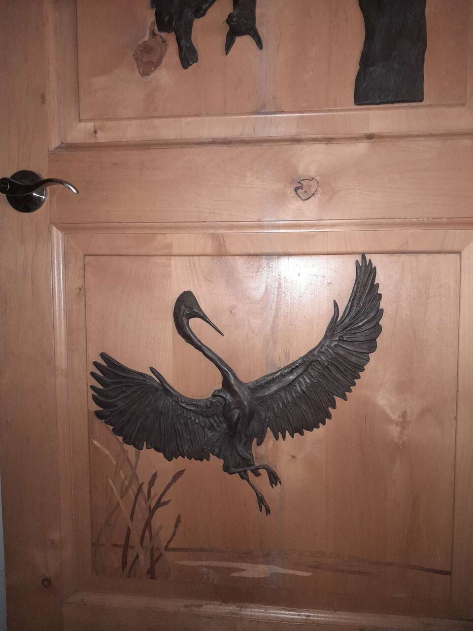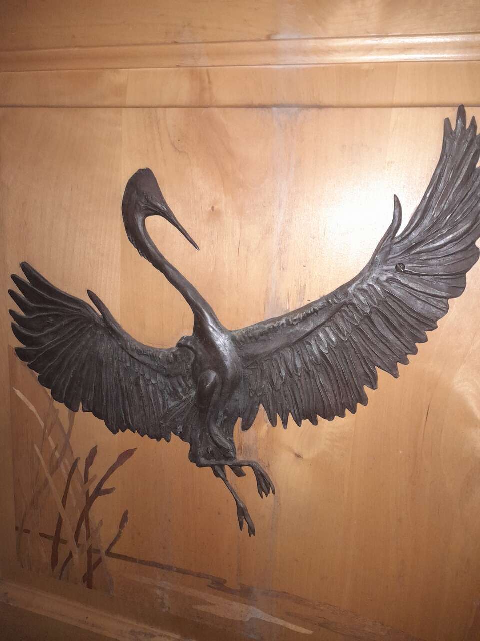 Custom made bronze Sand Hill Crane landing in tall inlaid grass.