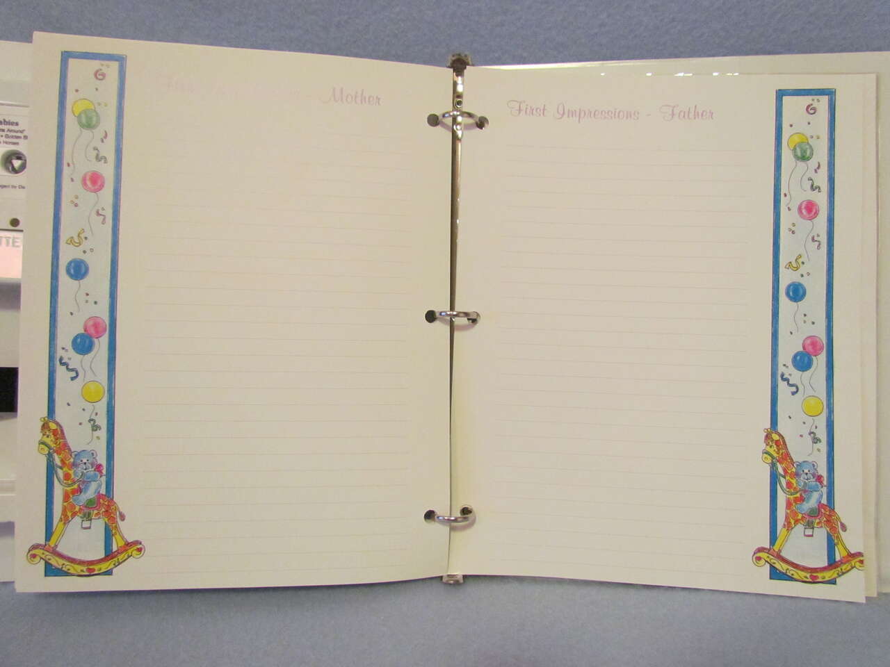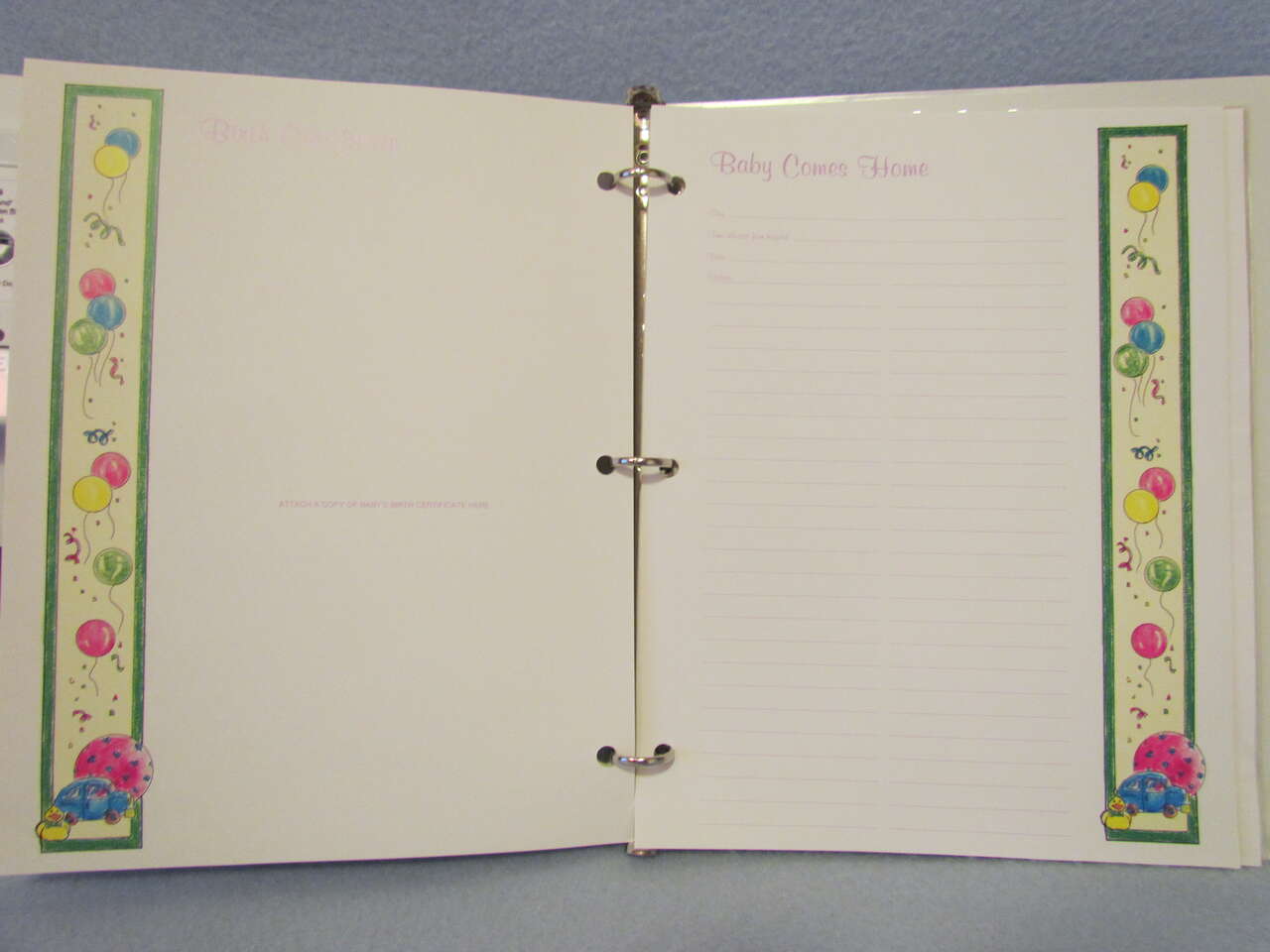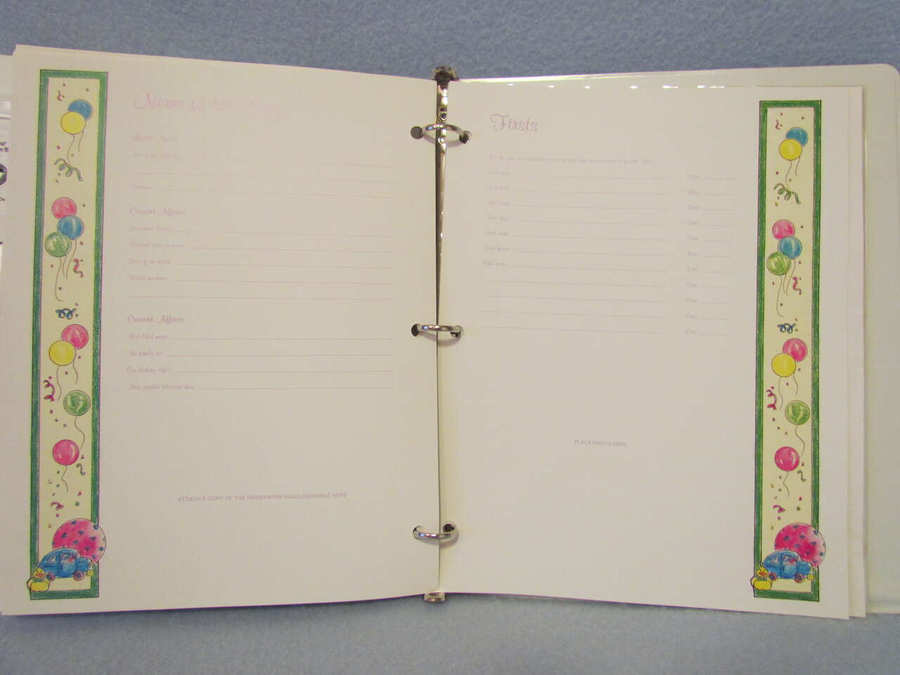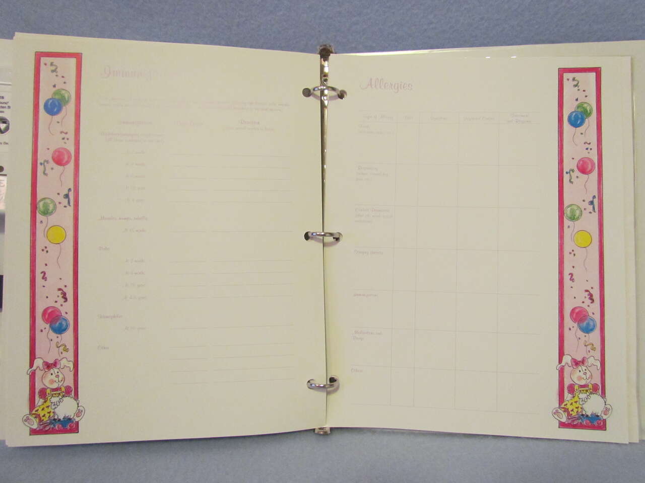 This book has space to record babyās first five years. It has a metal 3-ring binder with an elephant, bird, and sun on the front with colorful polka-dots, flower, and balloon. Book measures approximately 9-1/2ā wide x 10-3/4ā high. There are 22 sheets/44 pages inside it. An unused book would have 36 sheets/72 pages, so 14 sheets/28 pages are not in here. (Sheet = Front & Back of a paper; Page = one side of a Sheet) But the pages listed below are in this book and are clean/unused.