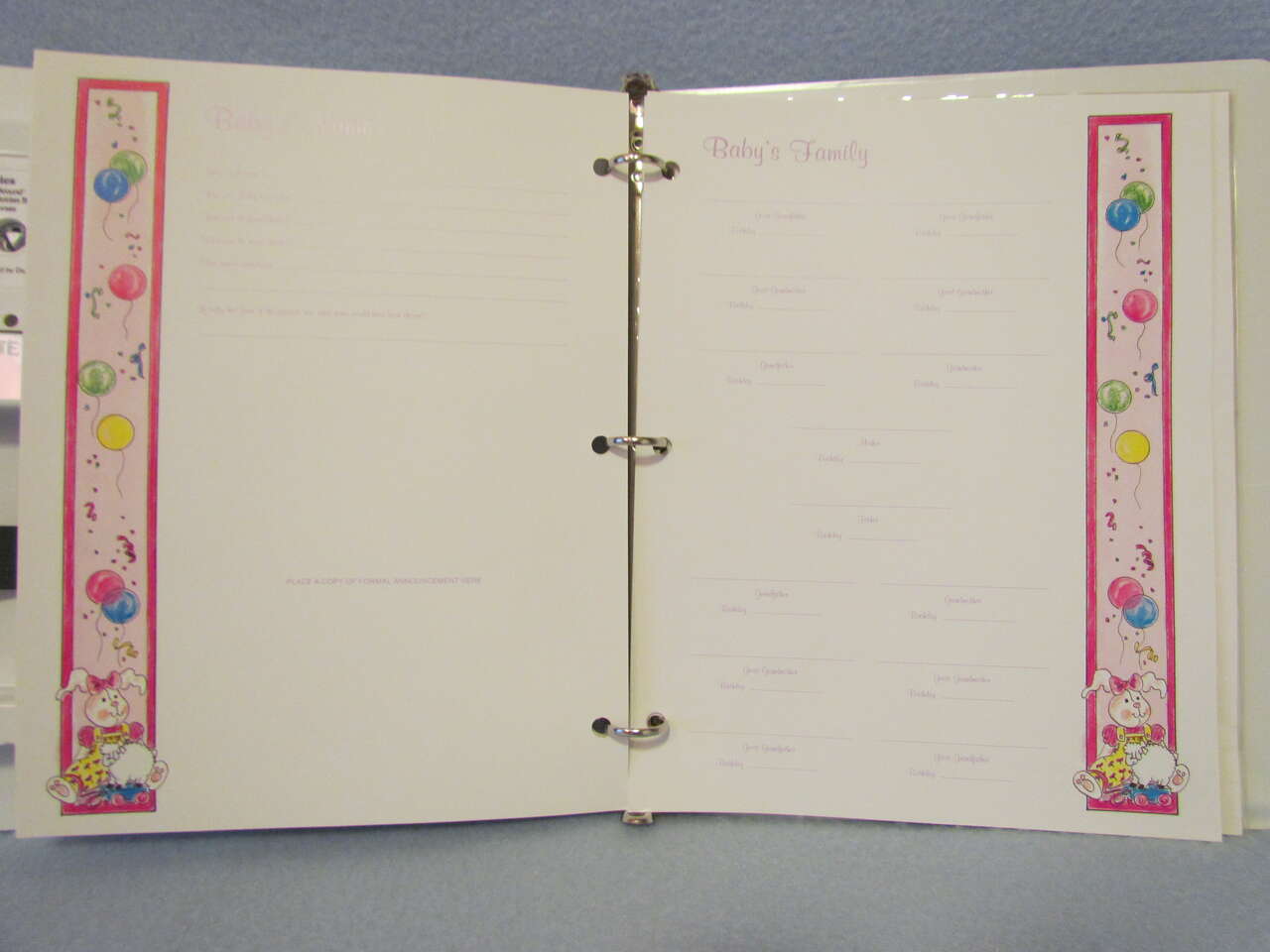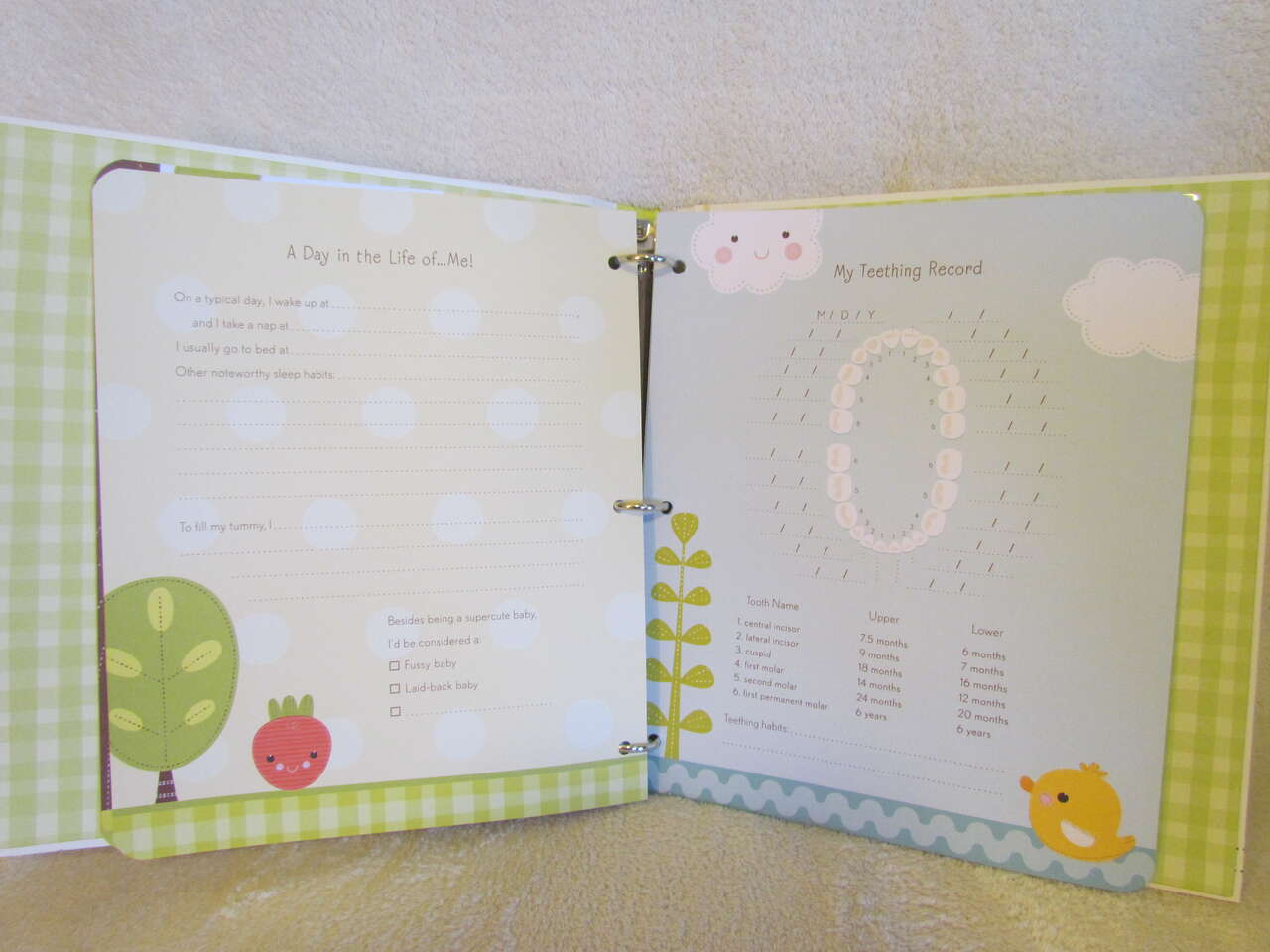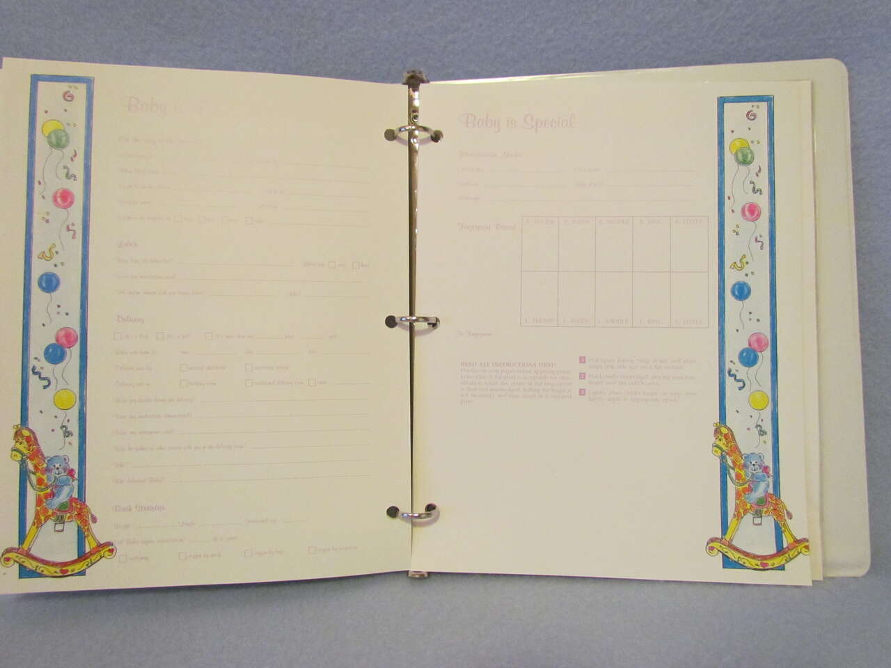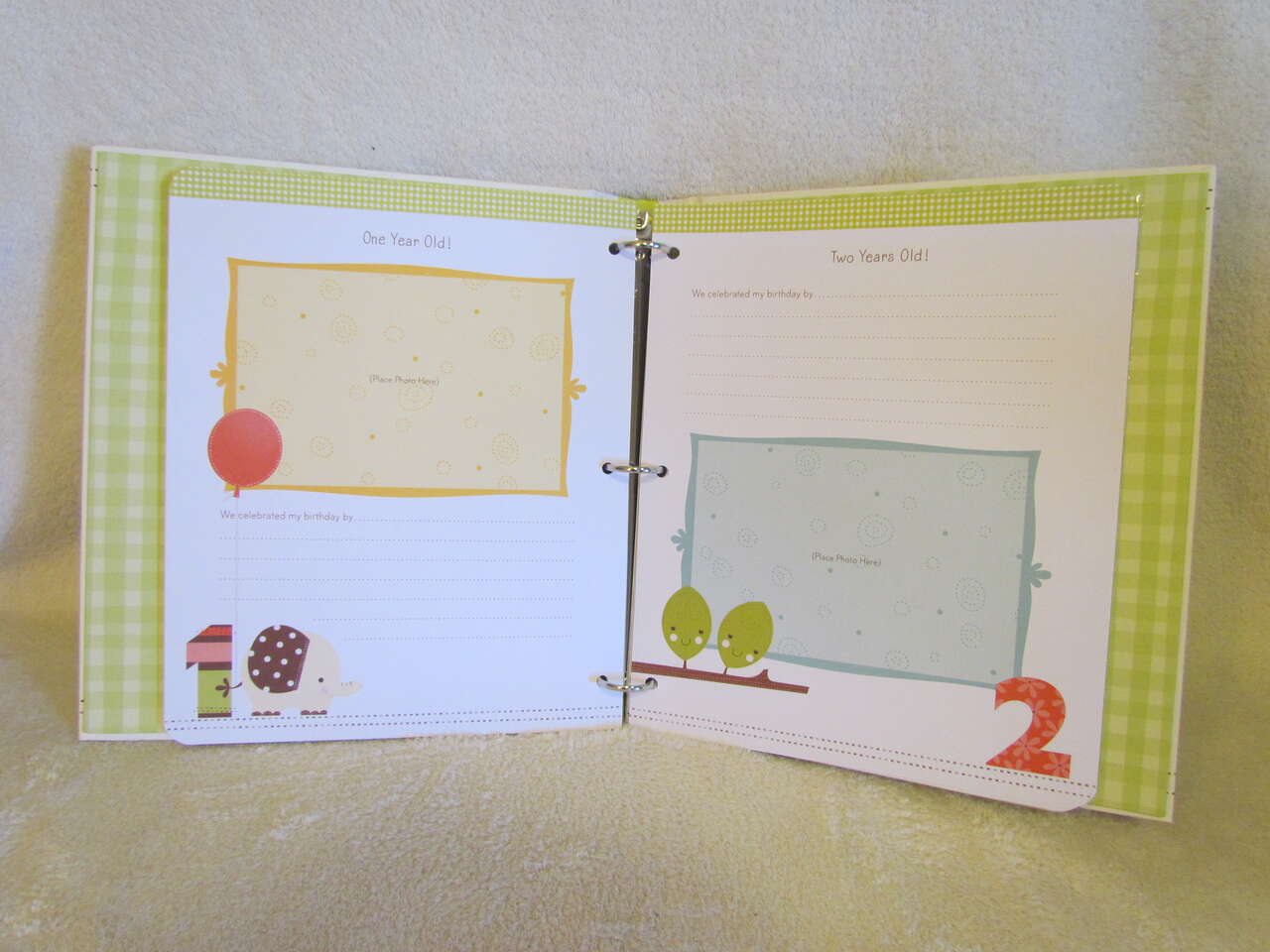 This book has space to record babyās first five years. It has a metal 3-ring binder with an elephant, bird, and sun on the front with colorful polka-dots, flower, and balloon. Book measures approximately 9-1/2ā wide x 10-3/4ā high. There are 22 sheets/44 pages inside it. An unused book would have 36 sheets/72 pages, so 14 sheets/28 pages are not in here. (Sheet = Front & Back of a paper; Page = one side of a Sheet) But the pages listed below are in this book and are clean/unused.