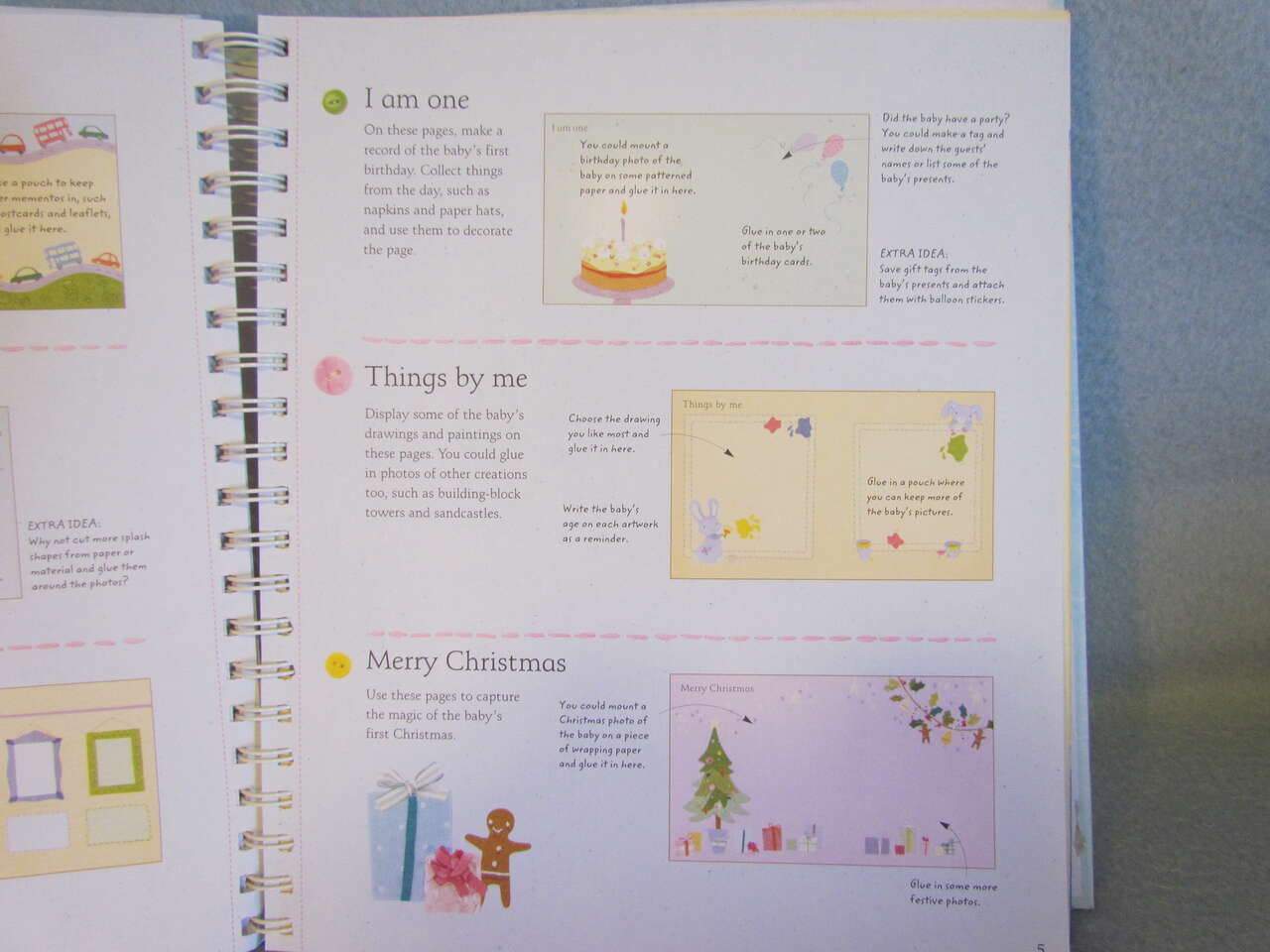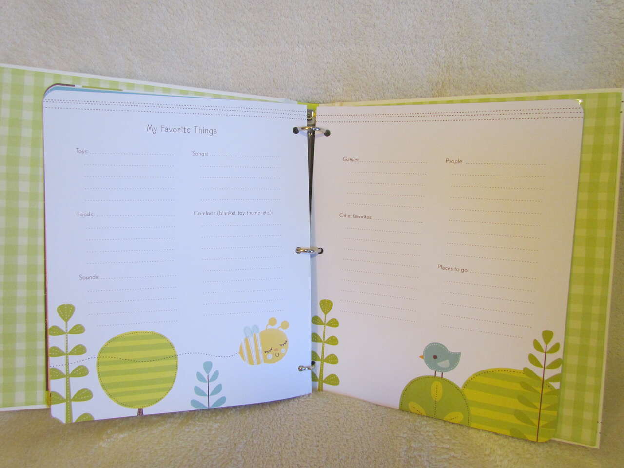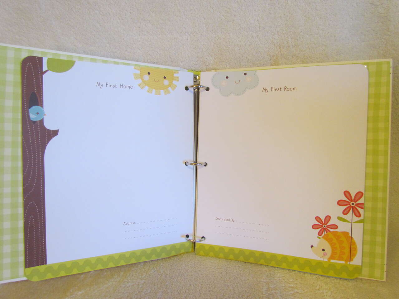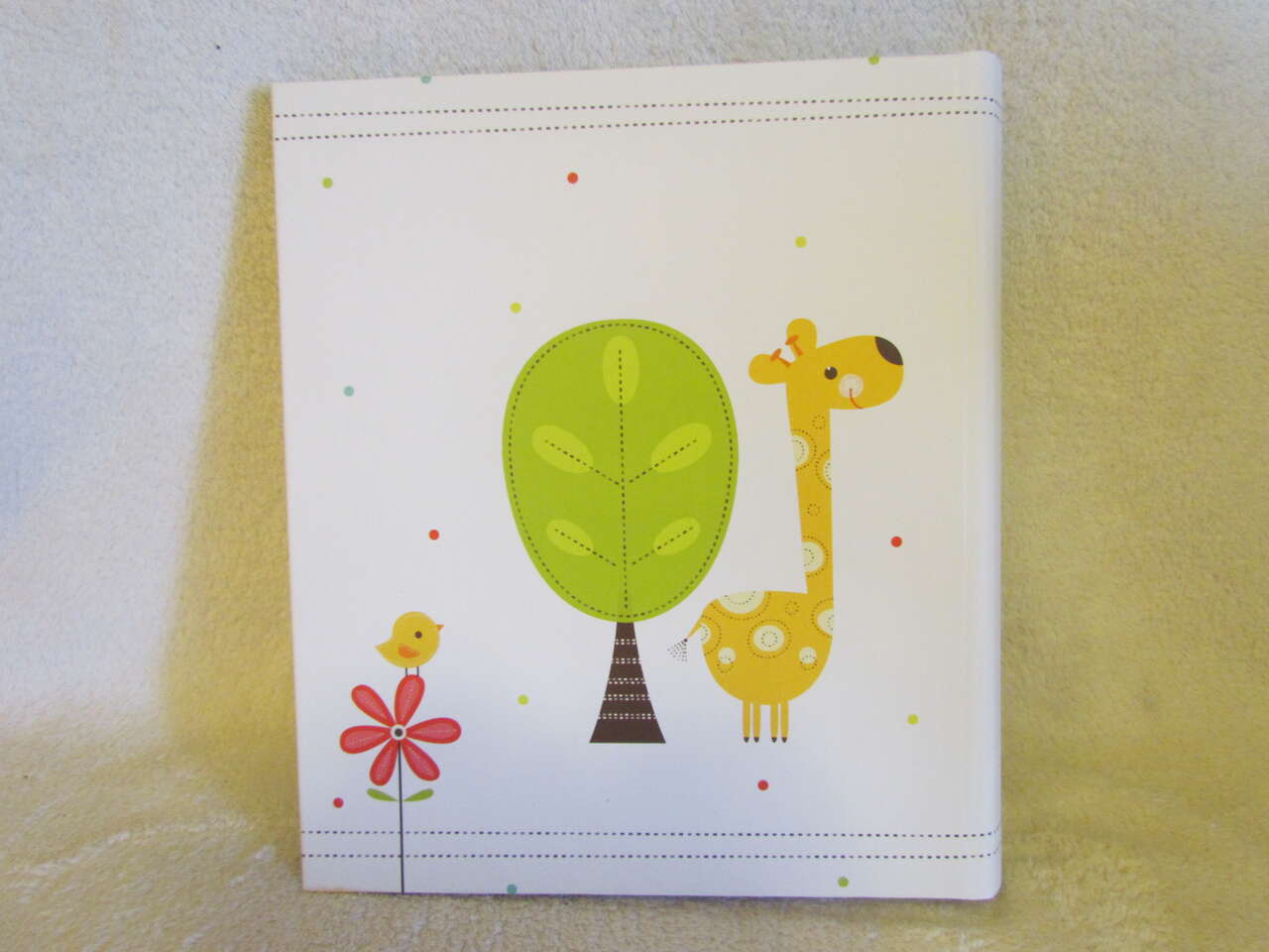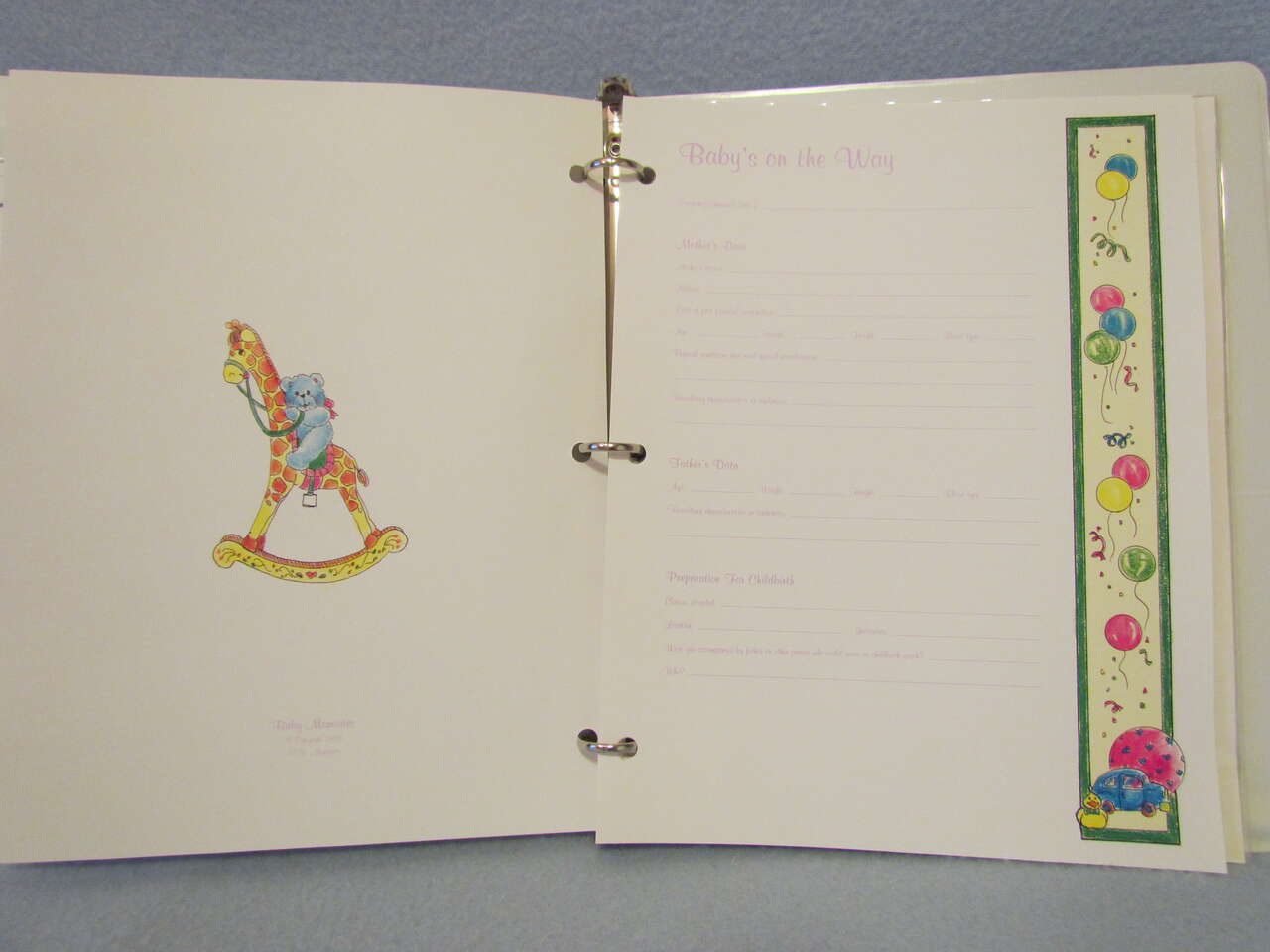 This book has space to record babyās first five years. It has a metal 3-ring binder with an elephant, bird, and sun on the front with colorful polka-dots, flower, and balloon. Book measures approximately 9-1/2ā wide x 10-3/4ā high. There are 22 sheets/44 pages inside it. An unused book would have 36 sheets/72 pages, so 14 sheets/28 pages are not in here. (Sheet = Front & Back of a paper; Page = one side of a Sheet) But the pages listed below are in this book and are clean/unused.