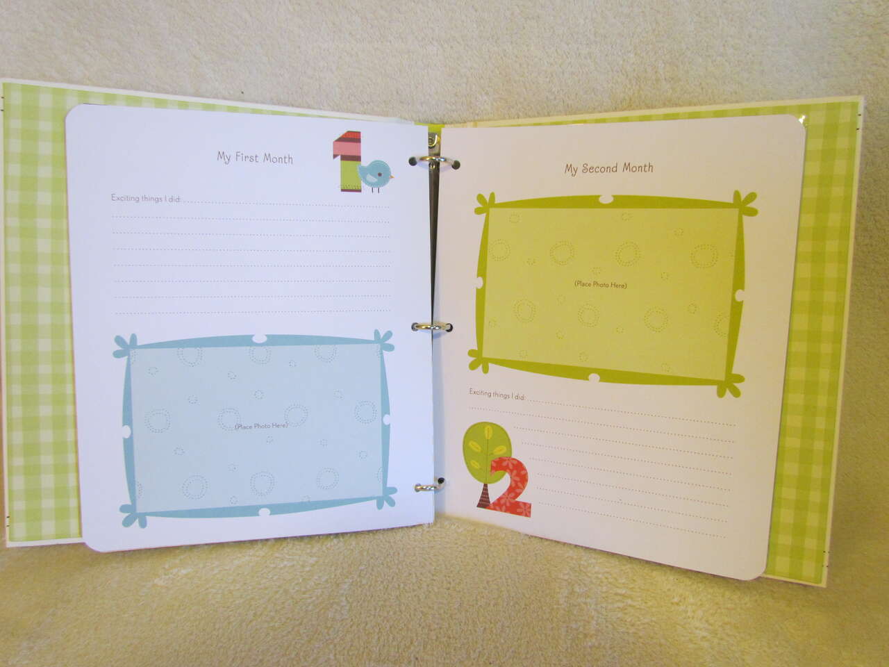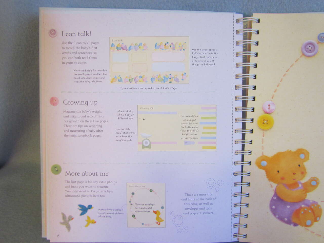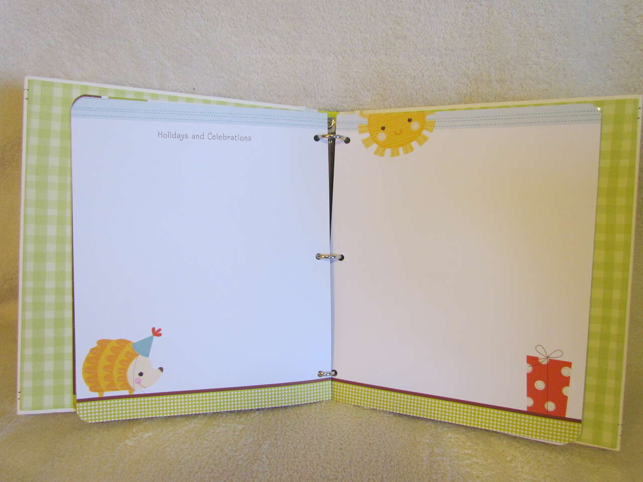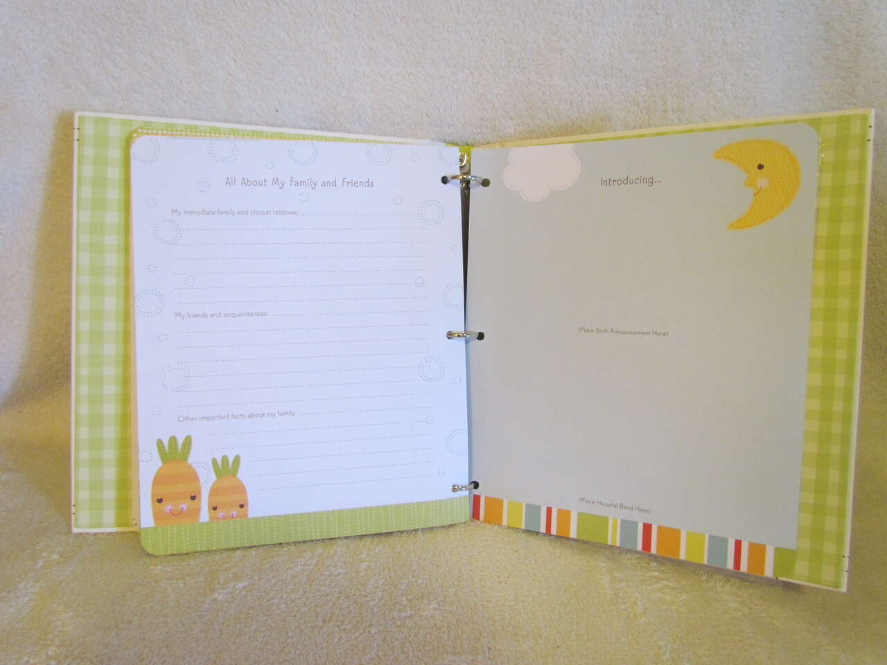 This book has space to record babyās first five years. It has a metal 3-ring binder with an elephant, bird, and sun on the front with colorful polka-dots, flower, and balloon. Book measures approximately 9-1/2ā wide x 10-3/4ā high. There are 22 sheets/44 pages inside it. An unused book would have 36 sheets/72 pages, so 14 sheets/28 pages are not in here. (Sheet = Front & Back of a paper; Page = one side of a Sheet) But the pages listed below are in this book and are clean/unused.