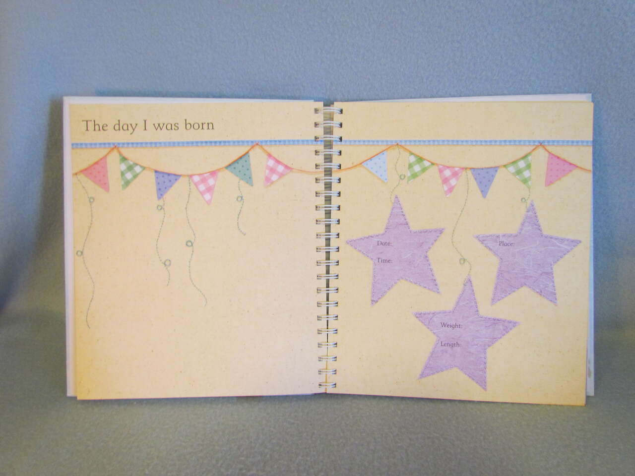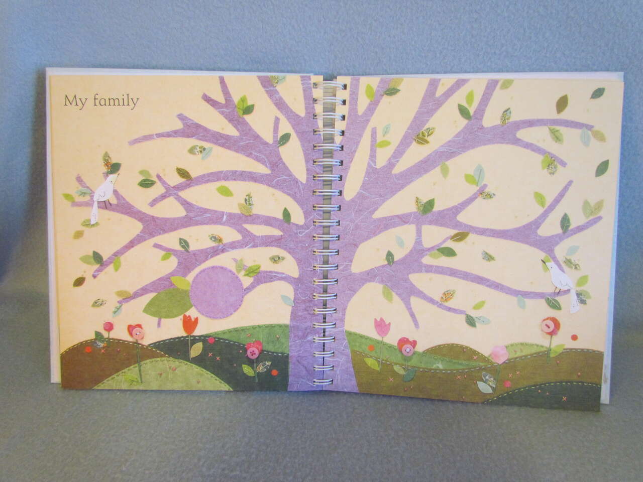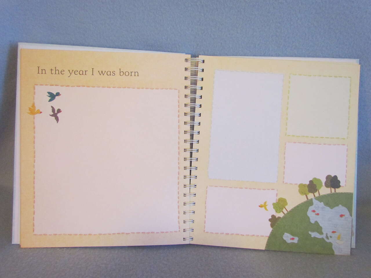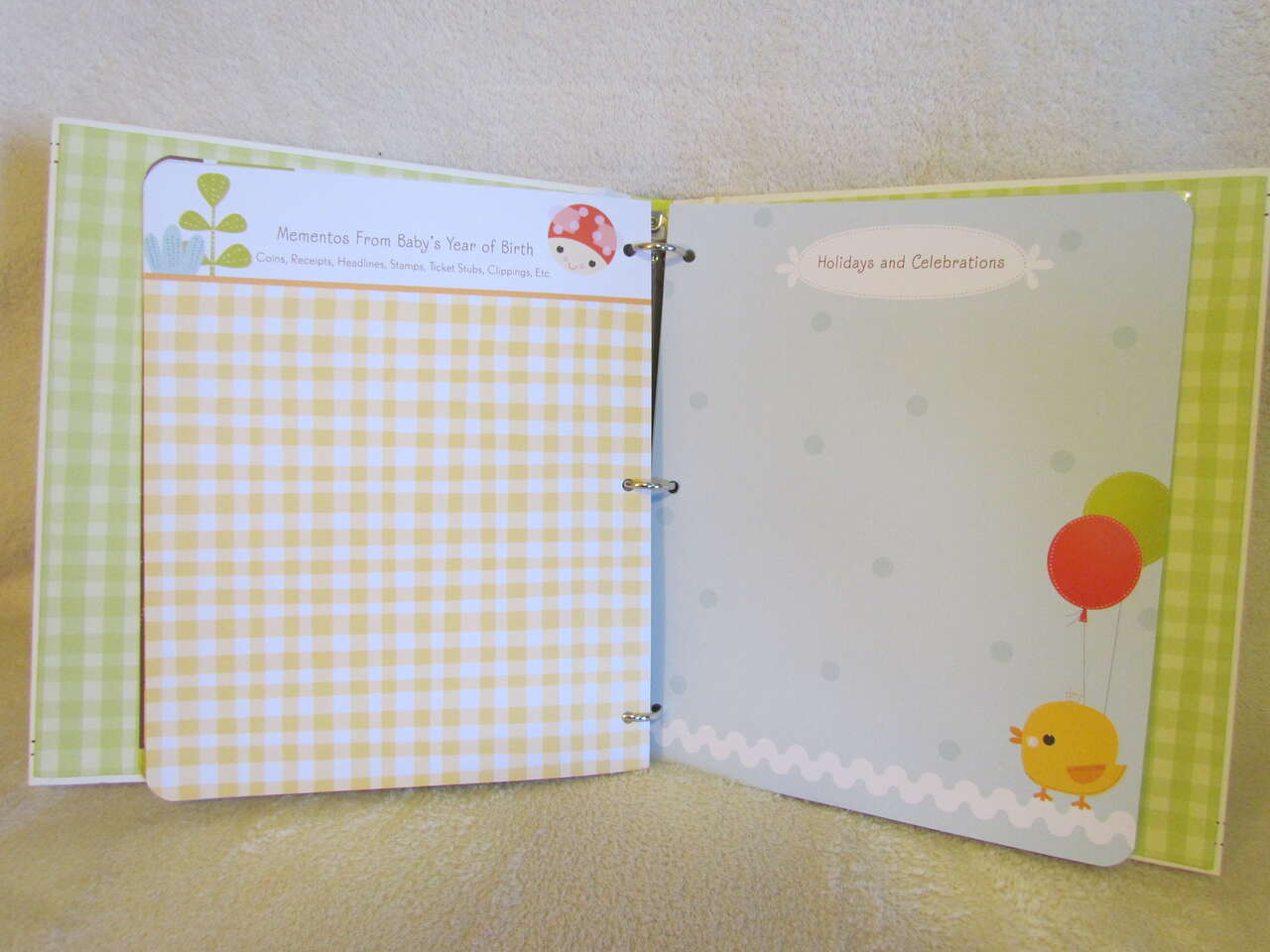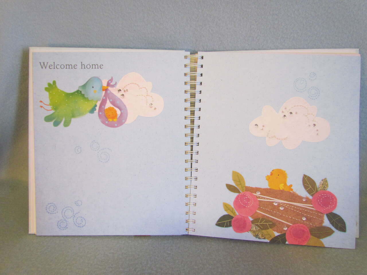 This book has space to record babyās first year. It has a metal ring binding with a baby in a bassinet hanging in a tree on the front with lots of colorful flowers, leaves, buttons, birds, and apples decorating it. Book measures approximately 10ā wide x 11ā high.
