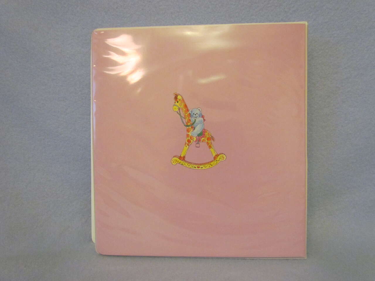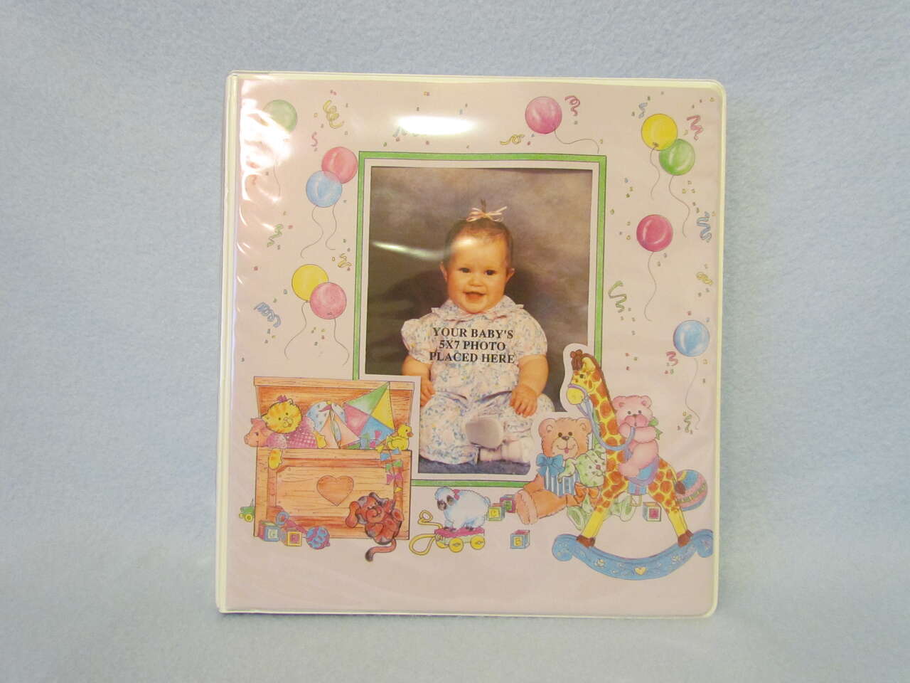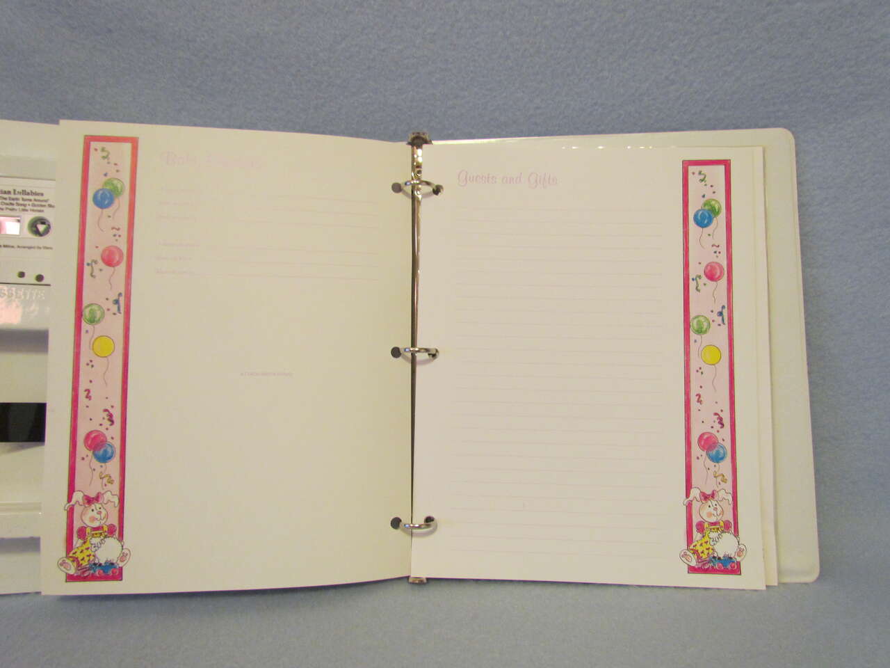 This book has space to record babyās first year. It is a 3-ring binder style & has an adorable decorated front cover with a balloons, a toy box filled with toys, a giraffe rocking āhorseā, confetti, & other fun toys. It has a 5x7 picture window to insert your precious little oneās photo. Approximately measures 10 ¾ x 11 ¾. A unique feature of this binder is it has a place to keep/insert a VHS tape (recordings of your little one), a clear box for precious keepsakes, & it has a cassette tape of Tender Christian Lullabies. So sweet!