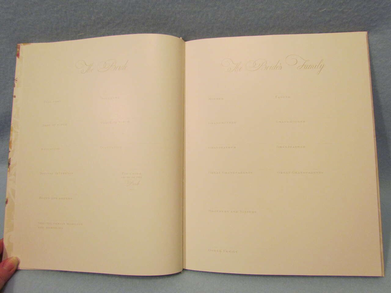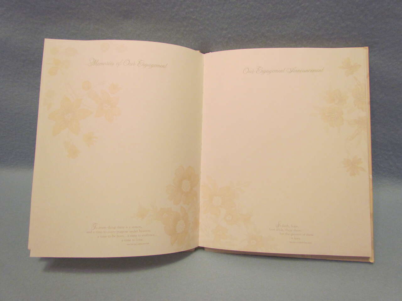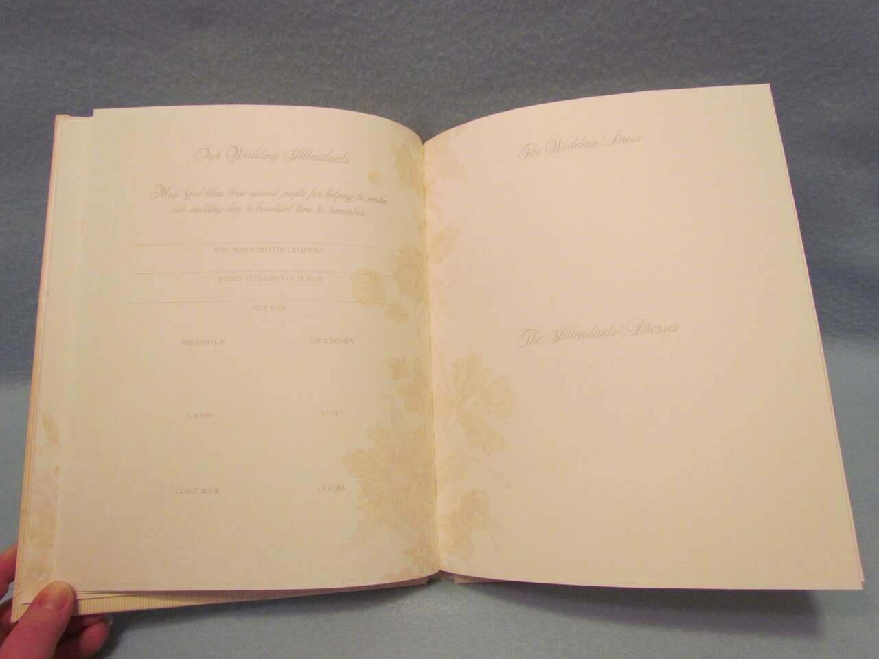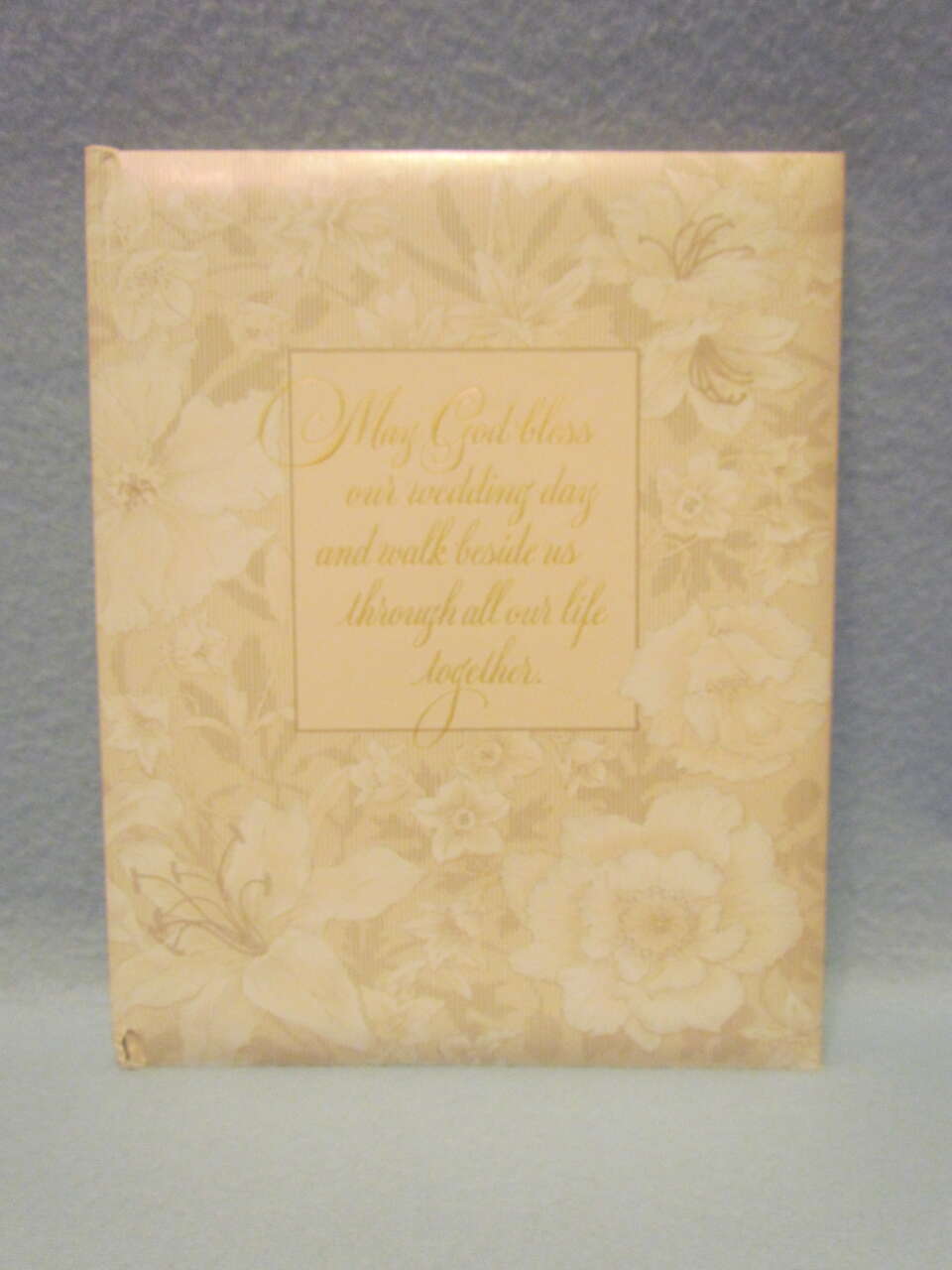This lovely Wedding Memory Book helps you record memories and mile stones of your courtship, engagement, and marriage on decorative pages. This book is now out of print and a rare find. It has a padded cover with a floral design and the words “May God bless our wedding day and walk beside us through all our life together.” in a light golden foil.