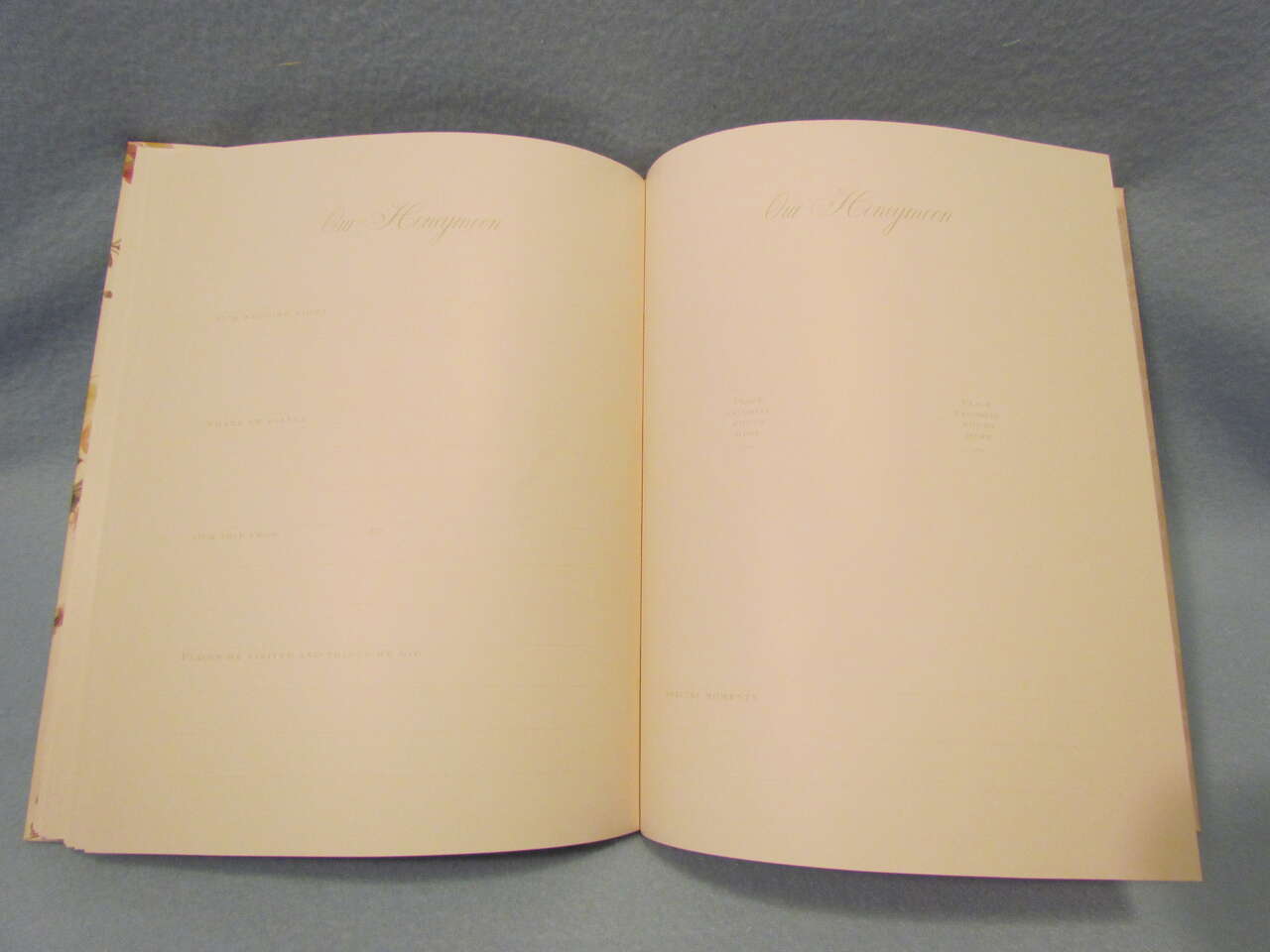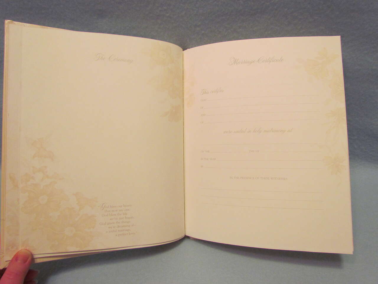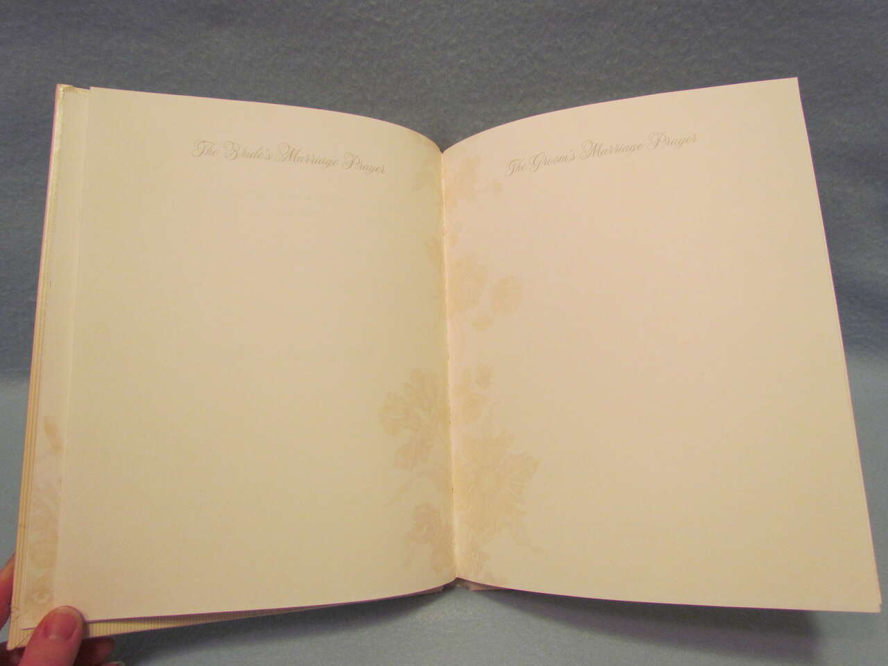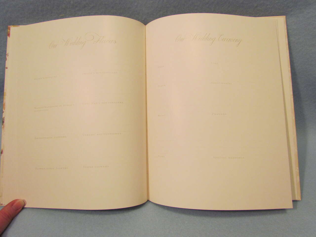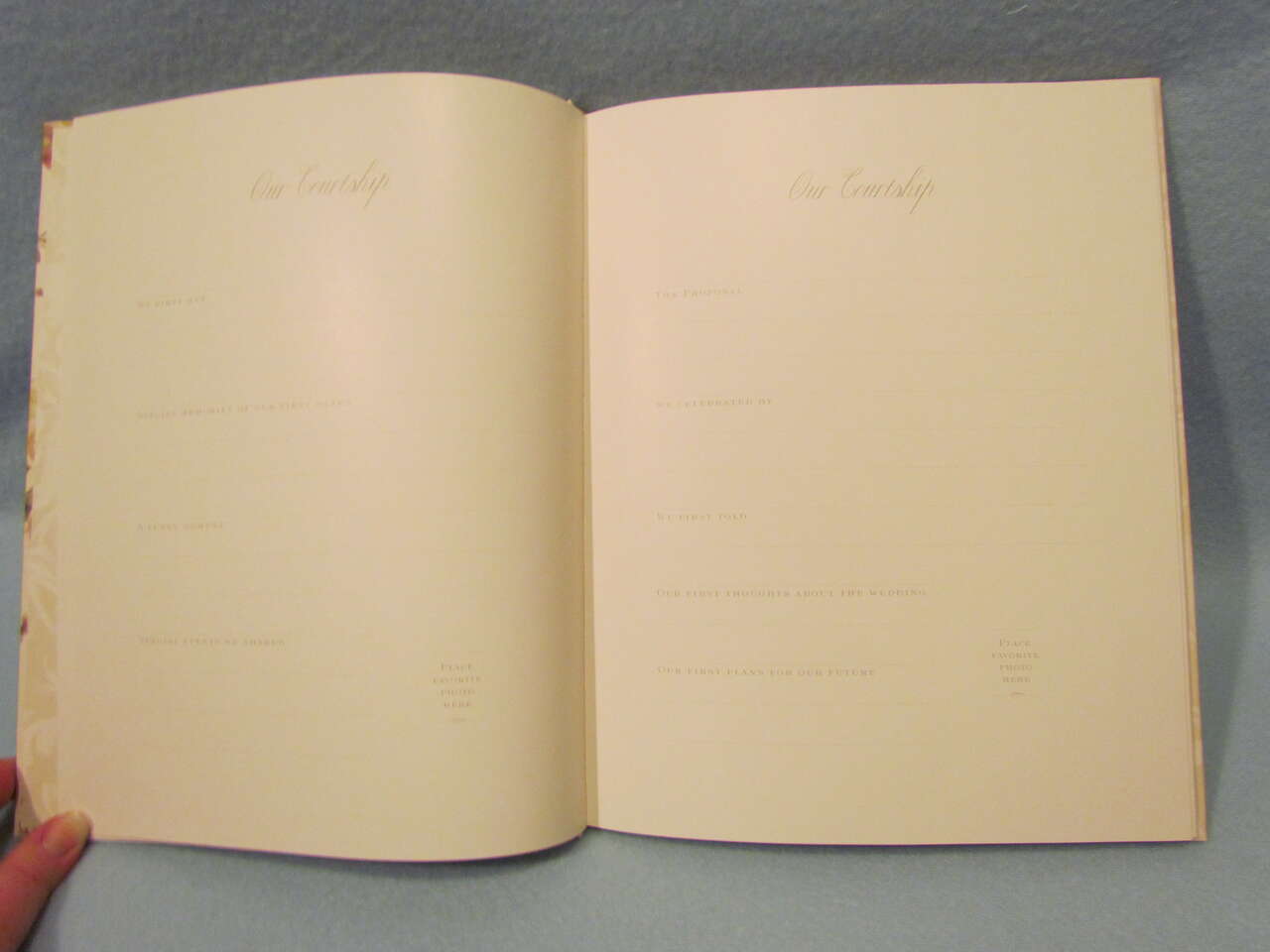 This lovely Wedding Memory Book helps you record memories and mile stones of your courtship, engagement, and marriage on decorative pages. This book is now out of print and a rare find. It has a padded cover with a floral design and the words “May God bless our wedding day and walk beside us through all our life together.” in a light golden foil.