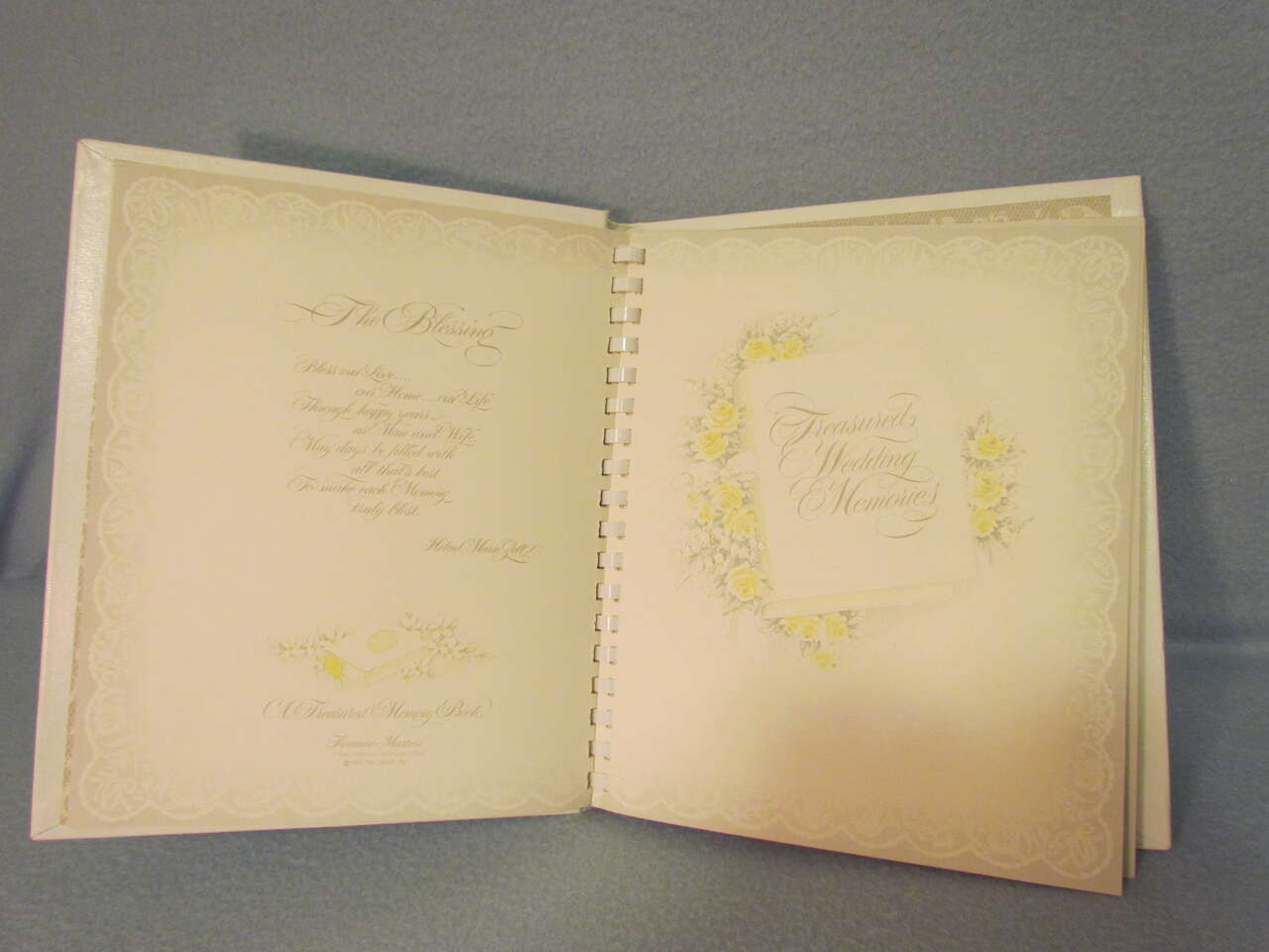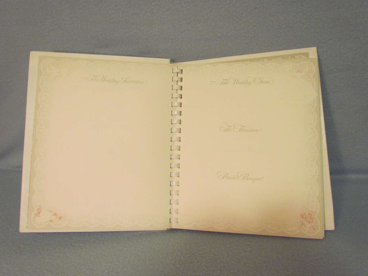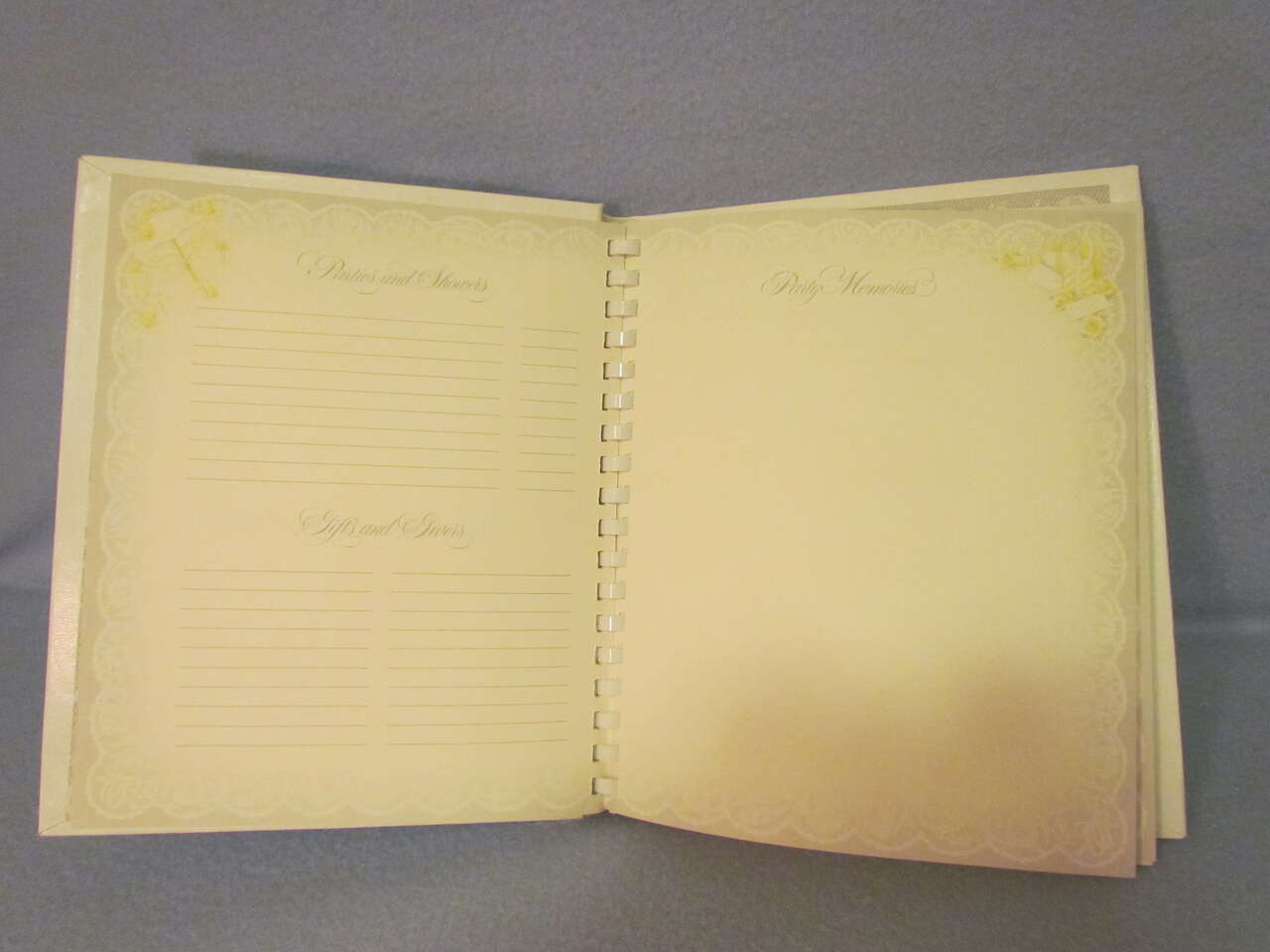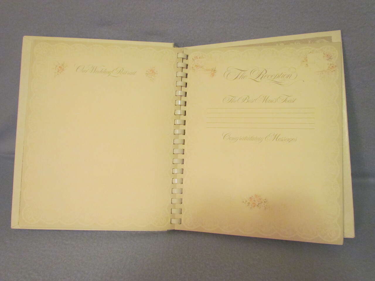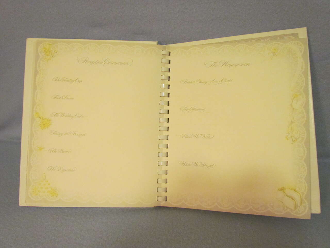 This lovely Wedding Memory Book helps you record memories and milestones of your courtship, engagement, and marriage on lovely decorative pages. This book is now out of print and a rare find. It has a hard cover with decorative doves, flowers, and wedding bells with the words “Our wedding” on the top in silver foil. It also has an oval picture frame to put your favorite wedding photo in it, thus personalizing your wedding memory book and has a comb binding. Pages are decorated with pink and yellow roses, doves, hearts, umbrellas, wedding bells, and ribbons & lace in a light greyish lace background with a touch of pink and yellow coloring it all throughout. It is timeless, elegant, and lovely.