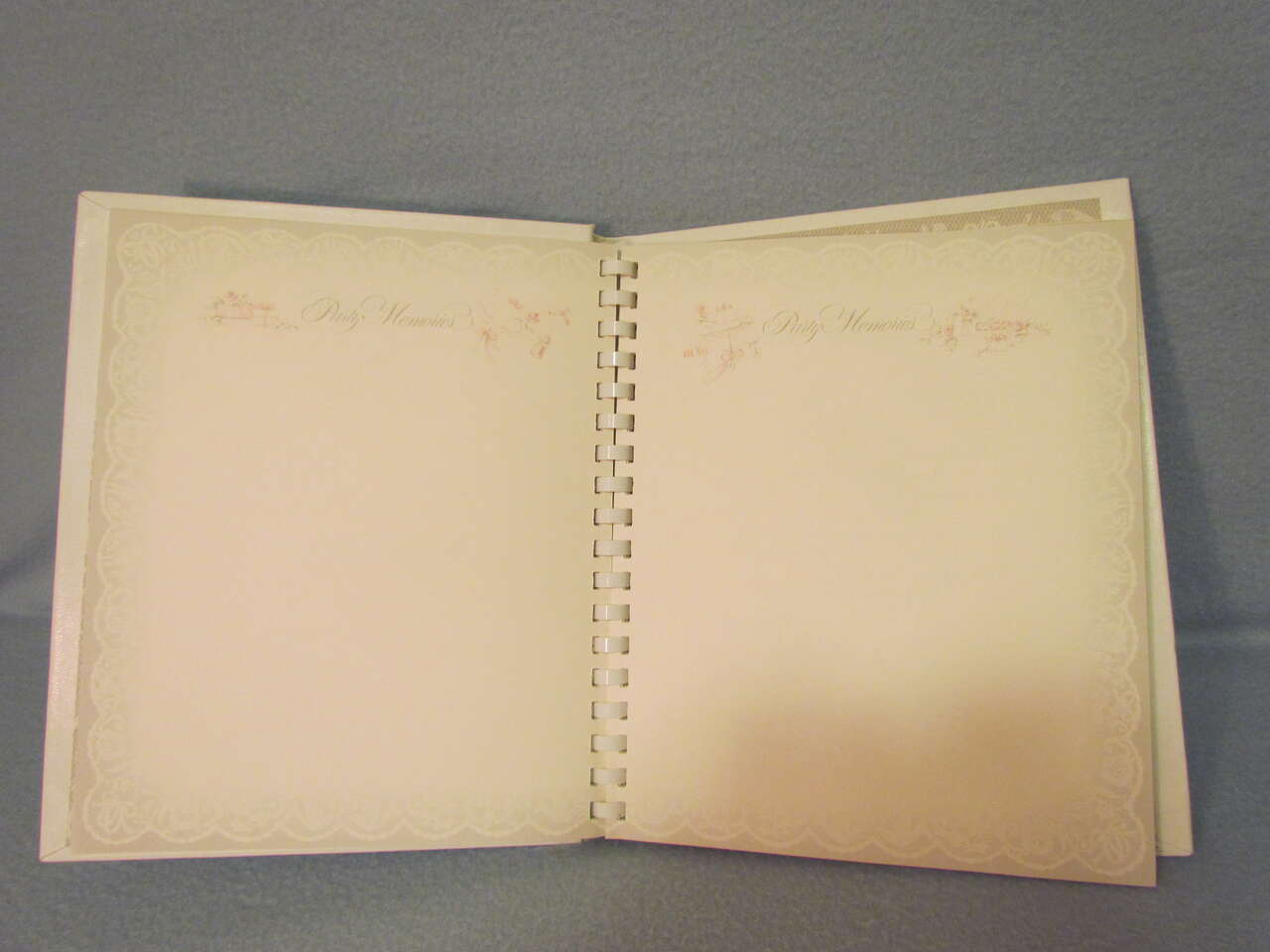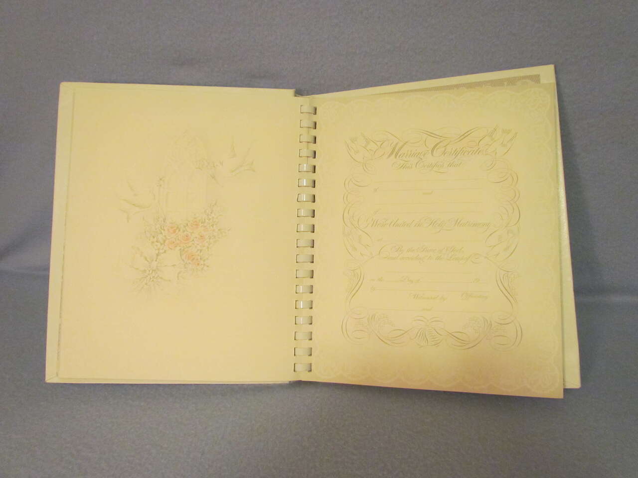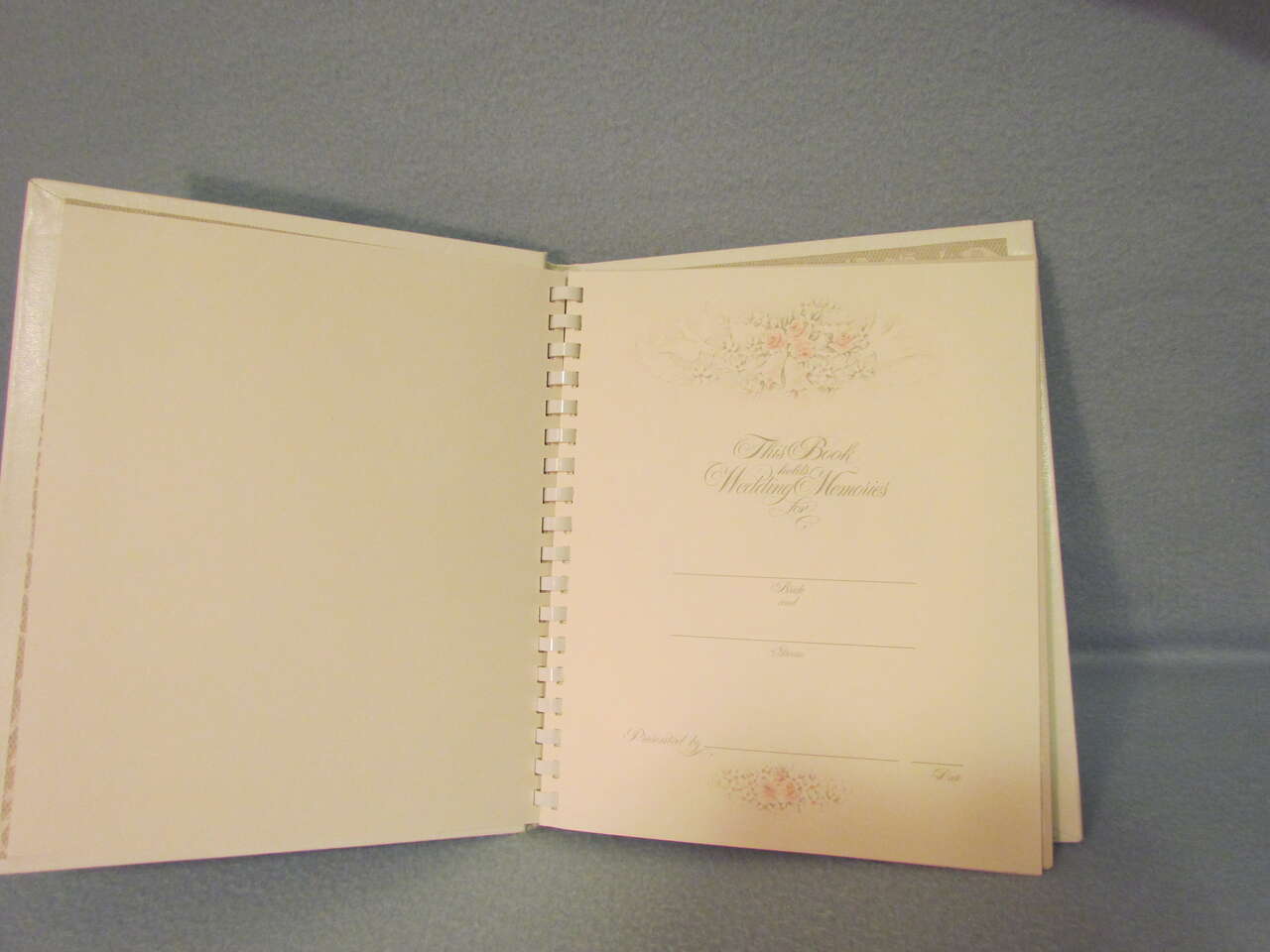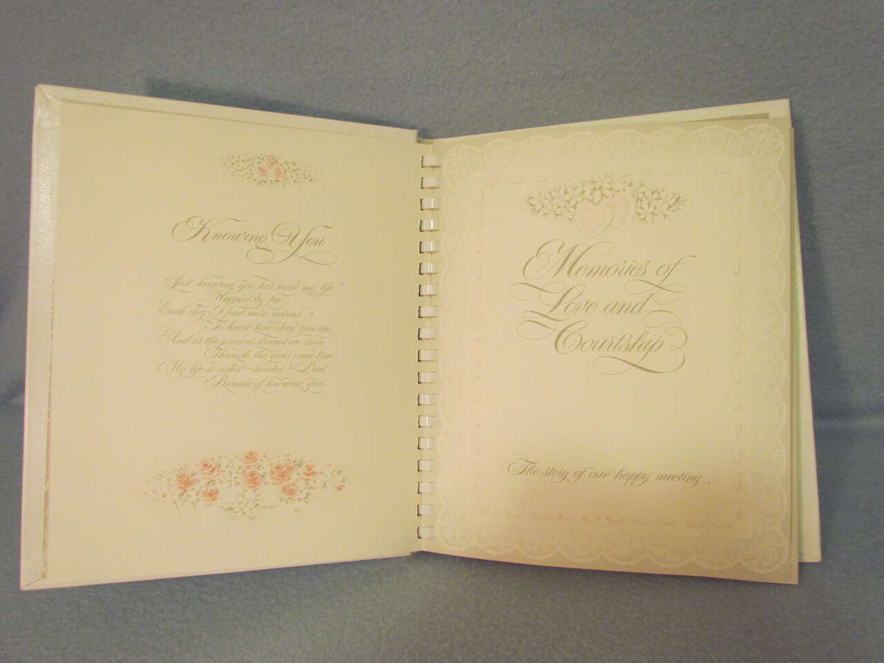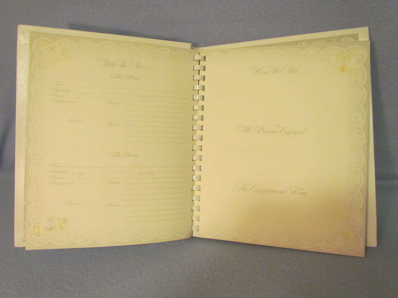 This lovely Wedding Memory Book helps you record memories and milestones of your courtship, engagement, and marriage on lovely decorative pages. This book is now out of print and a rare find. It has a hard cover with decorative doves, flowers, and wedding bells with the words “Our wedding” on the top in silver foil. It also has an oval picture frame to put your favorite wedding photo in it, thus personalizing your wedding memory book and has a comb binding. Pages are decorated with pink and yellow roses, doves, hearts, umbrellas, wedding bells, and ribbons & lace in a light greyish lace background with a touch of pink and yellow coloring it all throughout. It is timeless, elegant, and lovely.