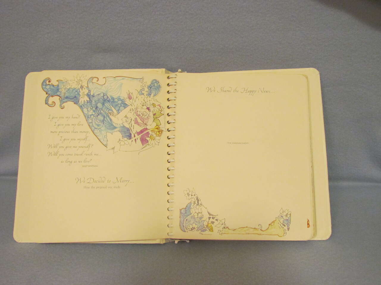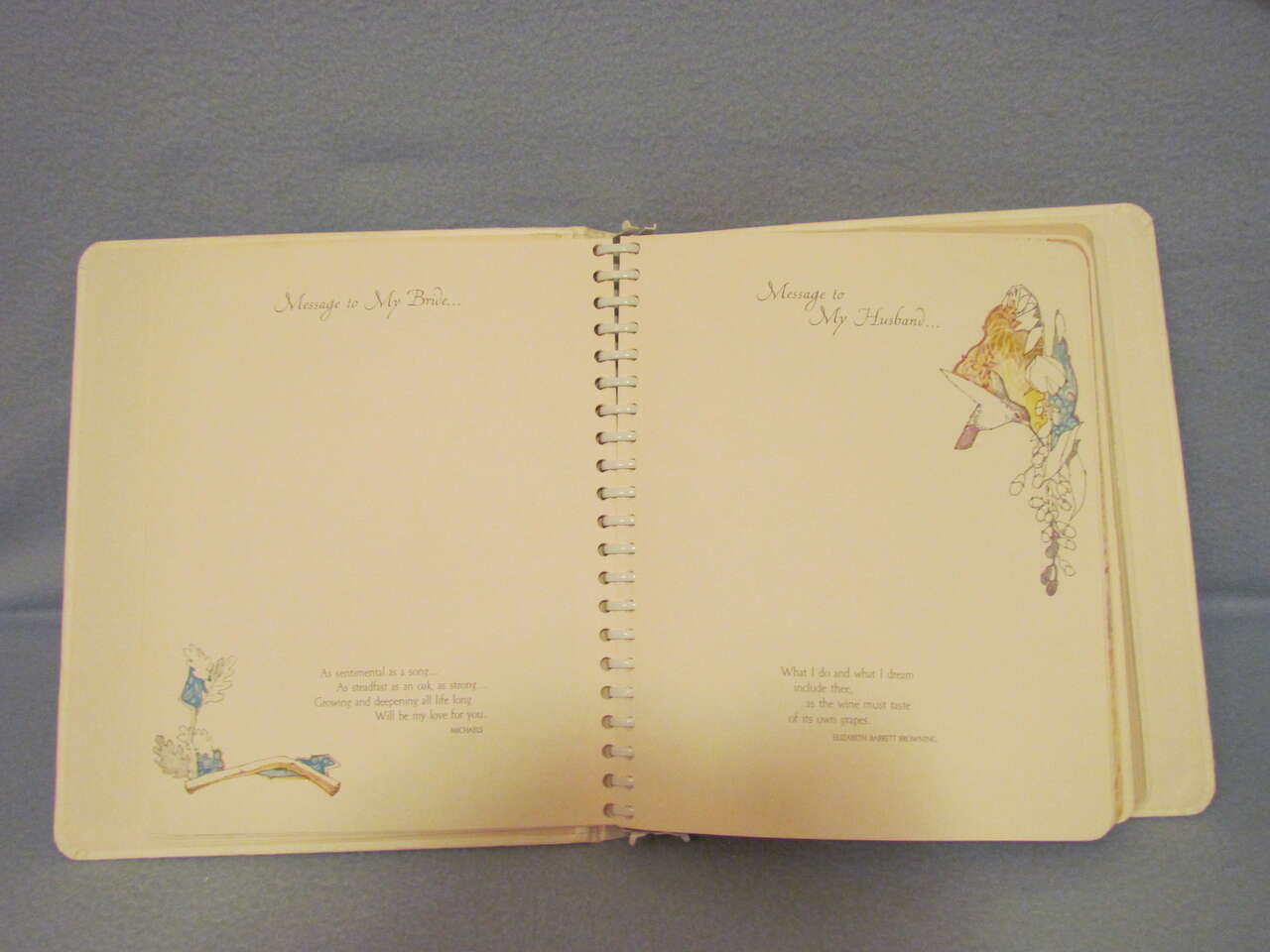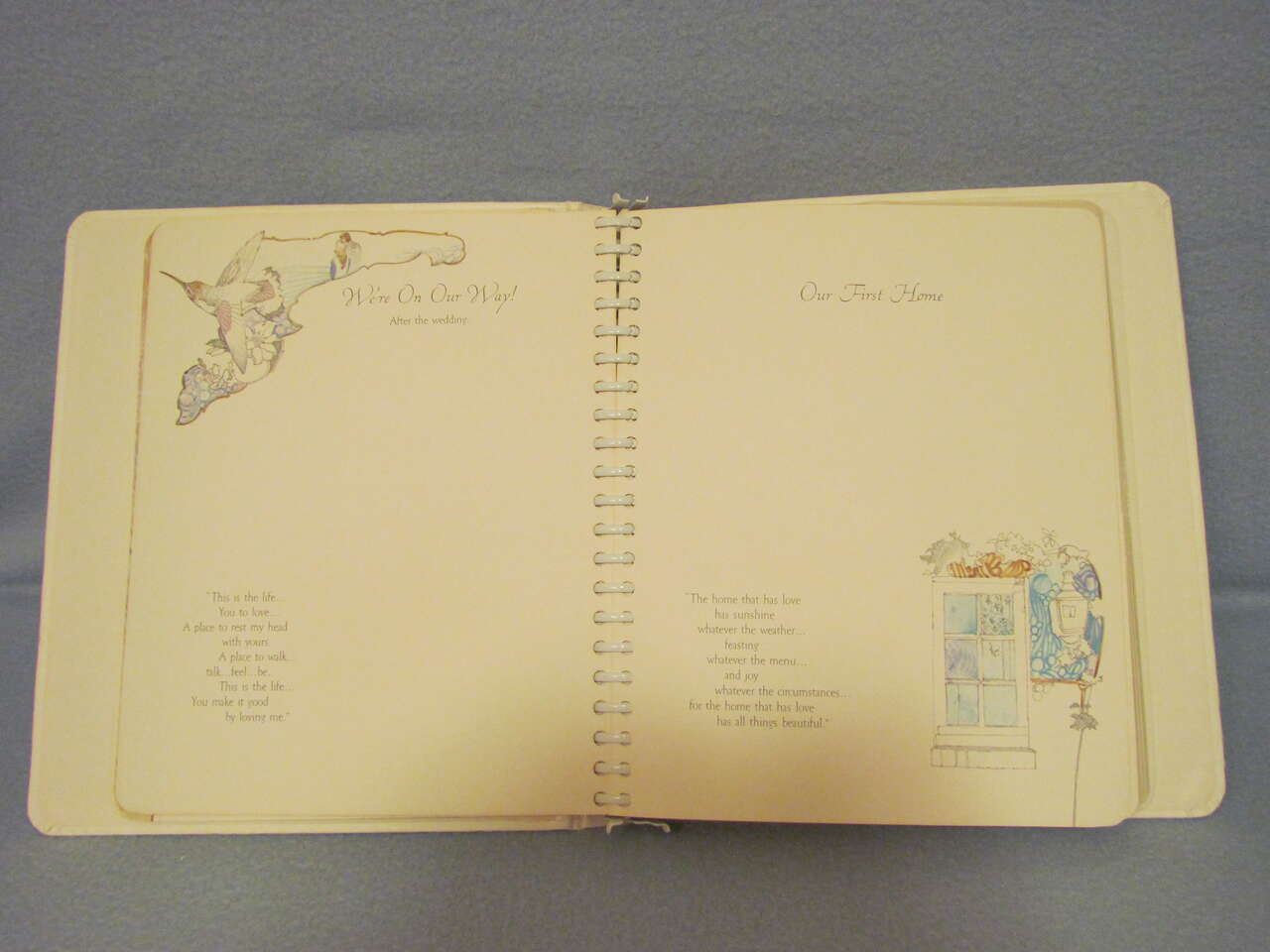 This lovely Wedding Memory Book helps you record memories and milestones of your courtship, engagement, and marriage on lovely decorative pages. This book is now out of print and a rare find. It has a padded hard cover with decorative flowers, butterfly, bird, man, and woman on the cover. Pages are illustrated by Dennis Anderson with lovely flowers, butterflies, birds, leaves, trees, and other nature scenes in blue, green, brown, pink, yellow, orange, and purple colors.
