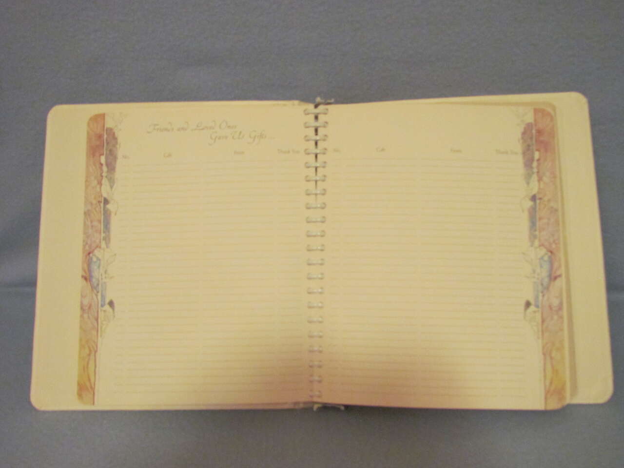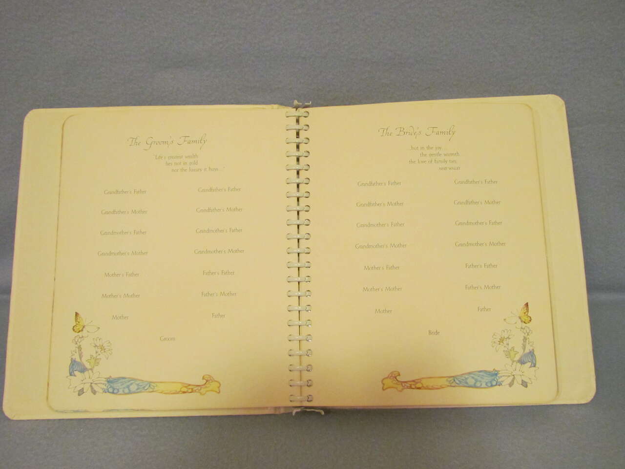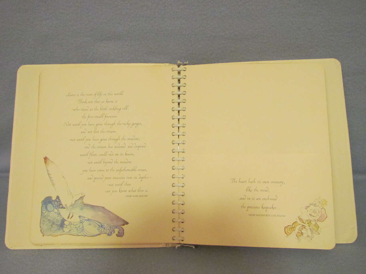 This lovely Wedding Memory Book helps you record memories and milestones of your courtship, engagement, and marriage on lovely decorative pages. This book is now out of print and a rare find. It has a padded hard cover with decorative flowers, butterfly, bird, man, and woman on the cover. Pages are illustrated by Dennis Anderson with lovely flowers, butterflies, birds, leaves, trees, and other nature scenes in blue, green, brown, pink, yellow, orange, and purple colors.