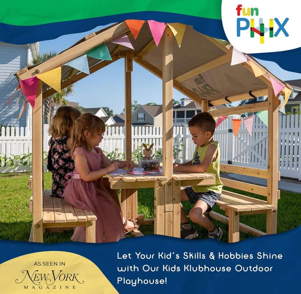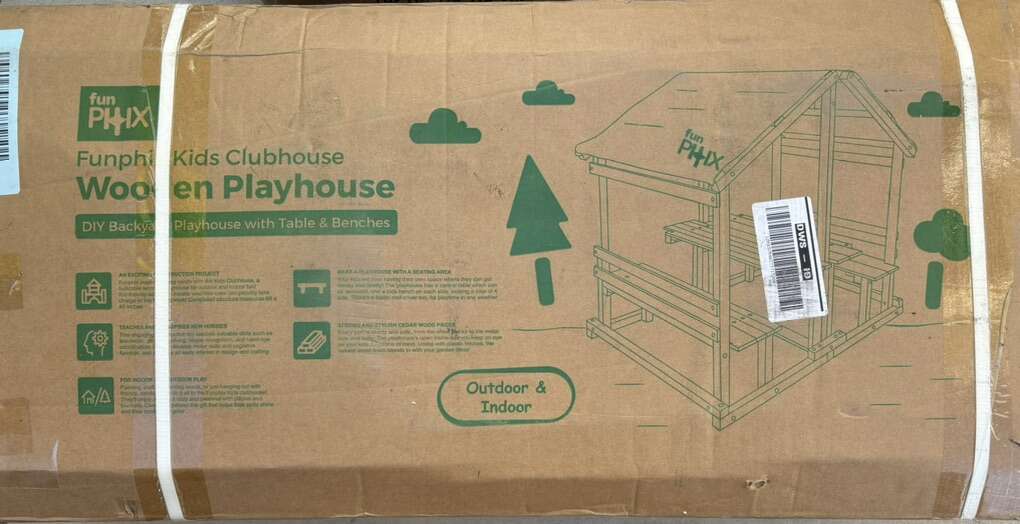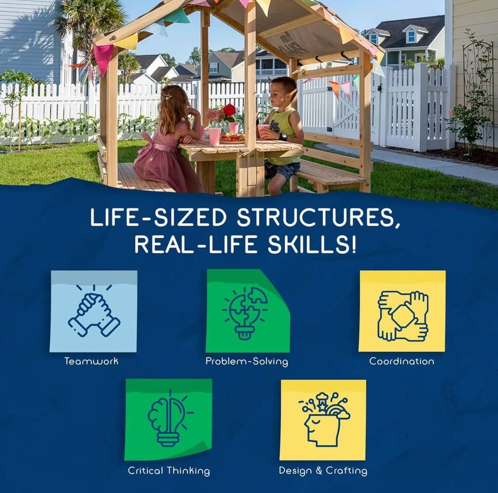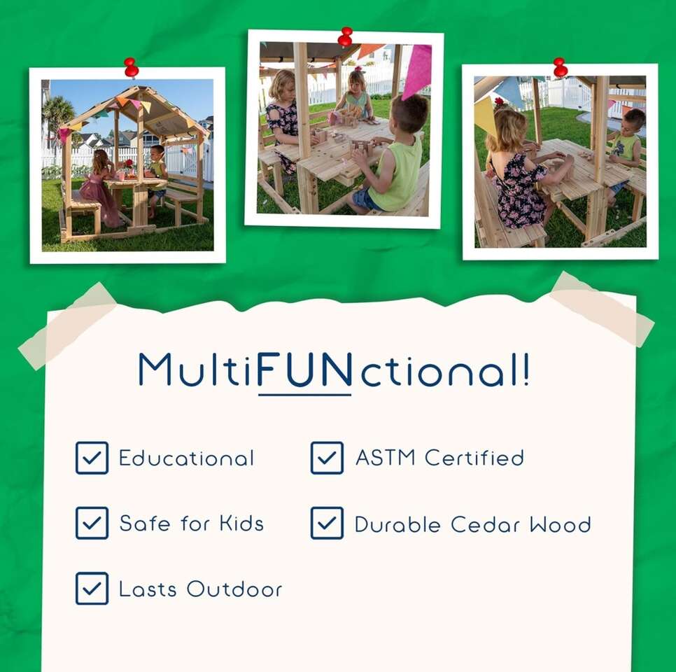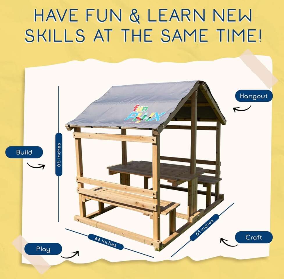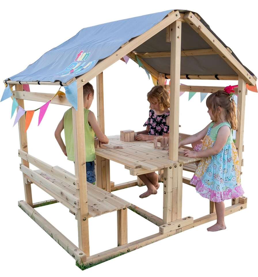 Description- DIY covered backyard playhouse with table and benches. See photos for more product information and specifications.